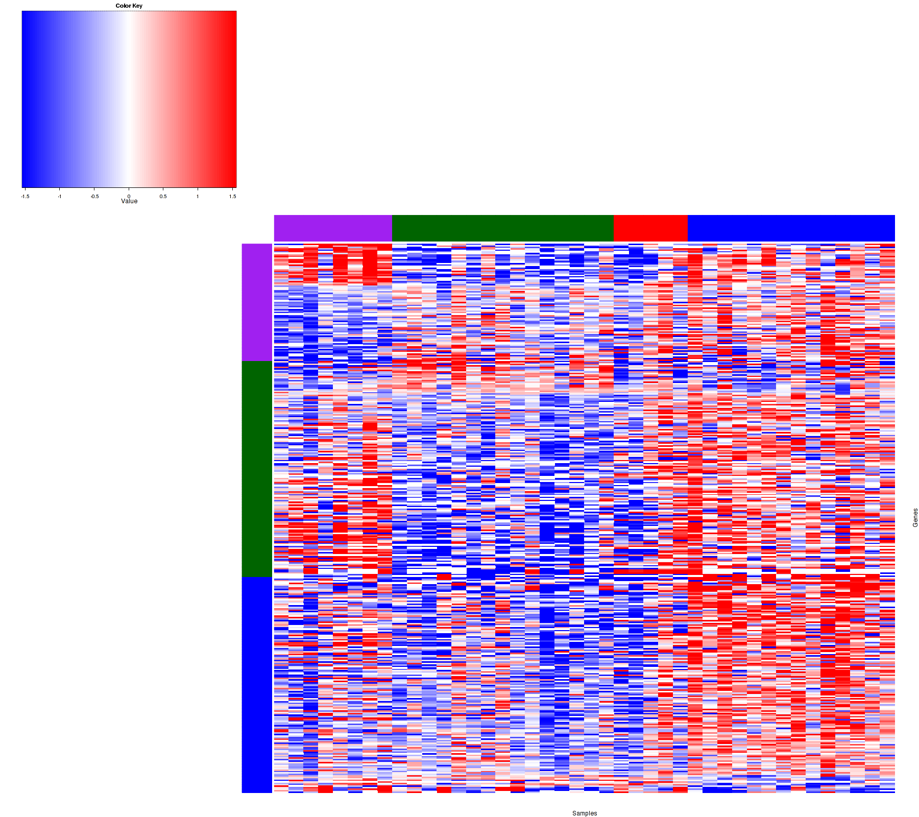 Figure 1. Get High-res Image Samples were separated into 4 clusters. Shown are 42 samples and 371 marker miRs. The color bar of the row indicates the marker miRs for the corresponding cluster.