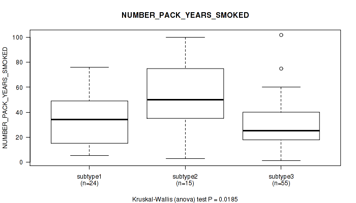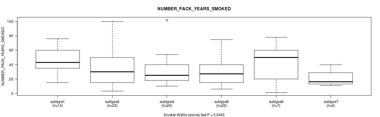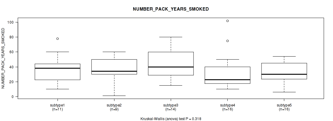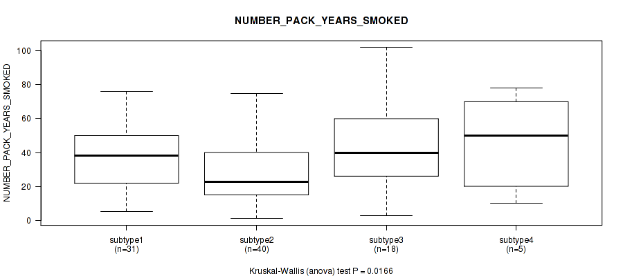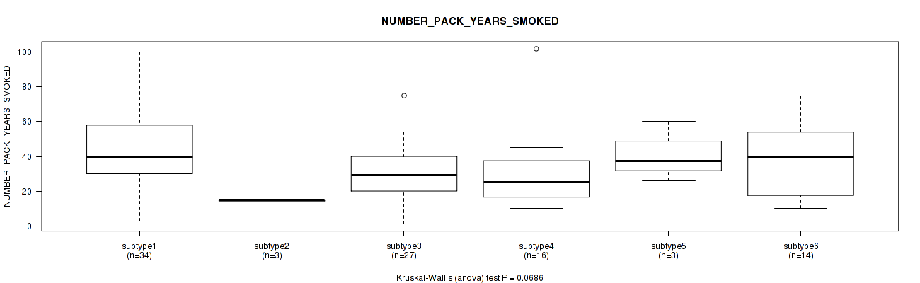 Figure S146. Get High-res Image Clustering Approach #10: 'MIRseq Mature cHierClus subtypes' versus Clinical Feature #11: 'NUMBER_PACK_YEARS_SMOKED'