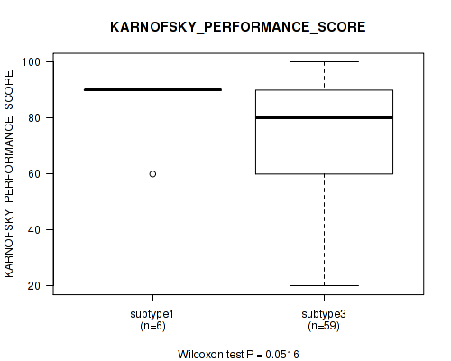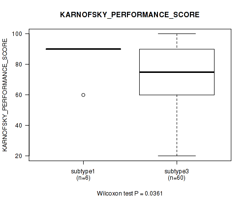 Figure S144. Get High-res Image Clustering Approach #10: 'MIRseq Mature cHierClus subtypes' versus Clinical Feature #9: 'KARNOFSKY_PERFORMANCE_SCORE'