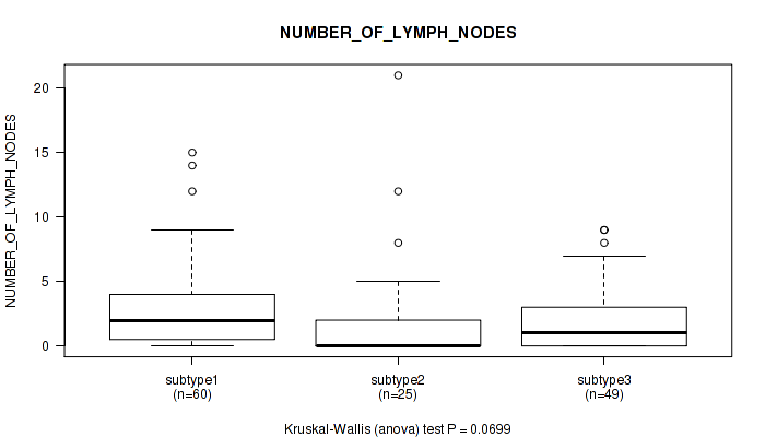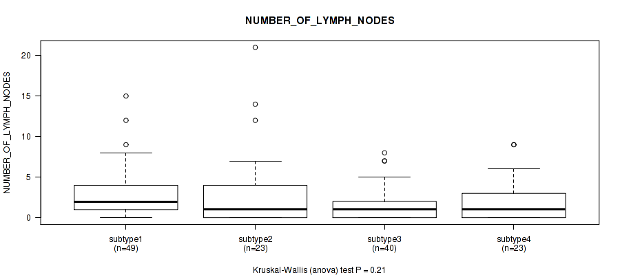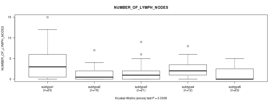 Figure S148. Get High-res Image Clustering Approach #10: 'MIRseq Mature cHierClus subtypes' versus Clinical Feature #13: 'NUMBER_OF_LYMPH_NODES'
