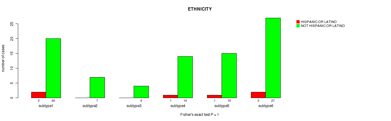 CNMF clustering analysis on sequencing-based mRNA expression data identified 6 subtypes that correlate to 'YEARS_TO_BIRTH', 'PATHOLOGIC_STAGE', 'PATHOLOGY_T_STAGE', 'RADIATION_THERAPY', 'HISTOLOGICAL_TYPE', and 'RACE'.