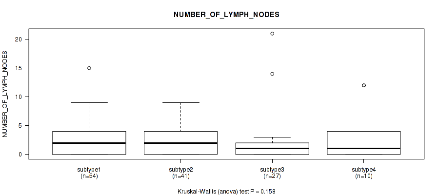 Table S158. Clustering Approach #10: 'MIRseq Mature cHierClus subtypes' versus Clinical Feature #13: 'NUMBER_OF_LYMPH_NODES'