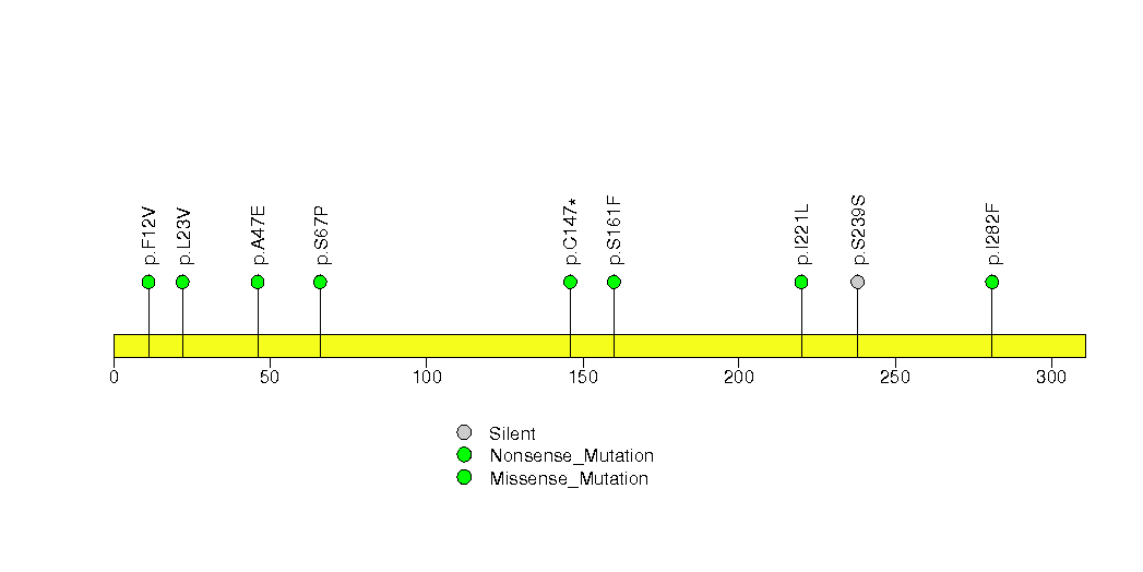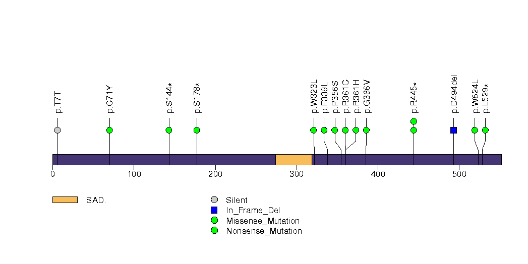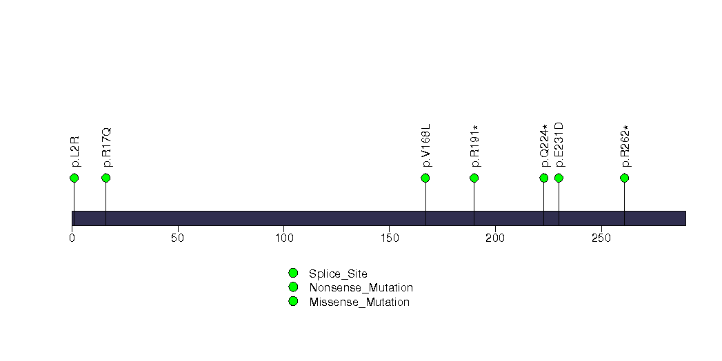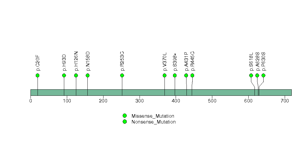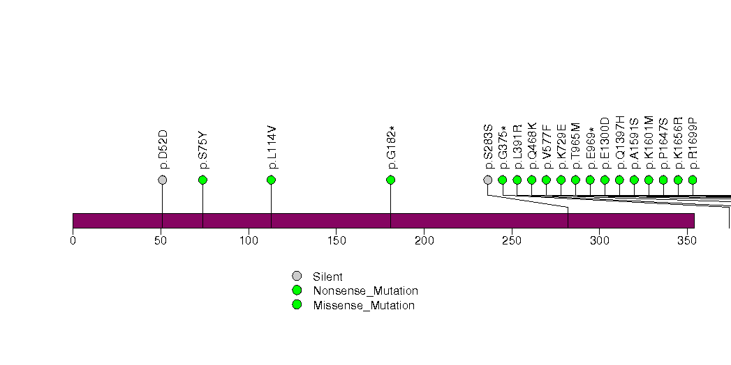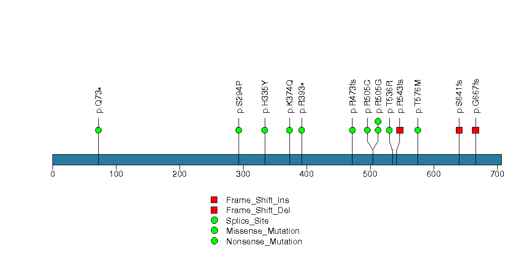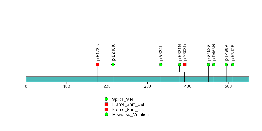 Figure S7. This figure depicts the distribution of mutations and mutation types across the TGFBR2 significant gene.