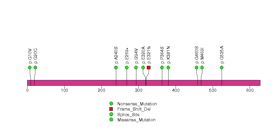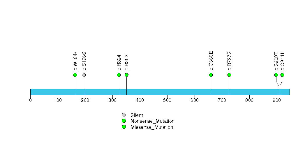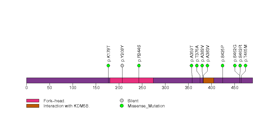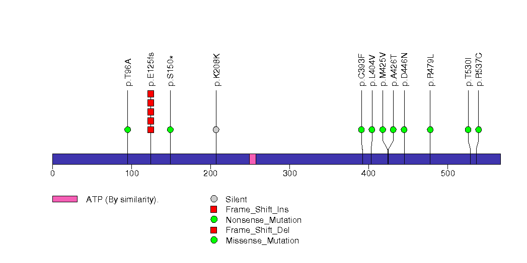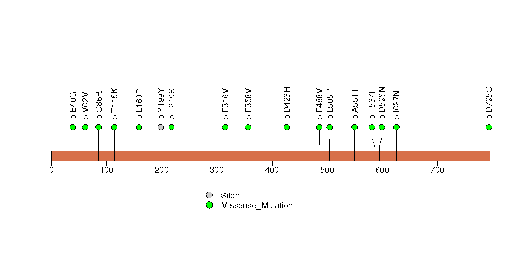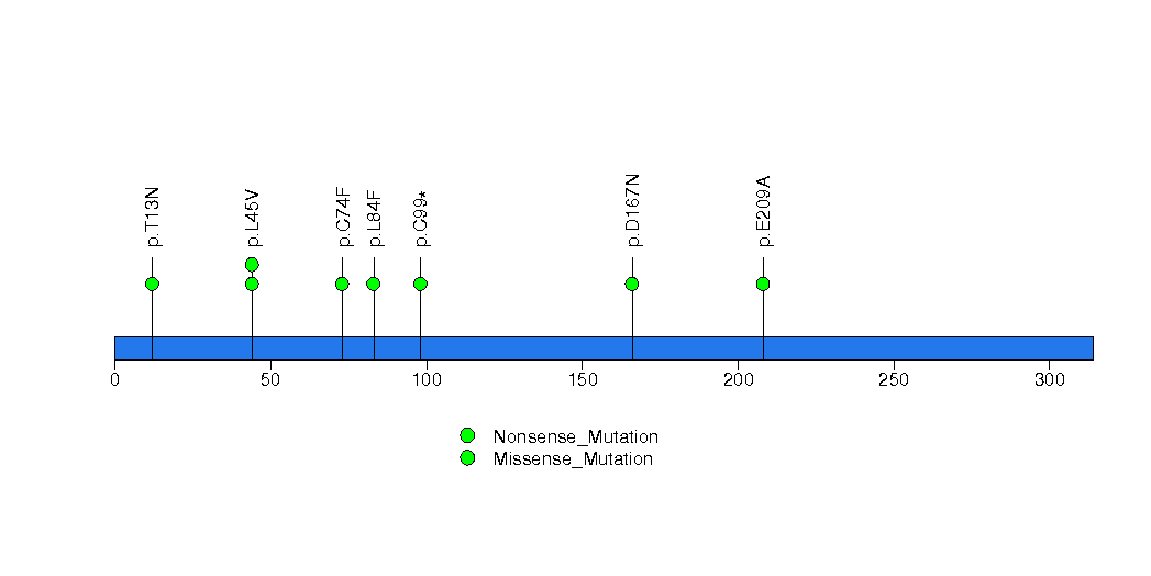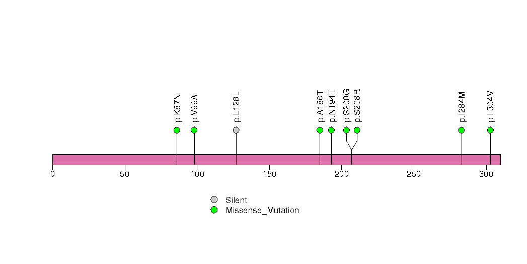 Figure S7. This figure depicts the distribution of mutations and mutation types across the TGFBR2 significant gene.