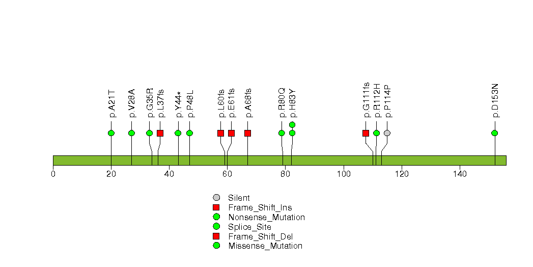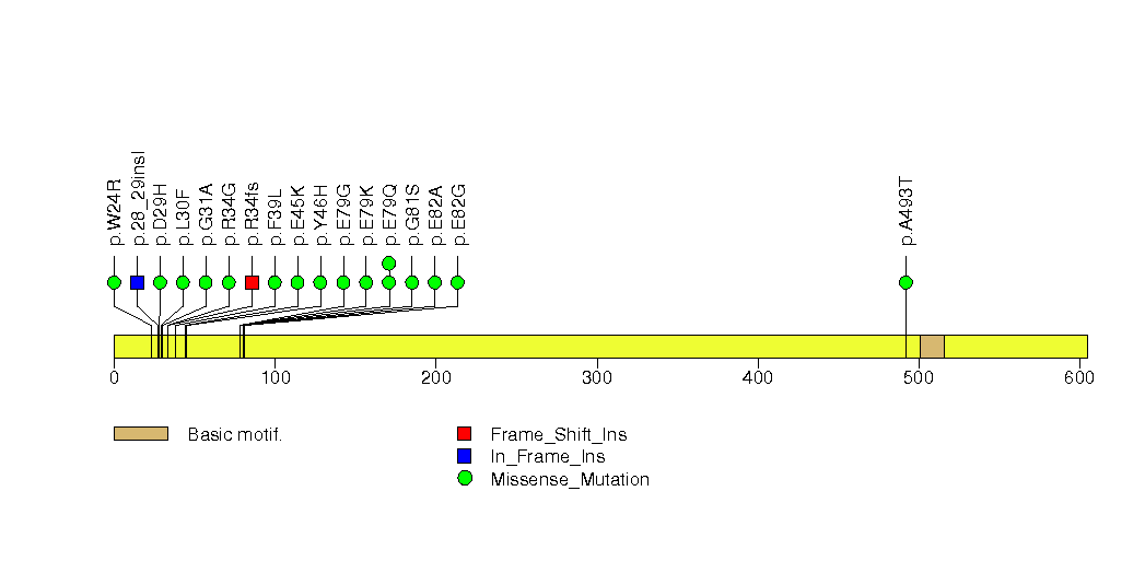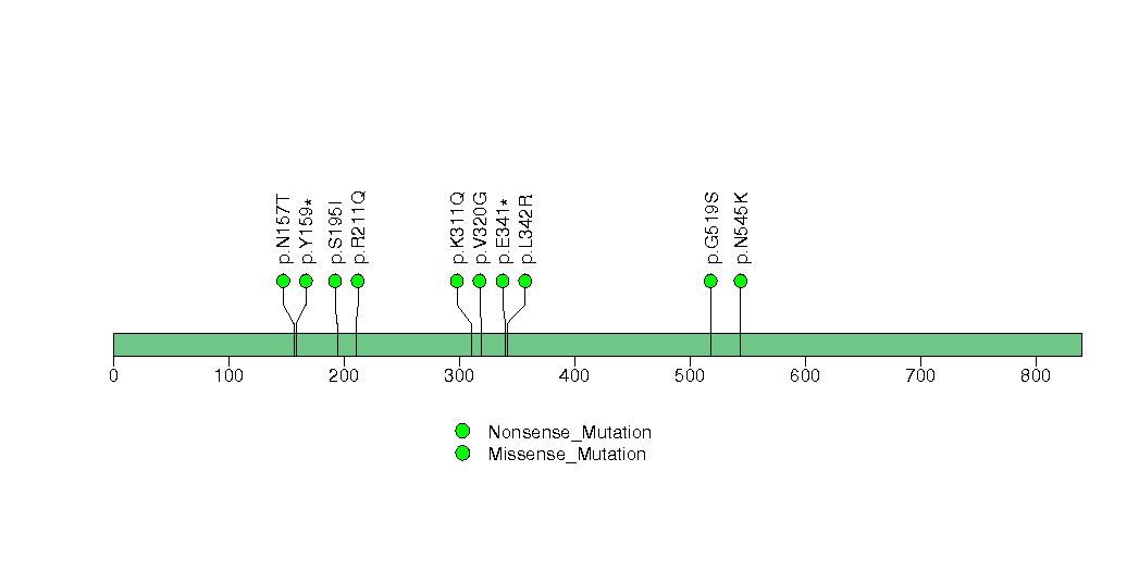 Figure S27. This figure depicts the distribution of mutations and mutation types across the GRXCR1 significant gene.