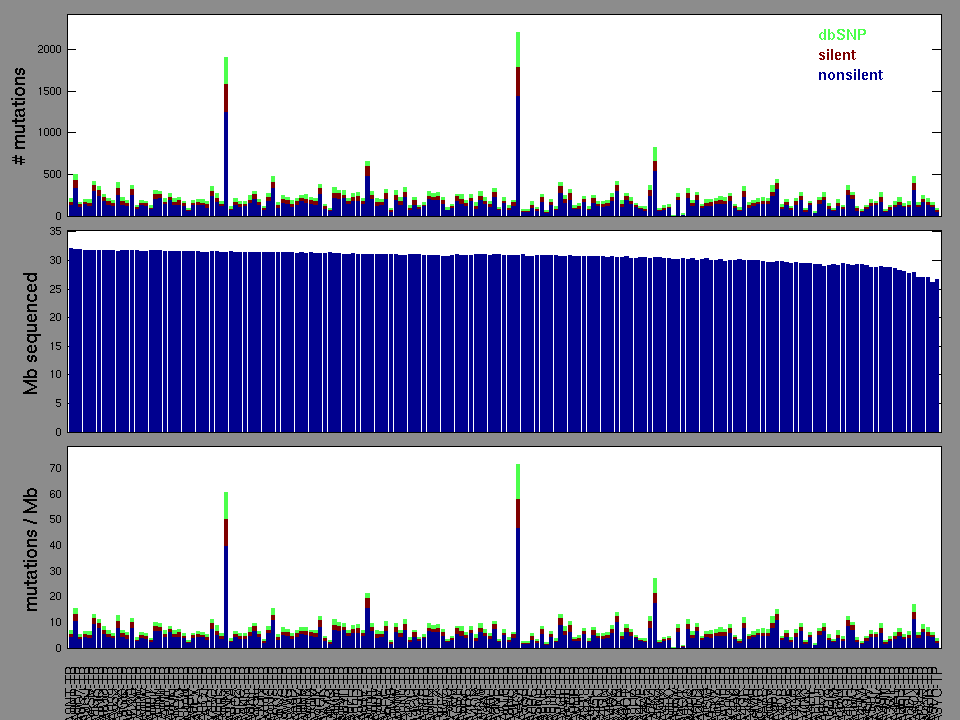 The mutation spectrum is depicted in the lego plots below in which the 96 possible mutation types are subdivided into six large blocks, color-coded to reflect the base substitution type. Each large block is further subdivided into the 16 possible pairs of 5' and 3' neighbors, as listed in the 4x4 trinucleotide context legend. The height of each block corresponds to the mutation frequency for that kind of mutation (counts of mutations normalized by the base coverage in a given bin). The shape of the spectrum is a signature for dominant mutational mechanisms in different tumor types.