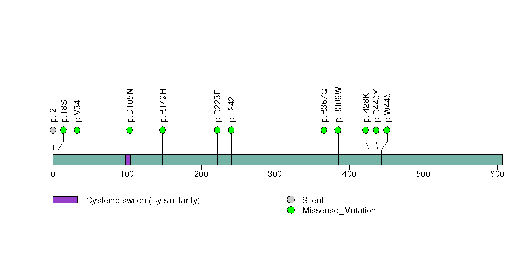 Figure S25. This figure depicts the distribution of mutations and mutation types across the DPP10 significant gene.