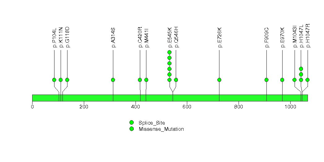 Figure S8. This figure depicts the distribution of mutations and mutation types across the PIK3CA significant gene.