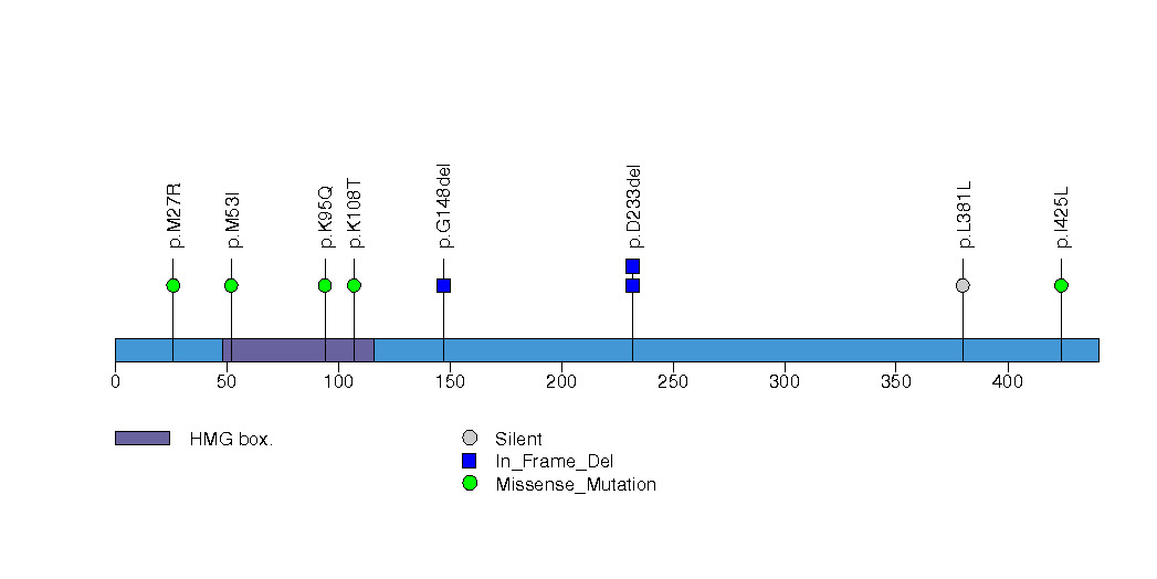 Figure S16. This figure depicts the distribution of mutations and mutation types across the SOX11 significant gene.