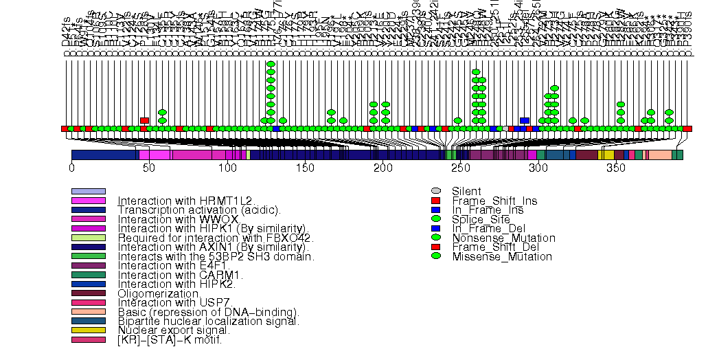 Figure S2. This figure depicts the distribution of mutations and mutation types across the TP53 significant gene.