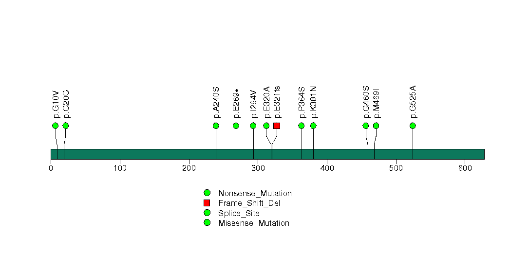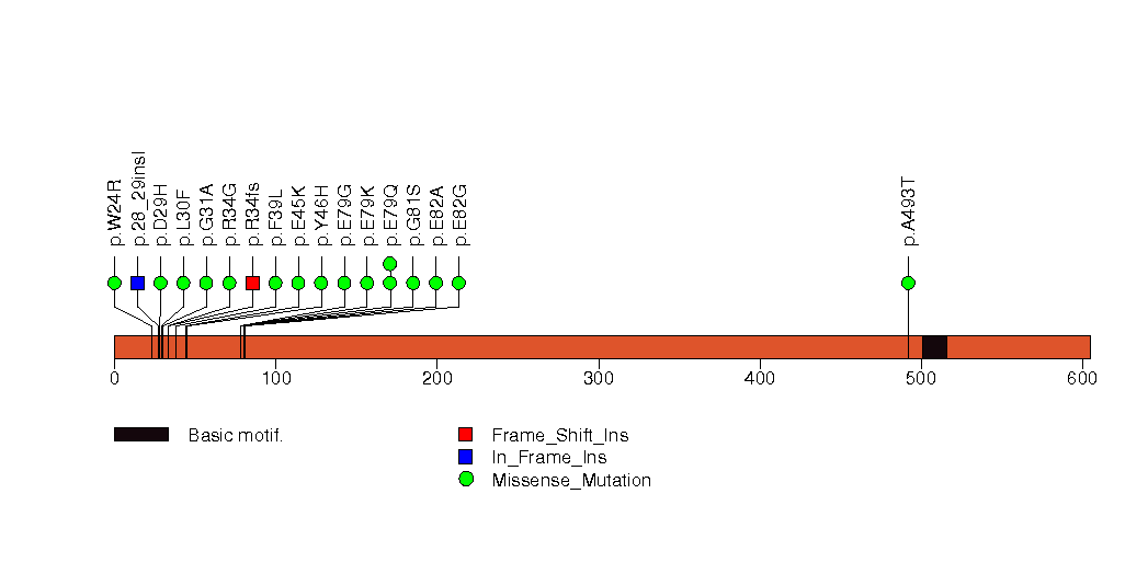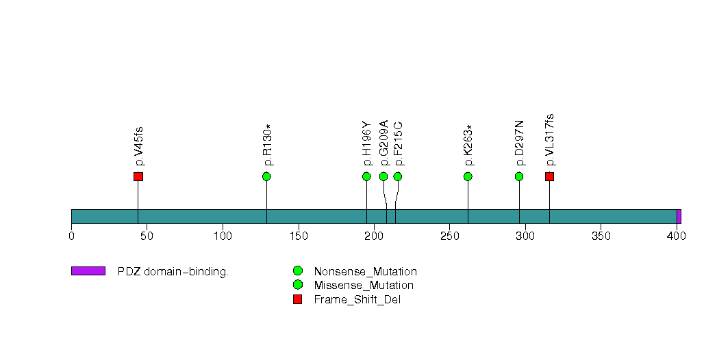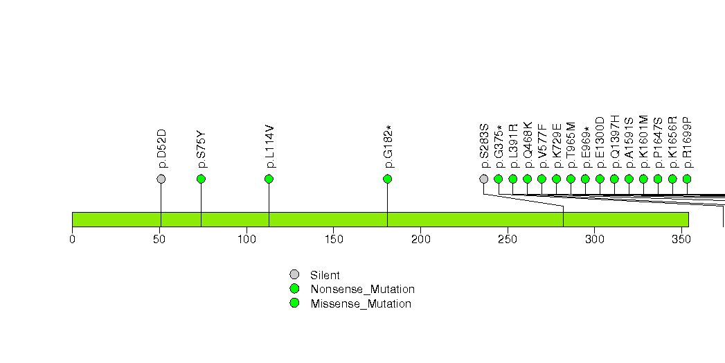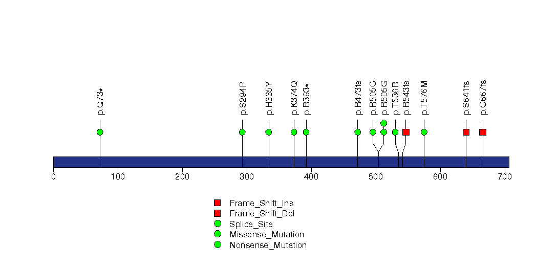 Figure S5. This figure depicts the distribution of mutations and mutation types across the TGFBR2 significant gene.