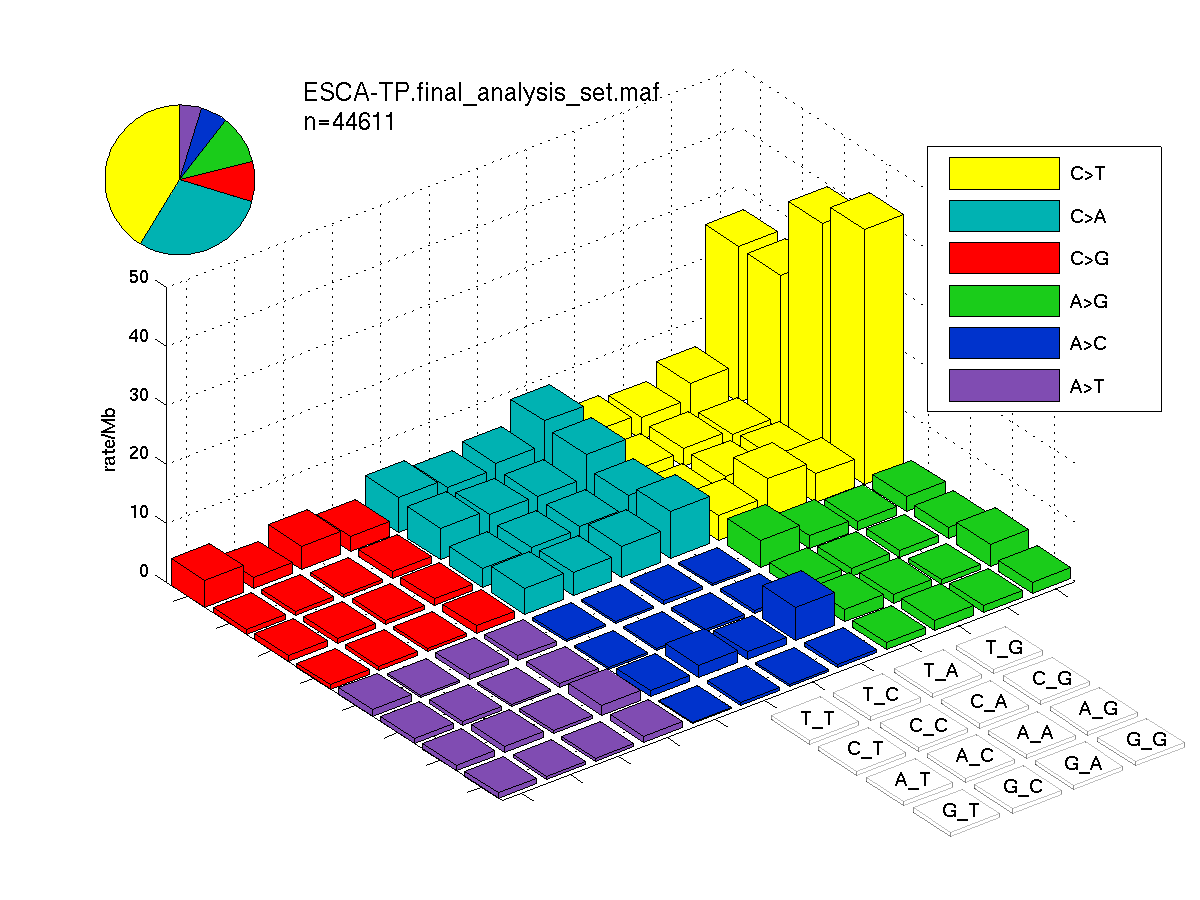 The mutation spectrum is depicted in the lego plots below in which the 96 possible mutation types are subdivided into six large blocks, color-coded to reflect the base substitution type. Each large block is further subdivided into the 16 possible pairs of 5' and 3' neighbors, as listed in the 4x4 trinucleotide context legend. The height of each block corresponds to the mutation frequency for that kind of mutation (counts of mutations normalized by the base coverage in a given bin). The shape of the spectrum is a signature for dominant mutational mechanisms in different tumor types.