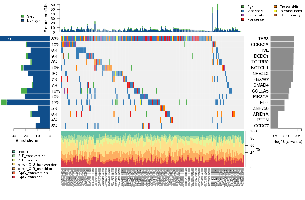 Figure 5. Get High-res Image The matrix in the center of the figure represents individual mutations in patient samples, color-coded by type of mutation, for the significantly mutated genes. The rate of synonymous and non-synonymous mutations is displayed at the top of the matrix. The barplot on the left of the matrix shows the number of mutations in each gene. The percentages represent the fraction of tumors with at least one mutation in the specified gene. The barplot to the right of the matrix displays the q-values for the most significantly mutated genes. The purple boxplots below the matrix (only displayed if required columns are present in the provided MAF) represent the distributions of allelic fractions observed in each sample. The plot at the bottom represents the base substitution distribution of individual samples, using the same categories that were used to calculate significance.