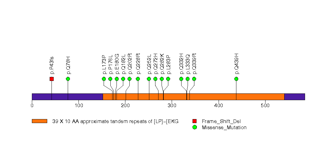 Figure S10. This figure depicts the distribution of mutations and mutation types across the COL6A5 significant gene.