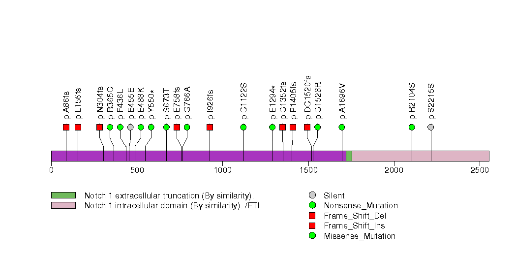Figure S6. This figure depicts the distribution of mutations and mutation types across the NOTCH1 significant gene.