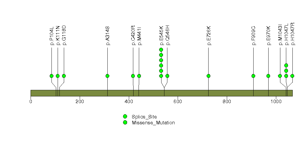 Figure S11. This figure depicts the distribution of mutations and mutation types across the PIK3CA significant gene.