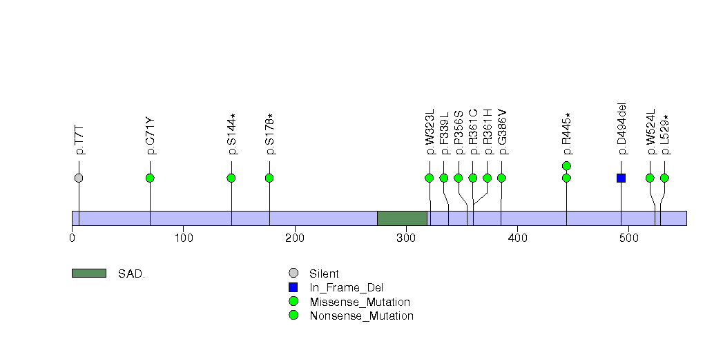 Figure S16. This figure depicts the distribution of mutations and mutation types across the CCDC7 significant gene.