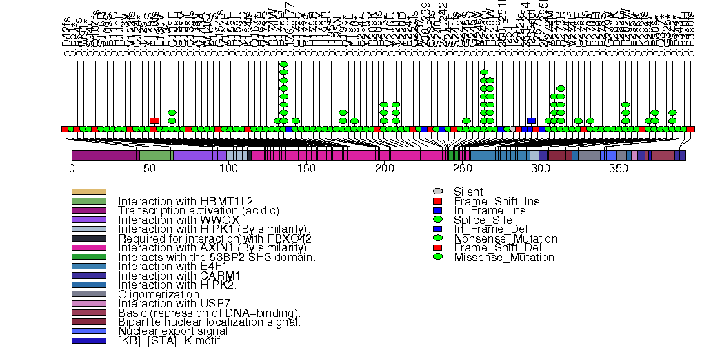Figure S1. This figure depicts the distribution of mutations and mutation types across the TP53 significant gene.