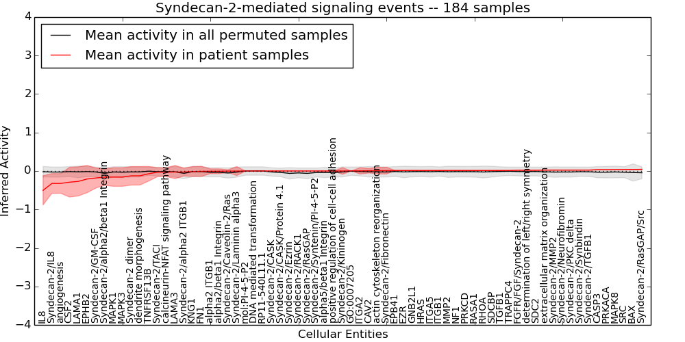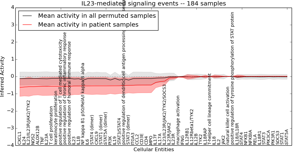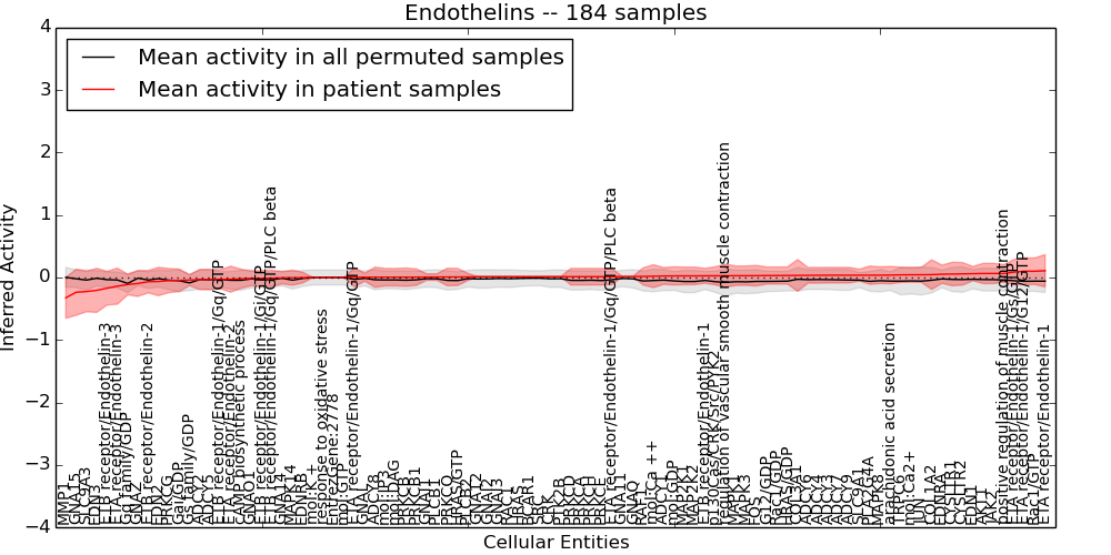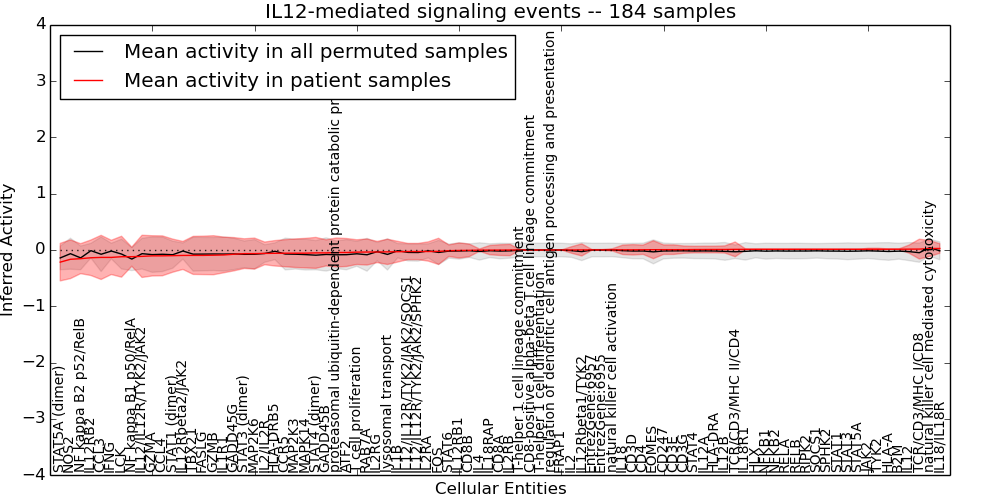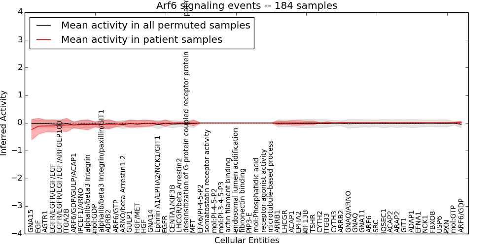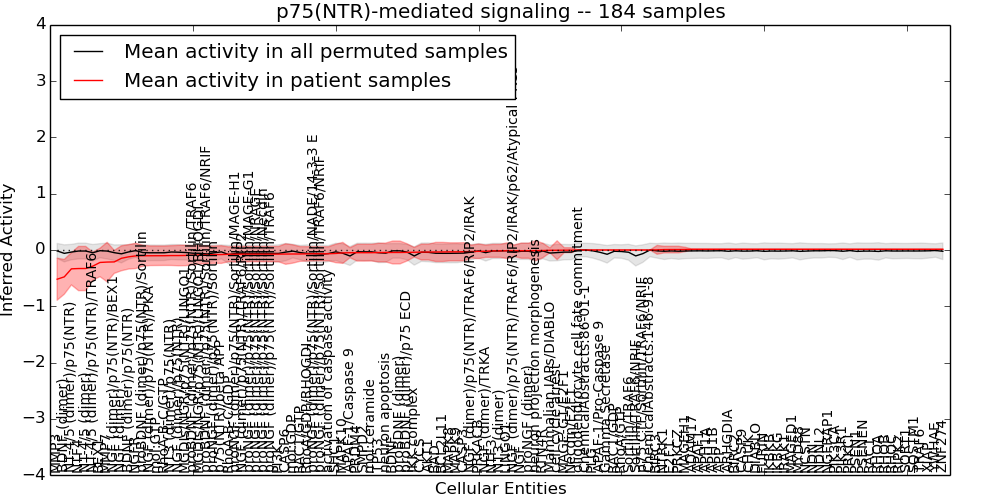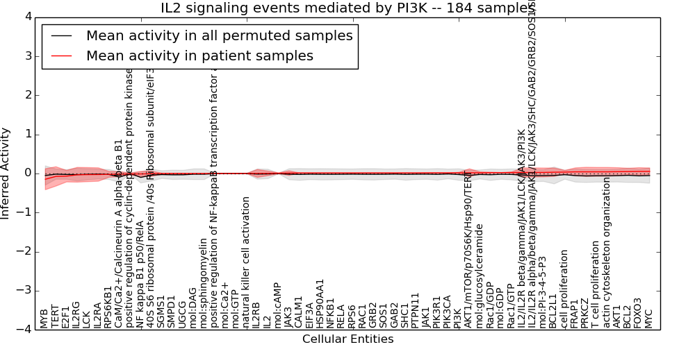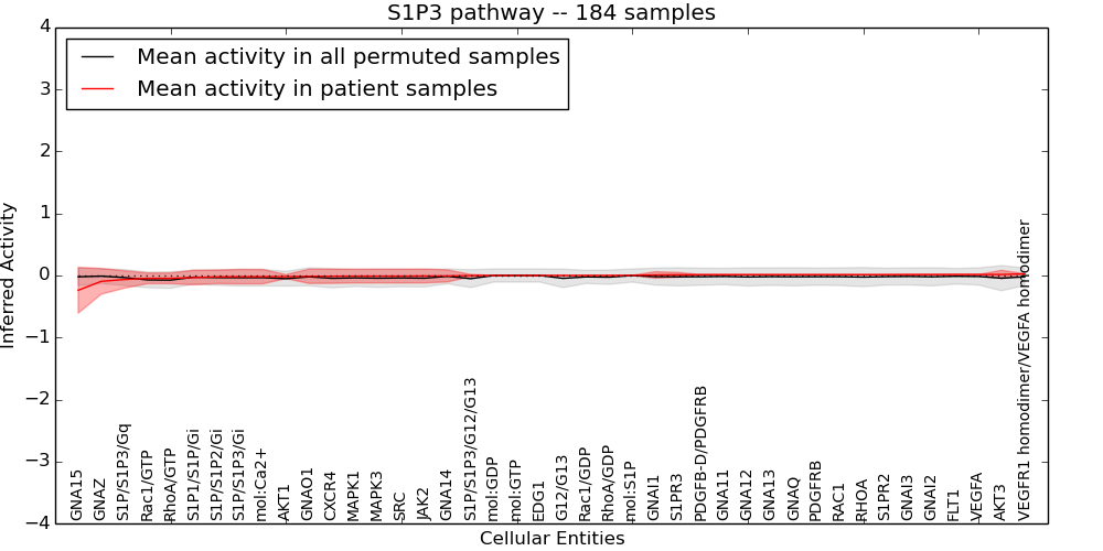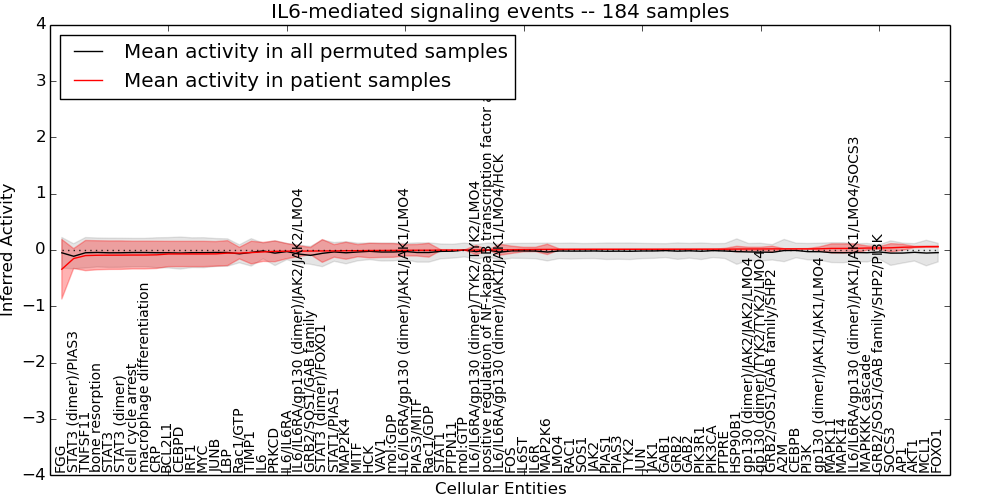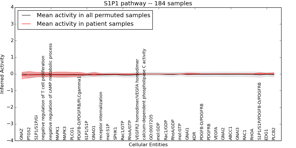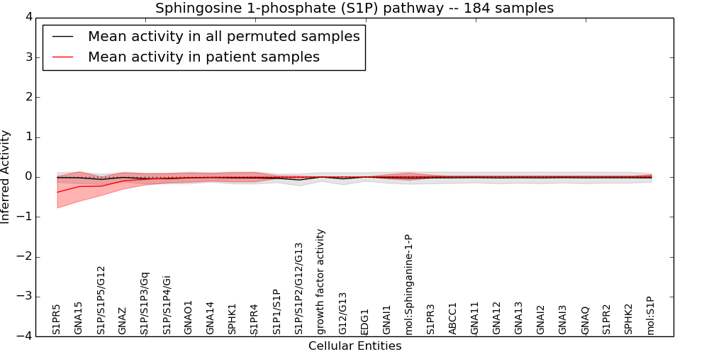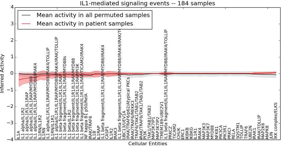 Figure S131. Get High-res Image This plot shows pathway concept perturbations across all samples against a permutation model. The concepts along the x-axis are sorted by lowest to highest mean activity for the real patient samples. Mean inferred activities are plotted along the y-axis as a colored band showing the average level and one standard deviation range. Real samples are shown in red and permuted samples in black.