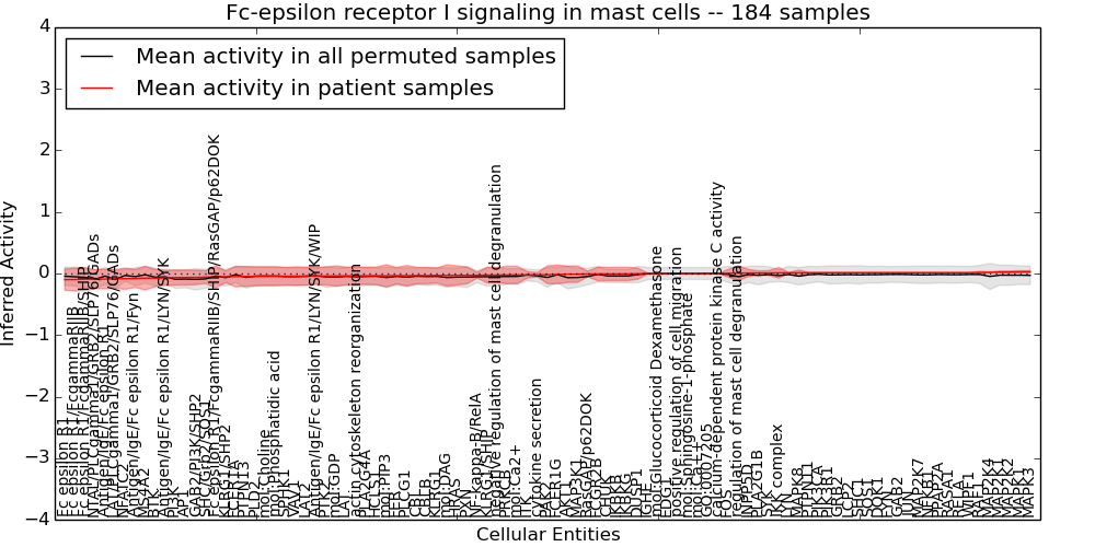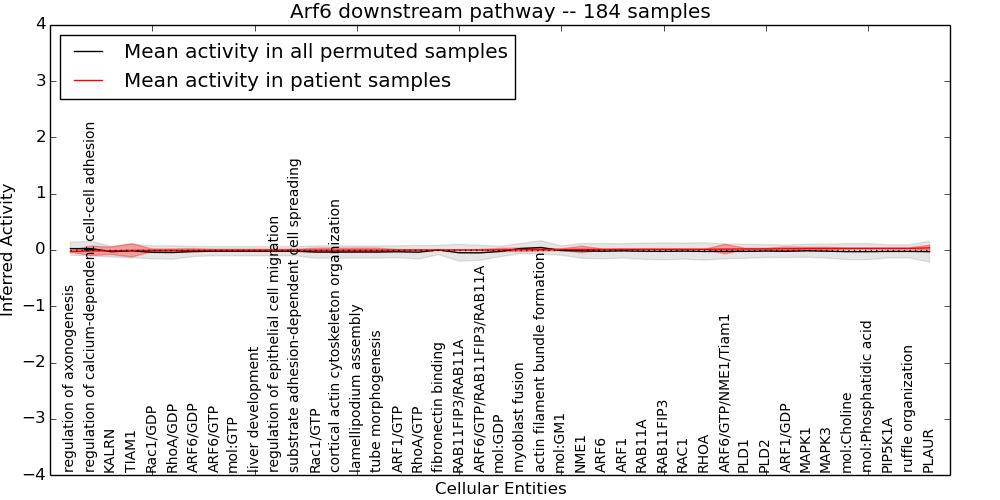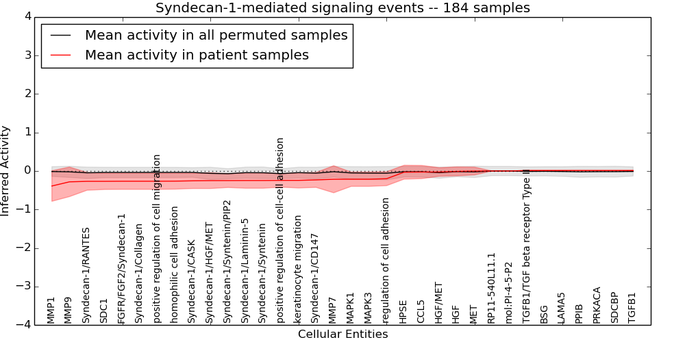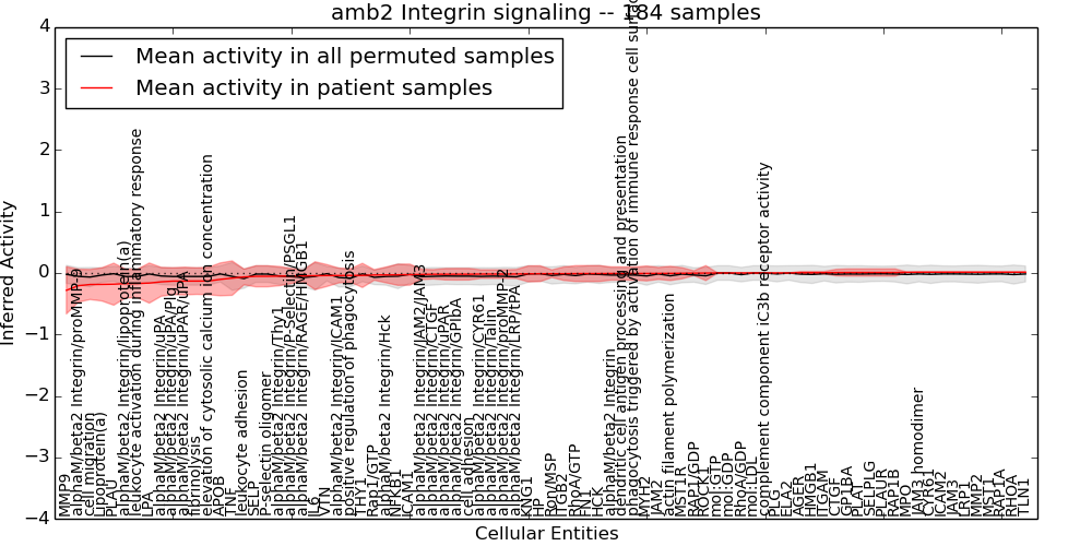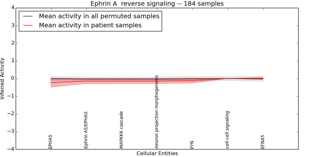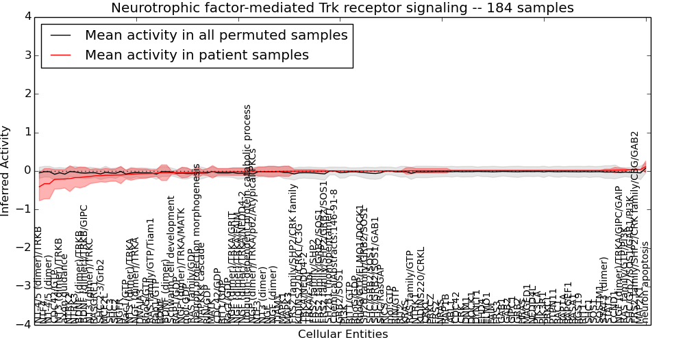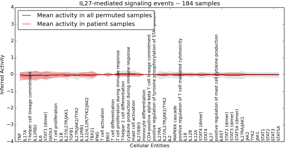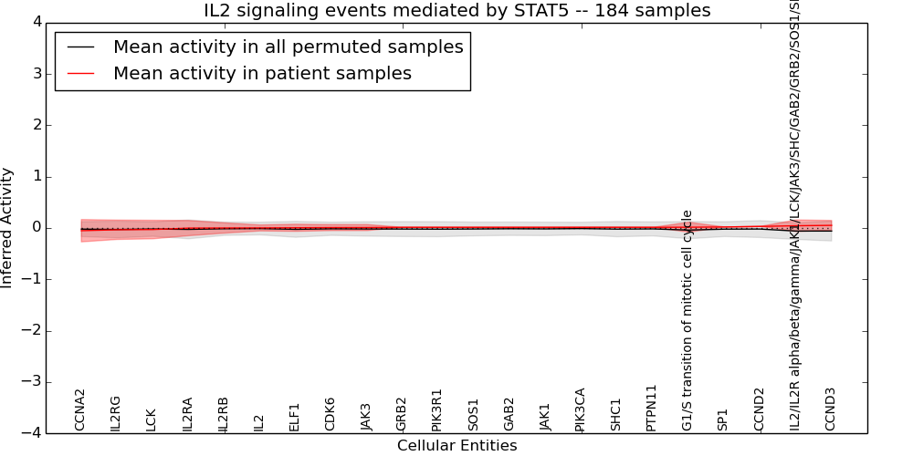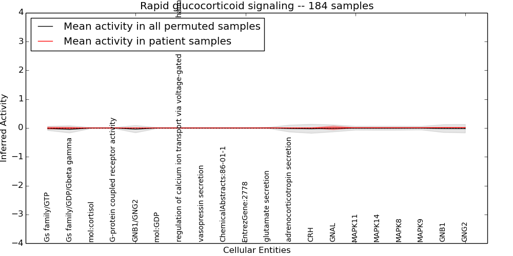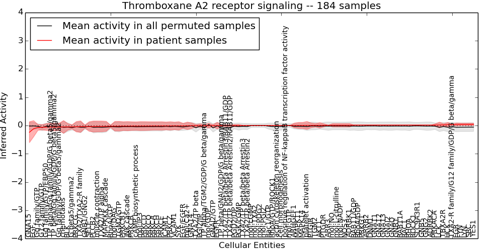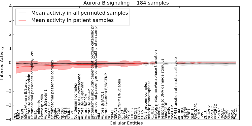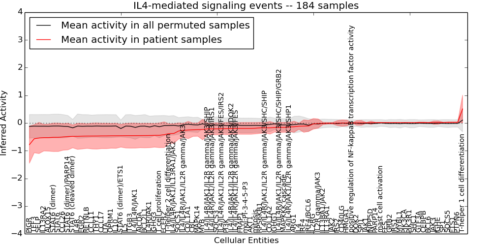 Figure S131. Get High-res Image This plot shows pathway concept perturbations across all samples against a permutation model. The concepts along the x-axis are sorted by lowest to highest mean activity for the real patient samples. Mean inferred activities are plotted along the y-axis as a colored band showing the average level and one standard deviation range. Real samples are shown in red and permuted samples in black.