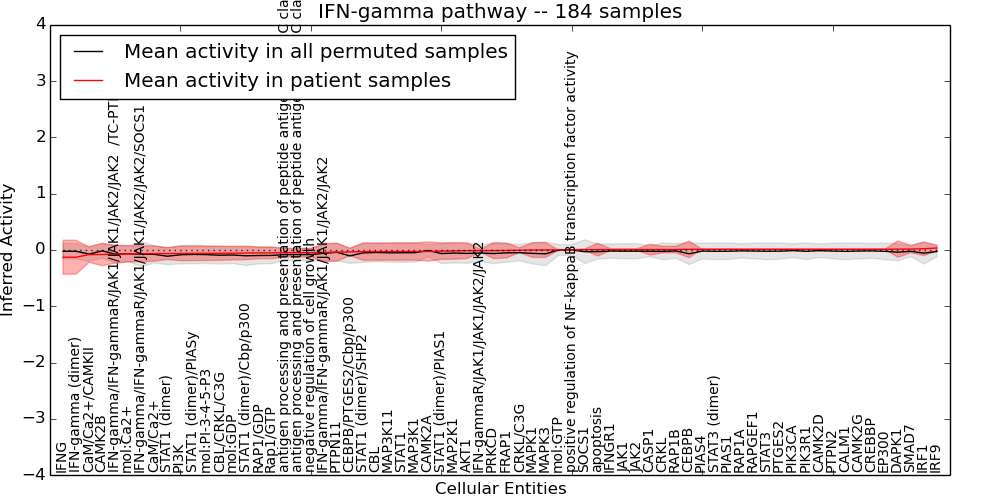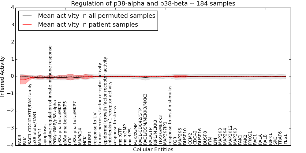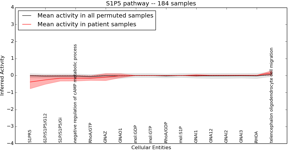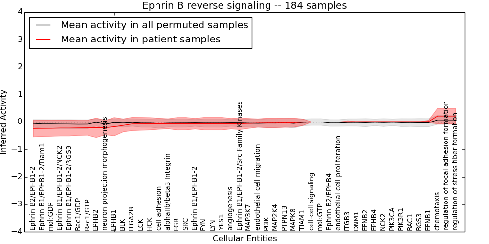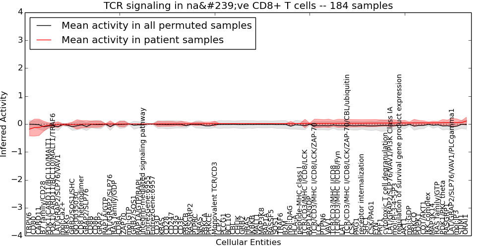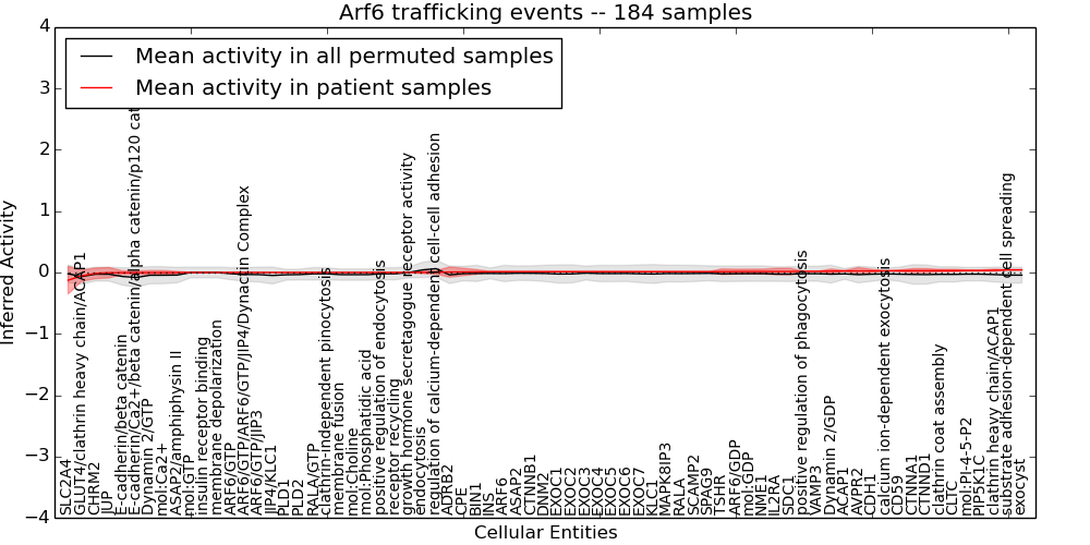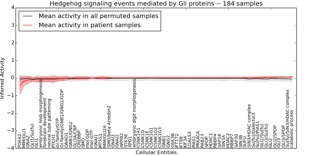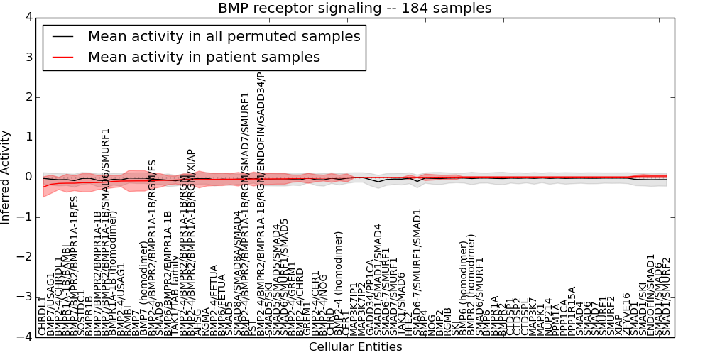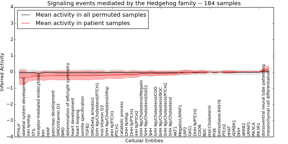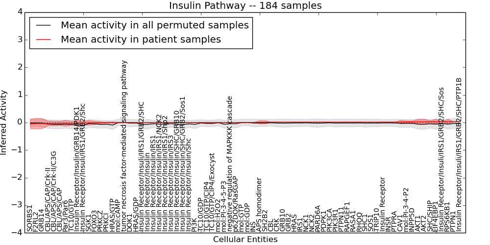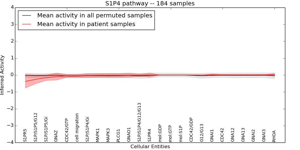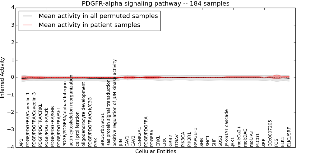 Figure S131. Get High-res Image This plot shows pathway concept perturbations across all samples against a permutation model. The concepts along the x-axis are sorted by lowest to highest mean activity for the real patient samples. Mean inferred activities are plotted along the y-axis as a colored band showing the average level and one standard deviation range. Real samples are shown in red and permuted samples in black.
