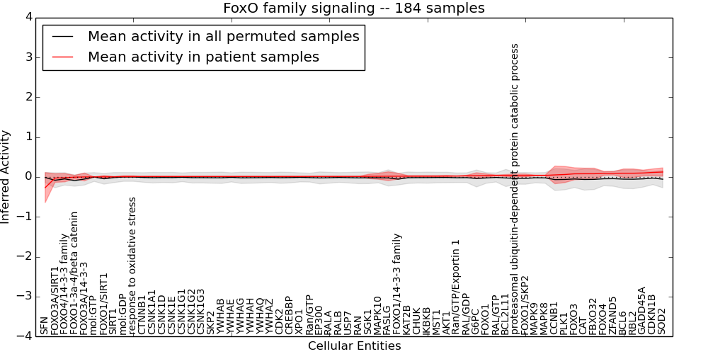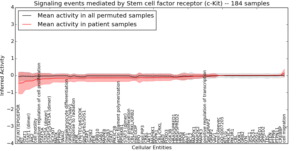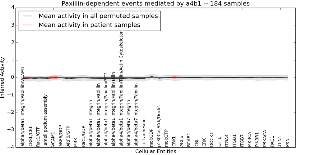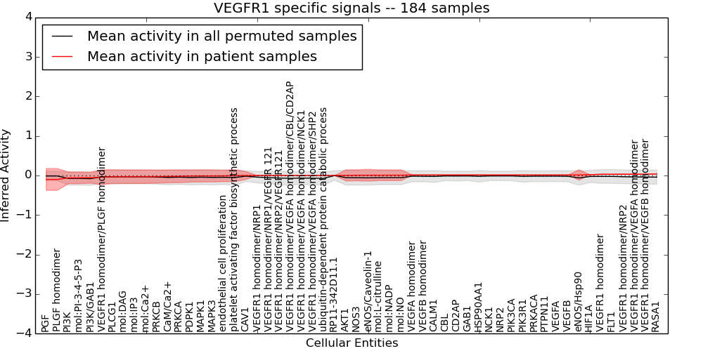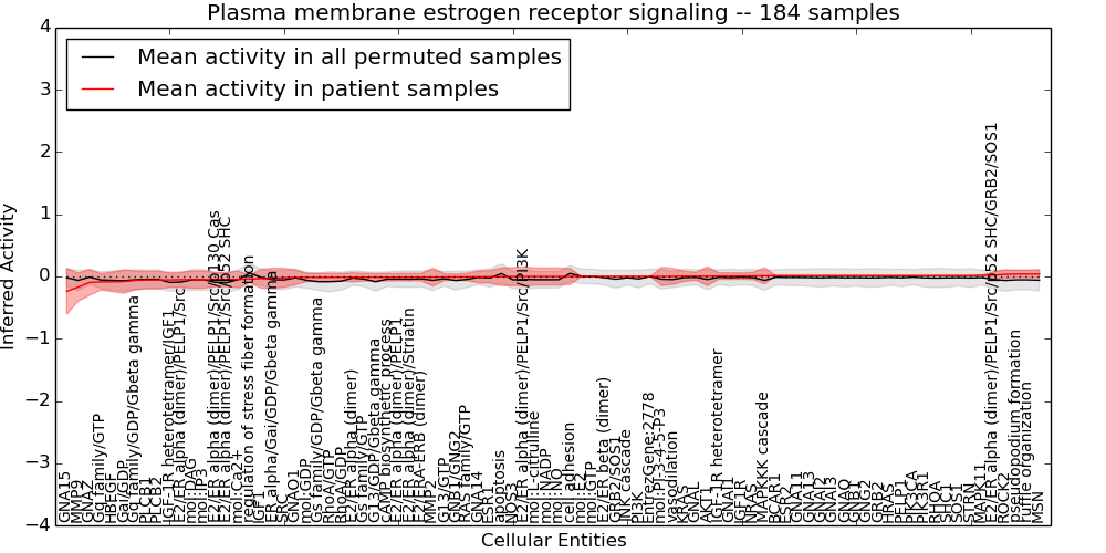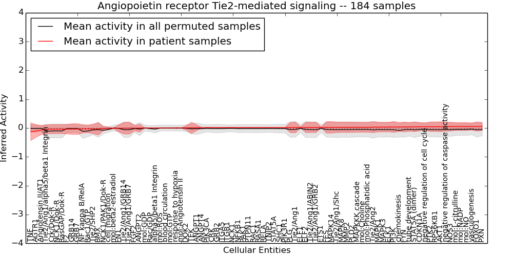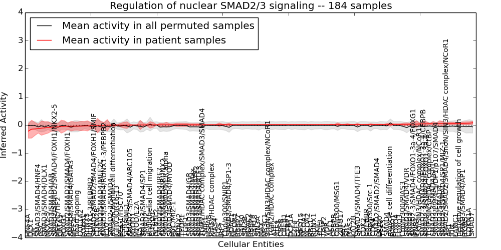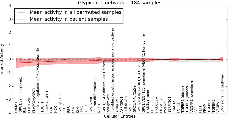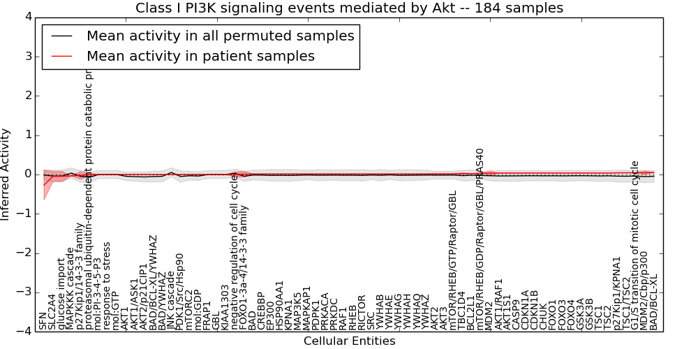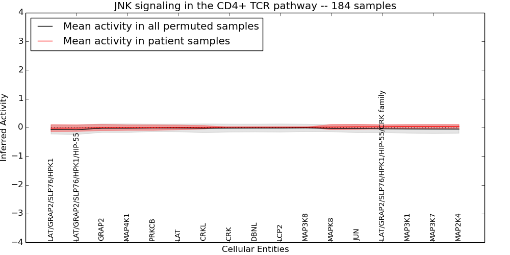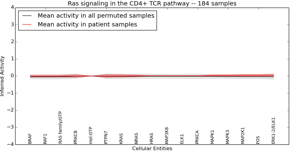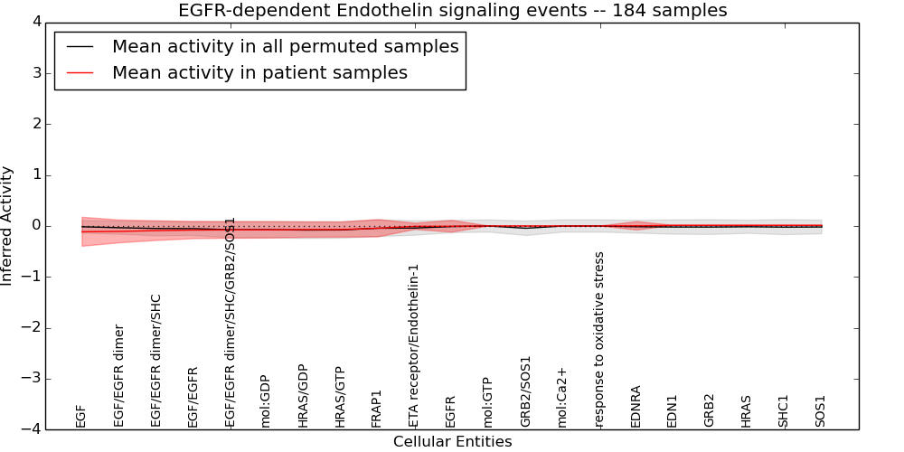 Figure S131. Get High-res Image This plot shows pathway concept perturbations across all samples against a permutation model. The concepts along the x-axis are sorted by lowest to highest mean activity for the real patient samples. Mean inferred activities are plotted along the y-axis as a colored band showing the average level and one standard deviation range. Real samples are shown in red and permuted samples in black.