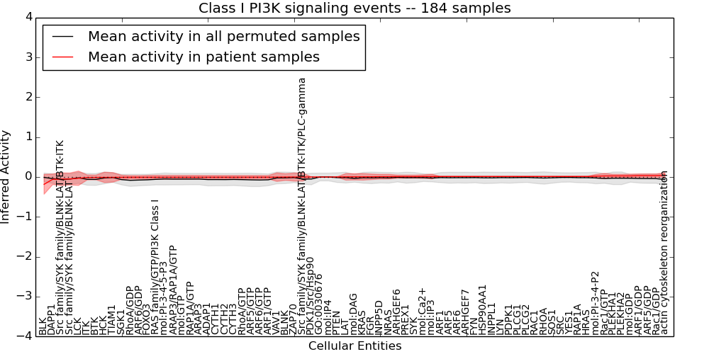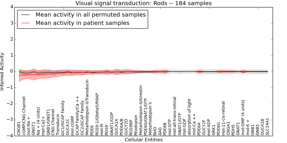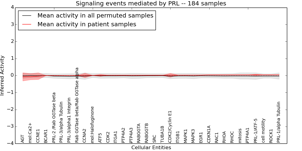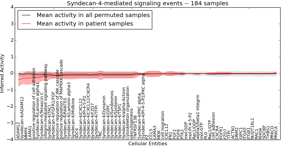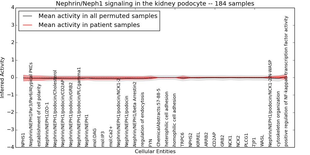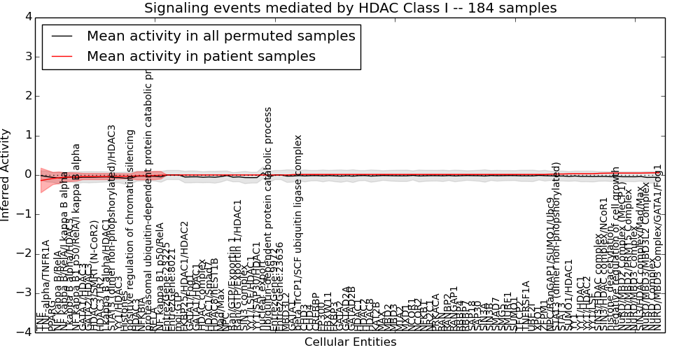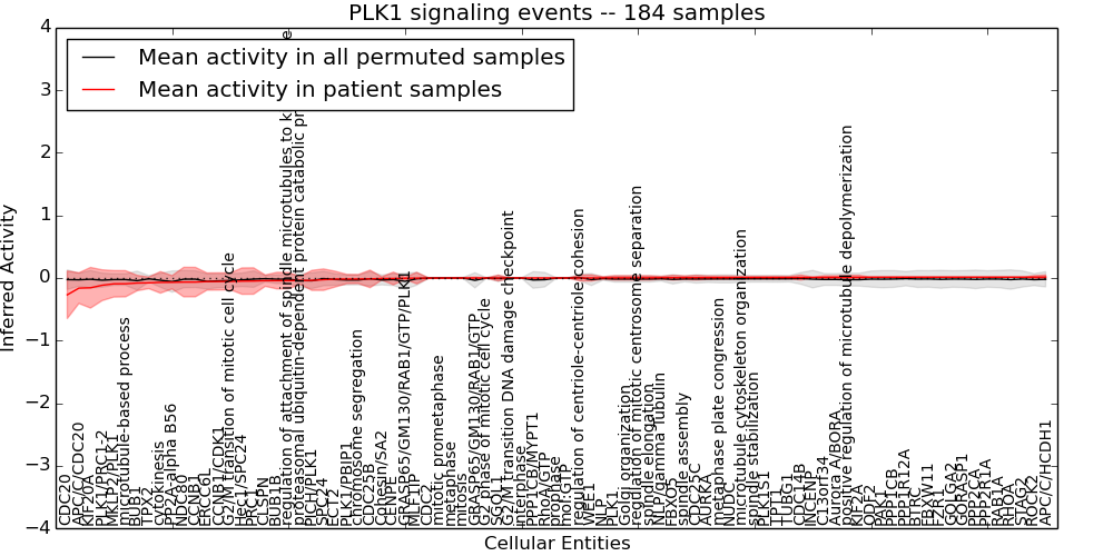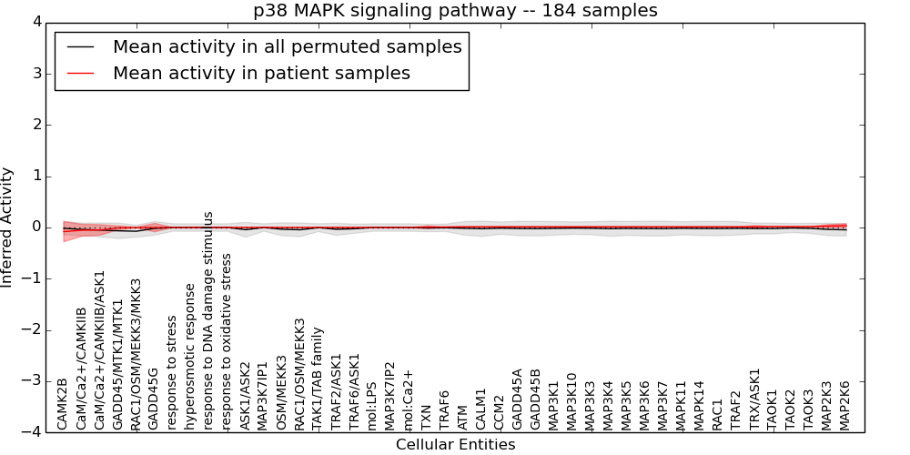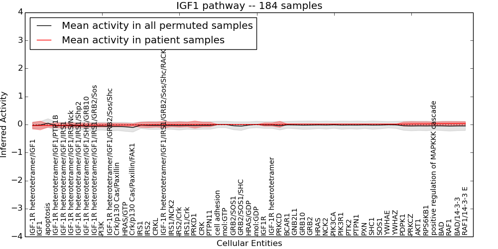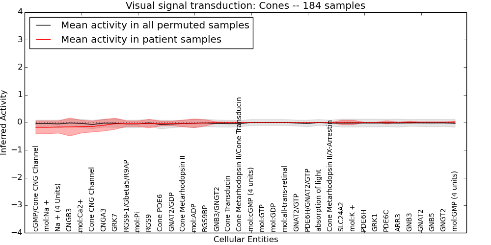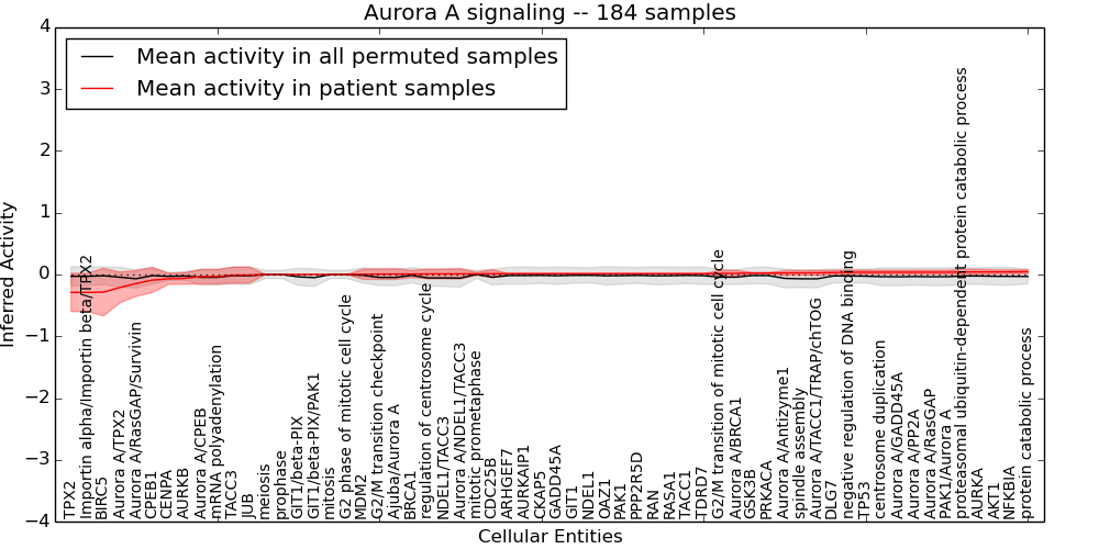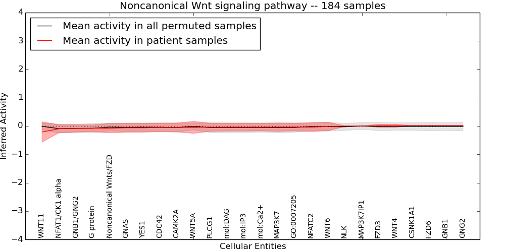 Figure S131. Get High-res Image This plot shows pathway concept perturbations across all samples against a permutation model. The concepts along the x-axis are sorted by lowest to highest mean activity for the real patient samples. Mean inferred activities are plotted along the y-axis as a colored band showing the average level and one standard deviation range. Real samples are shown in red and permuted samples in black.