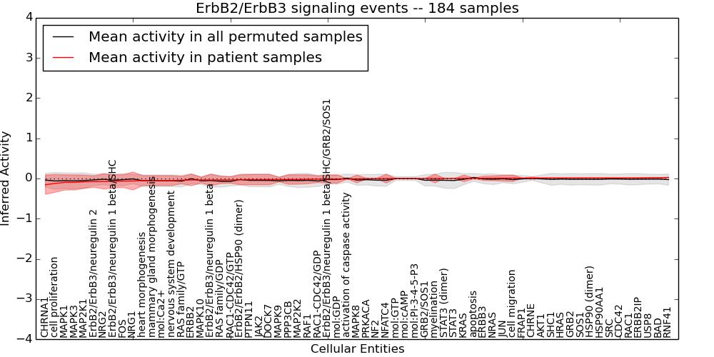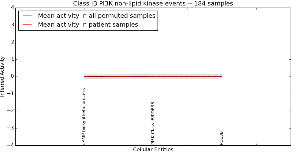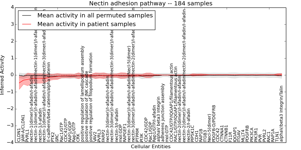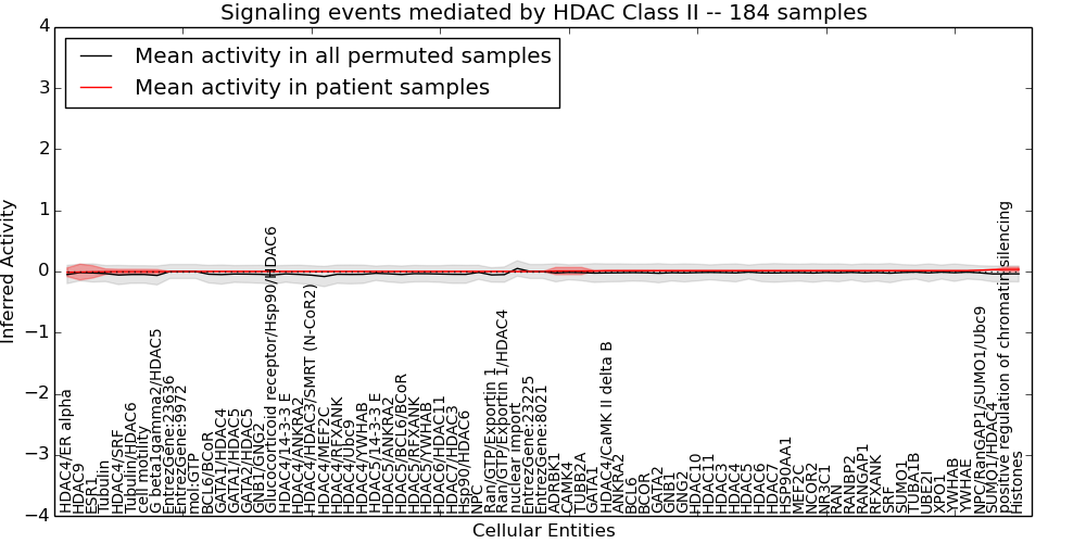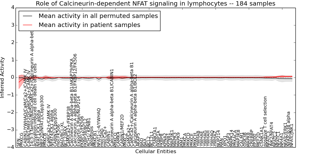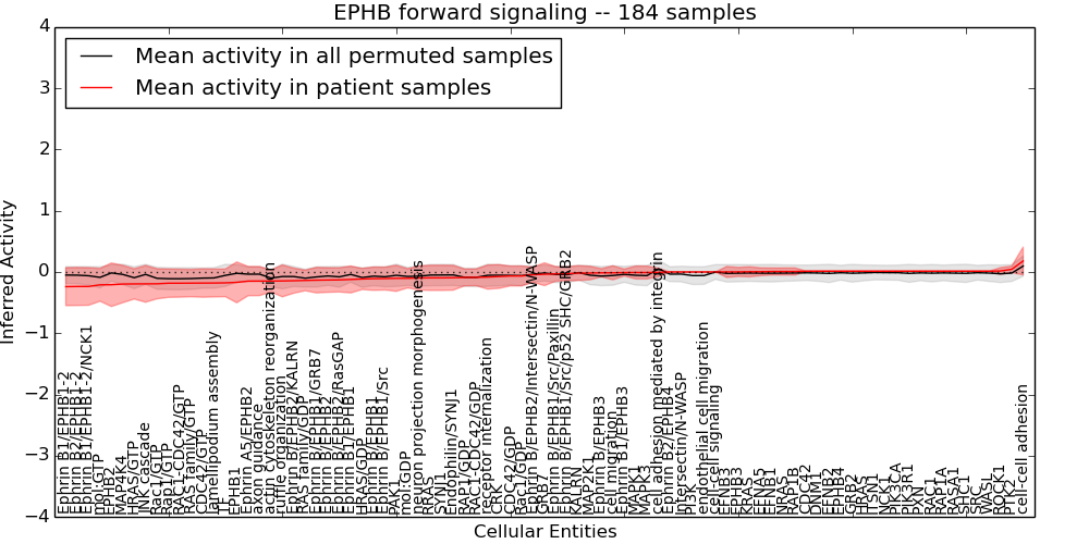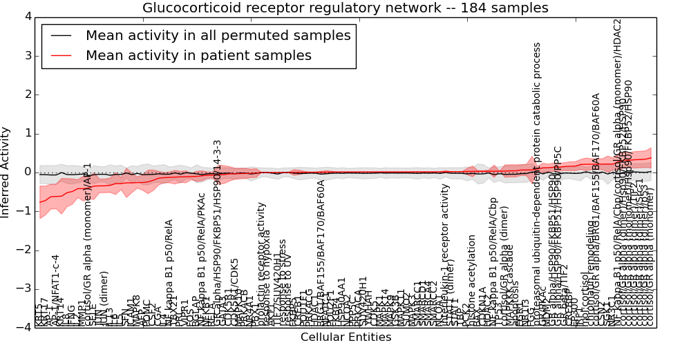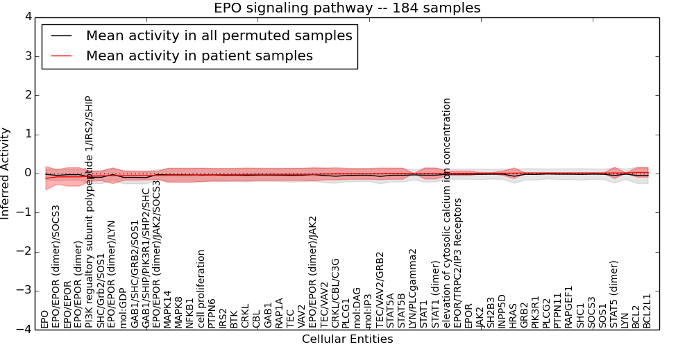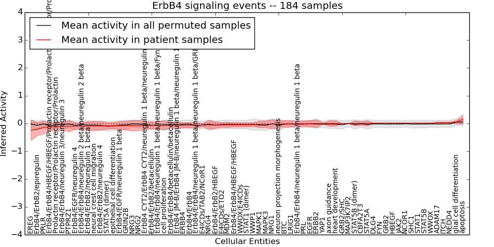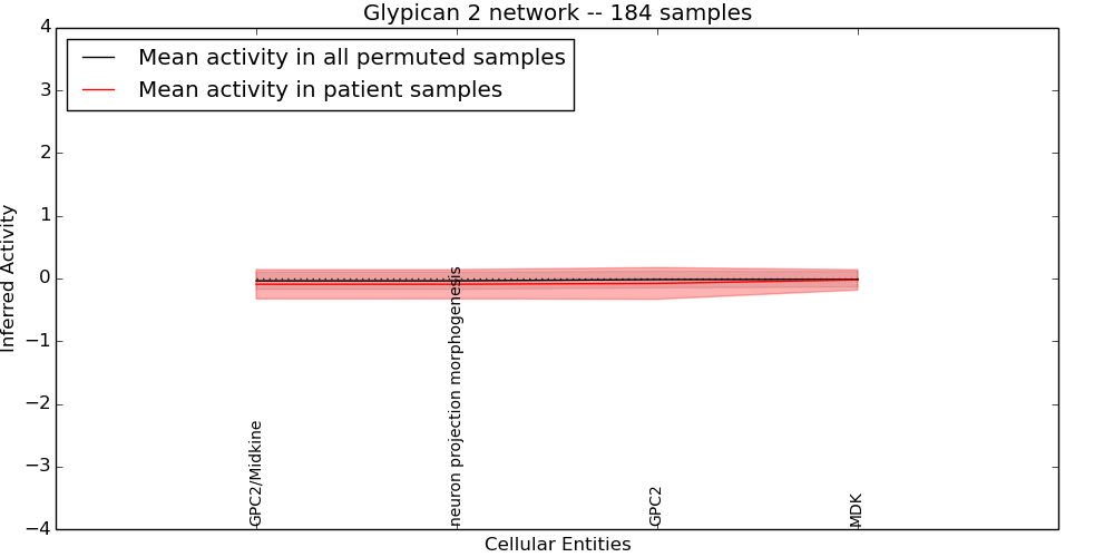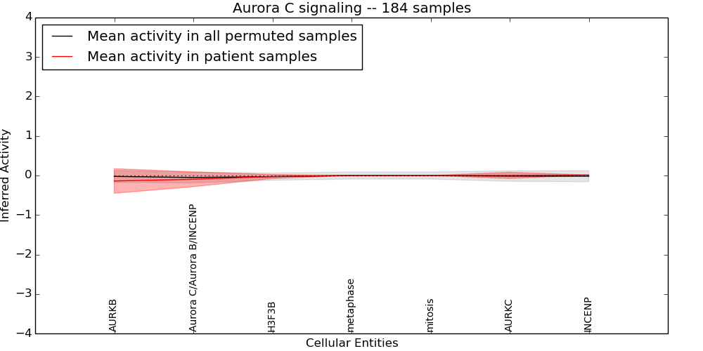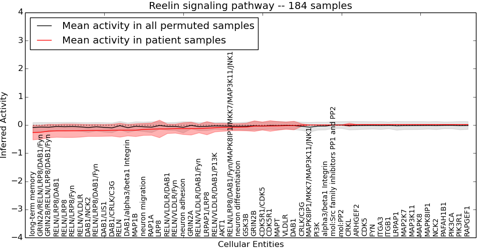 Figure S131. Get High-res Image This plot shows pathway concept perturbations across all samples against a permutation model. The concepts along the x-axis are sorted by lowest to highest mean activity for the real patient samples. Mean inferred activities are plotted along the y-axis as a colored band showing the average level and one standard deviation range. Real samples are shown in red and permuted samples in black.