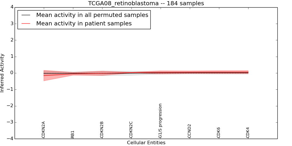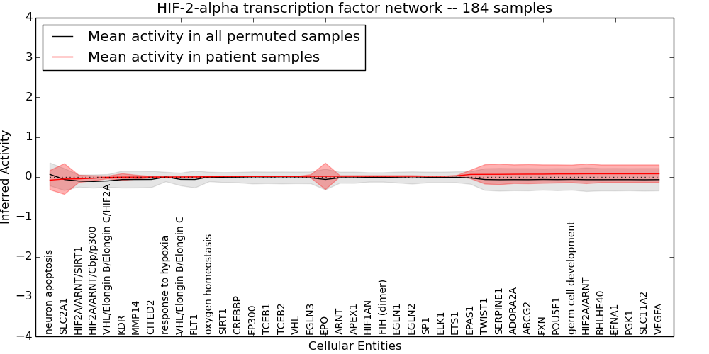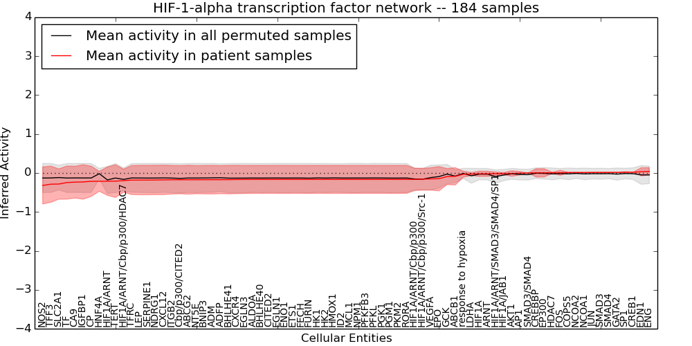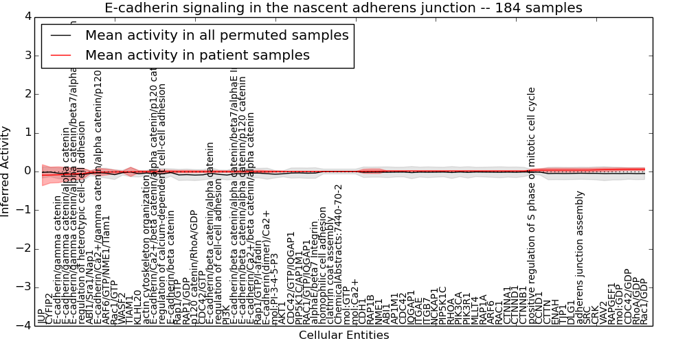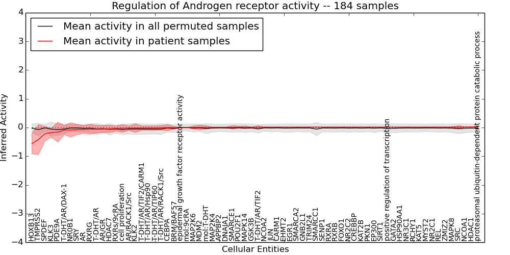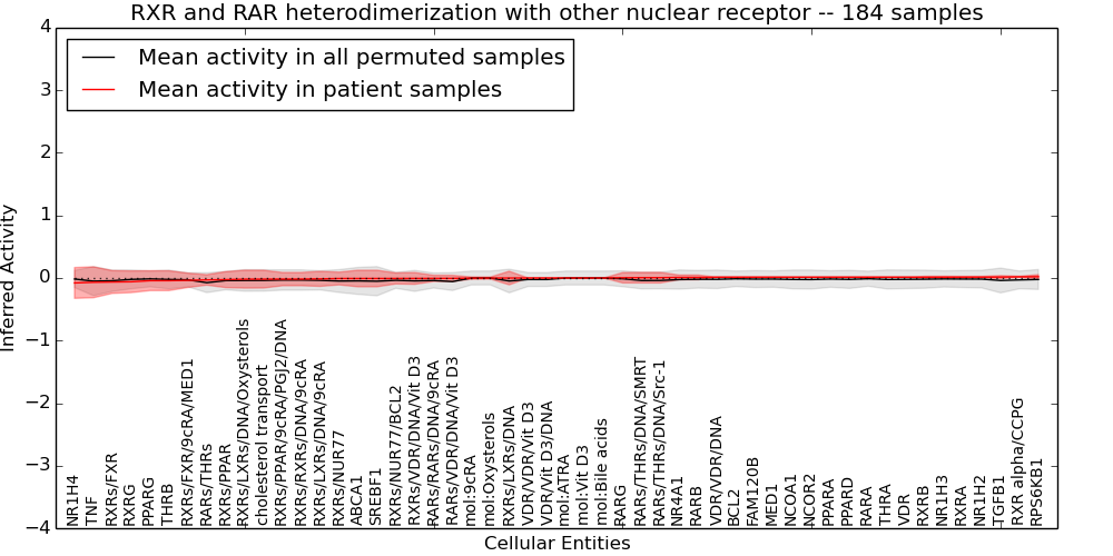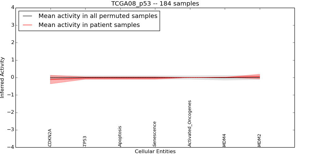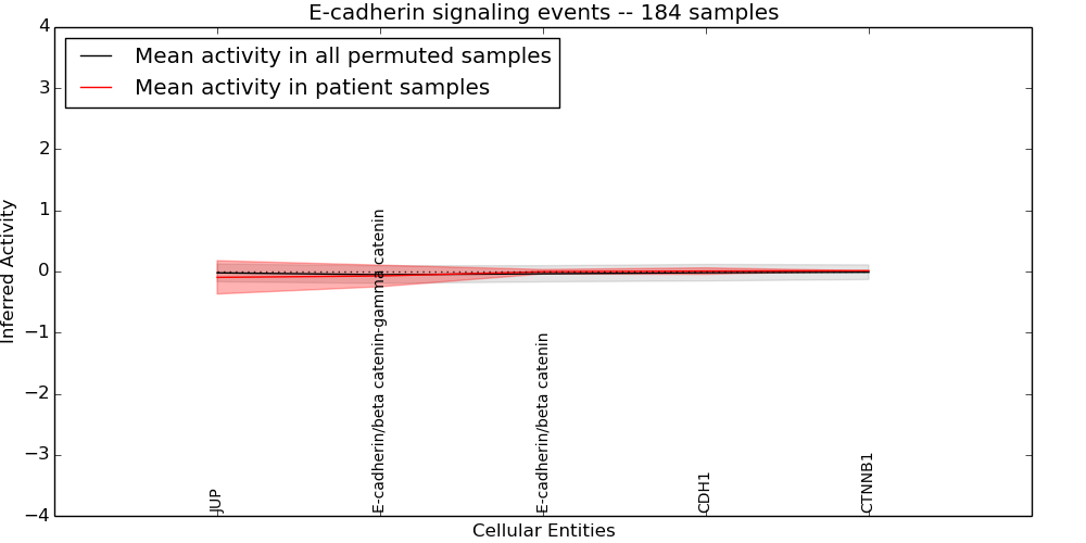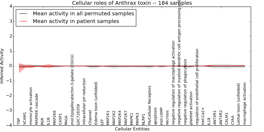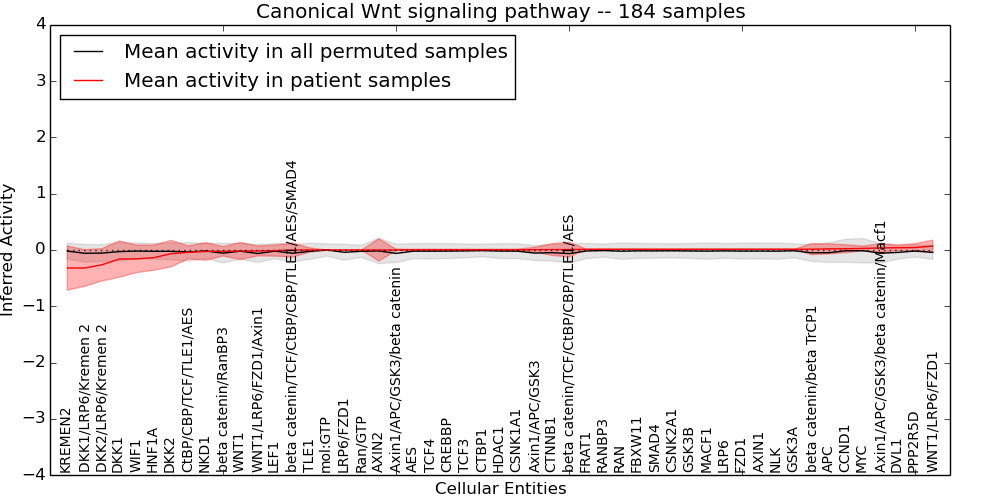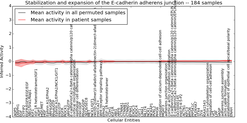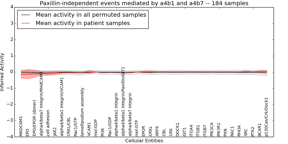 Figure S131. Get High-res Image This plot shows pathway concept perturbations across all samples against a permutation model. The concepts along the x-axis are sorted by lowest to highest mean activity for the real patient samples. Mean inferred activities are plotted along the y-axis as a colored band showing the average level and one standard deviation range. Real samples are shown in red and permuted samples in black.