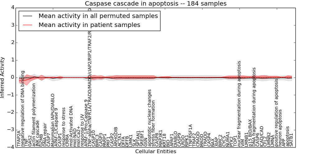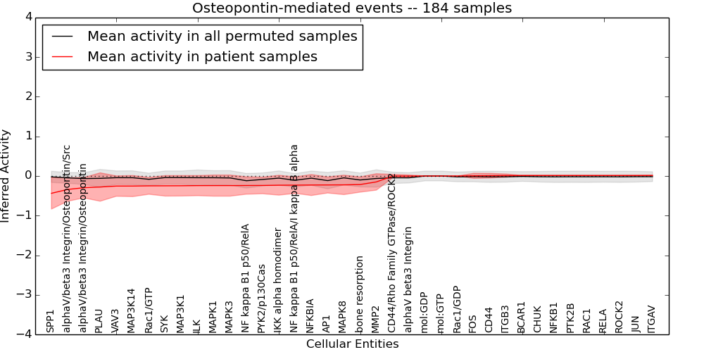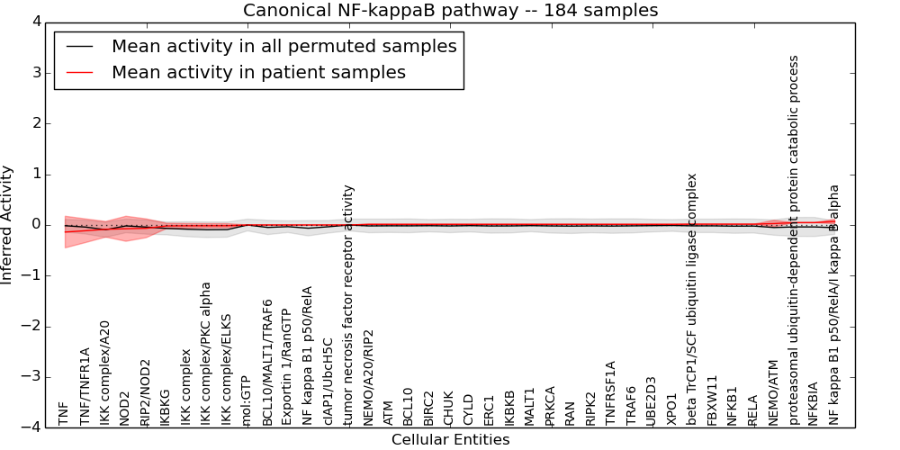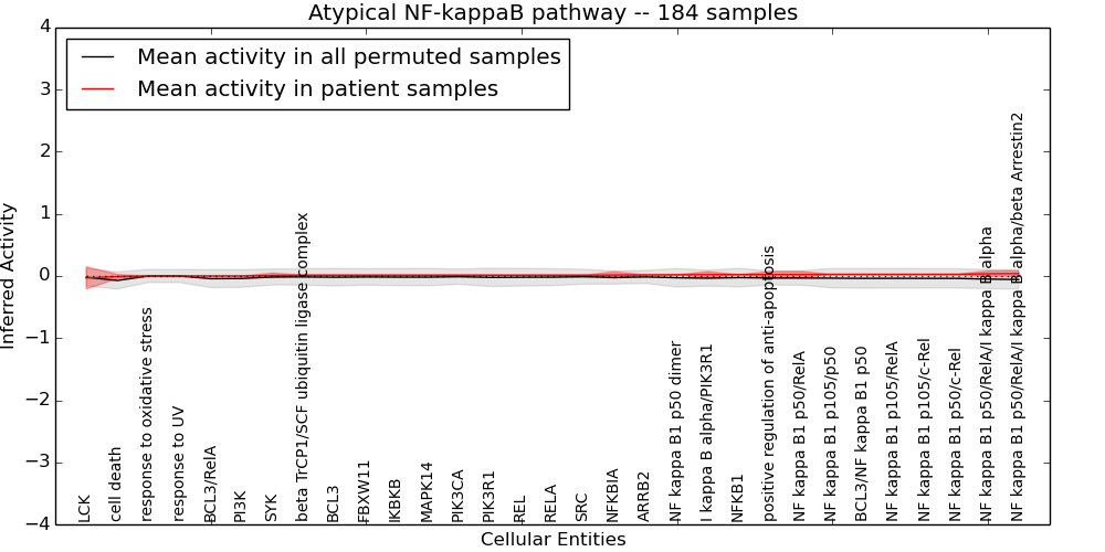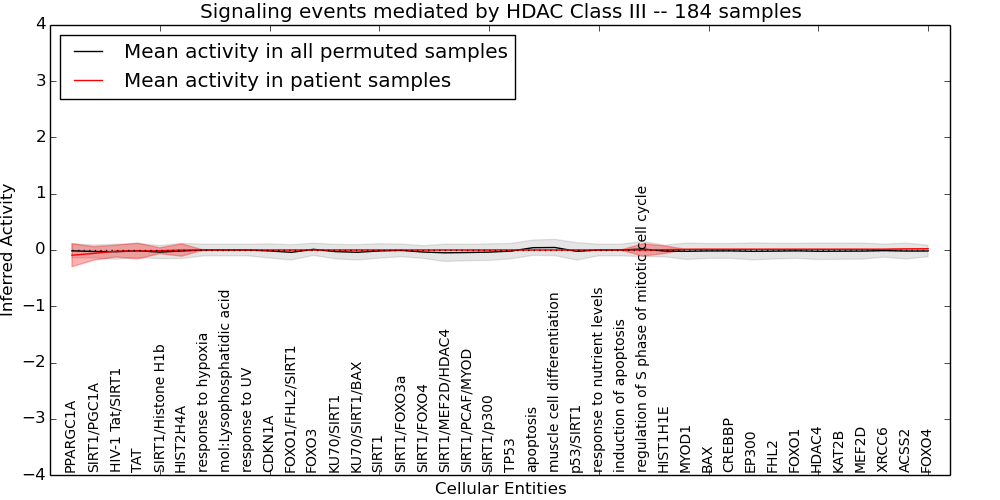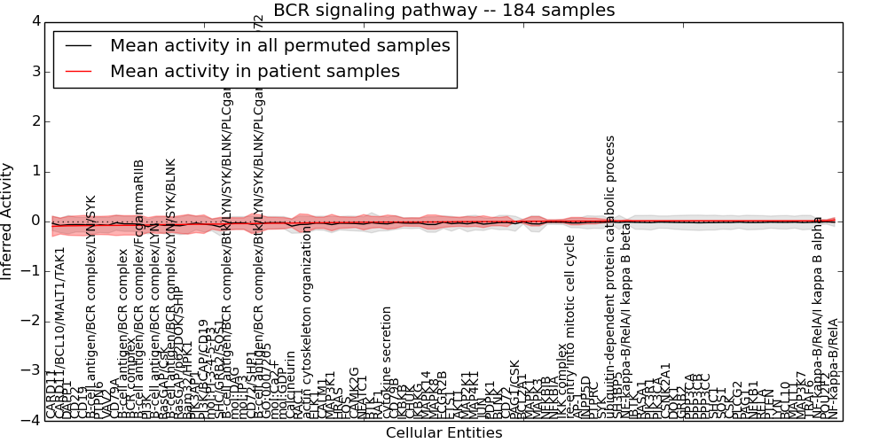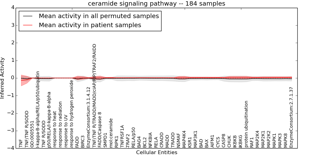 Figure S130. Get High-res Image This plot shows pathway concept perturbations across all samples against a permutation model. The concepts along the x-axis are sorted by lowest to highest mean activity for the real patient samples. Mean inferred activities are plotted along the y-axis as a colored band showing the average level and one standard deviation range. Real samples are shown in red and permuted samples in black.