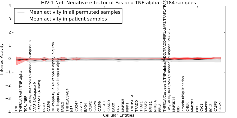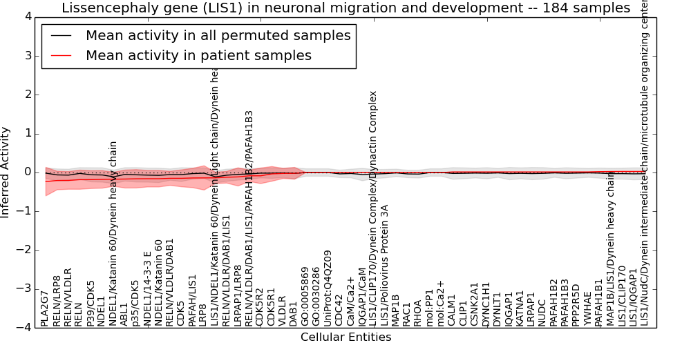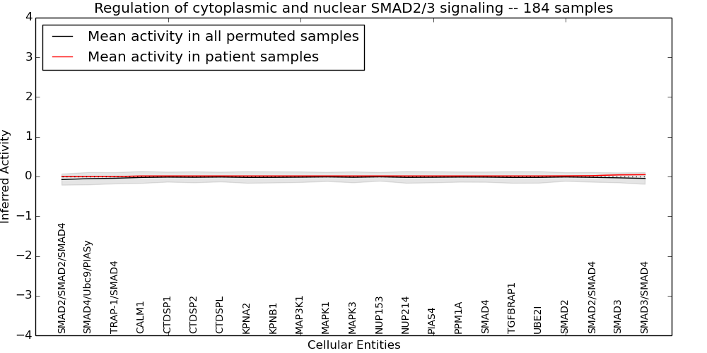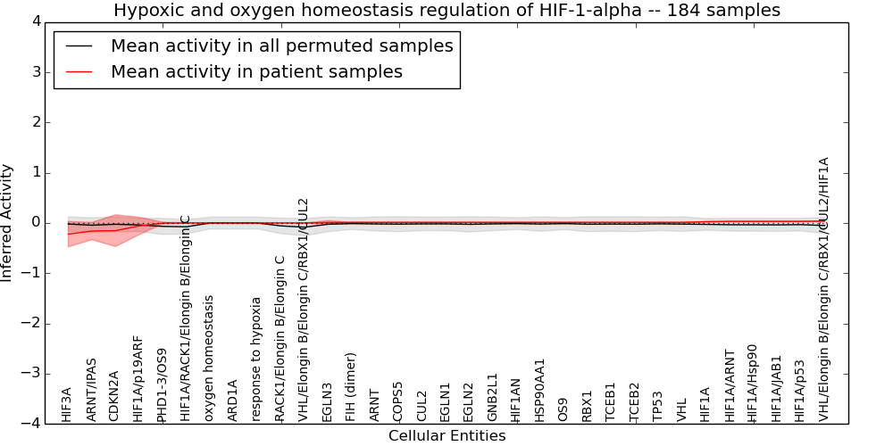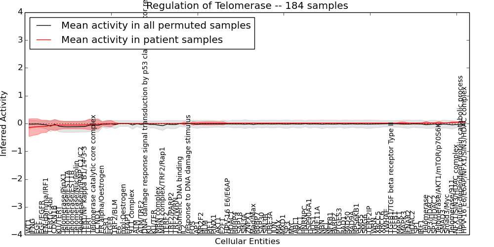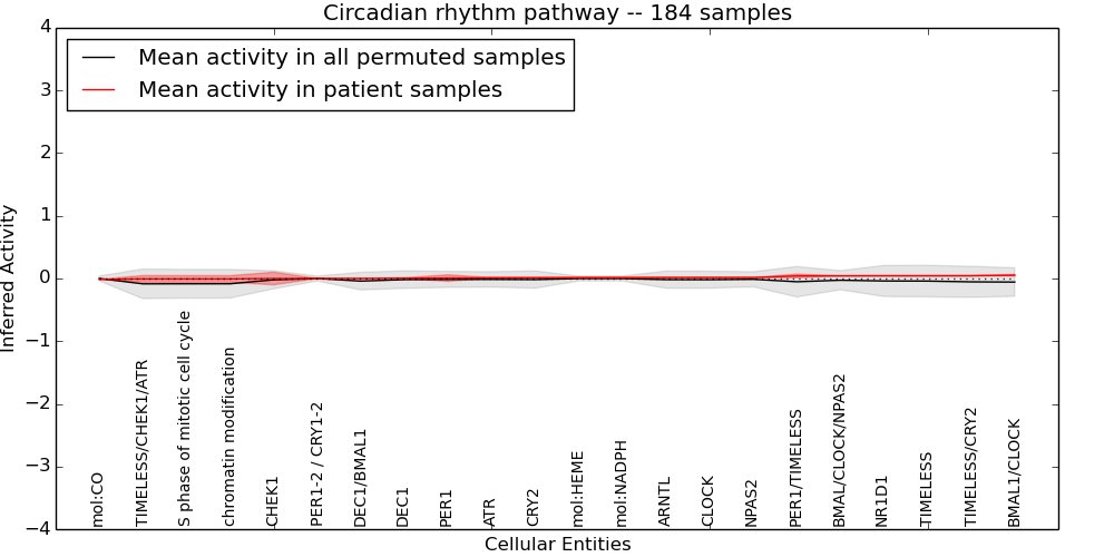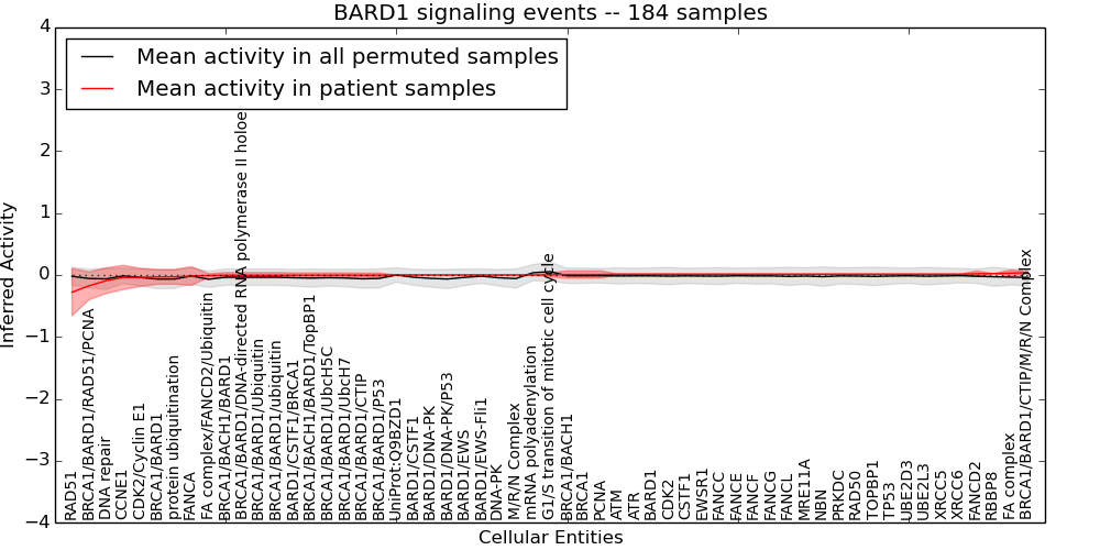Figure S130. Get High-res Image This plot shows pathway concept perturbations across all samples against a permutation model. The concepts along the x-axis are sorted by lowest to highest mean activity for the real patient samples. Mean inferred activities are plotted along the y-axis as a colored band showing the average level and one standard deviation range. Real samples are shown in red and permuted samples in black.