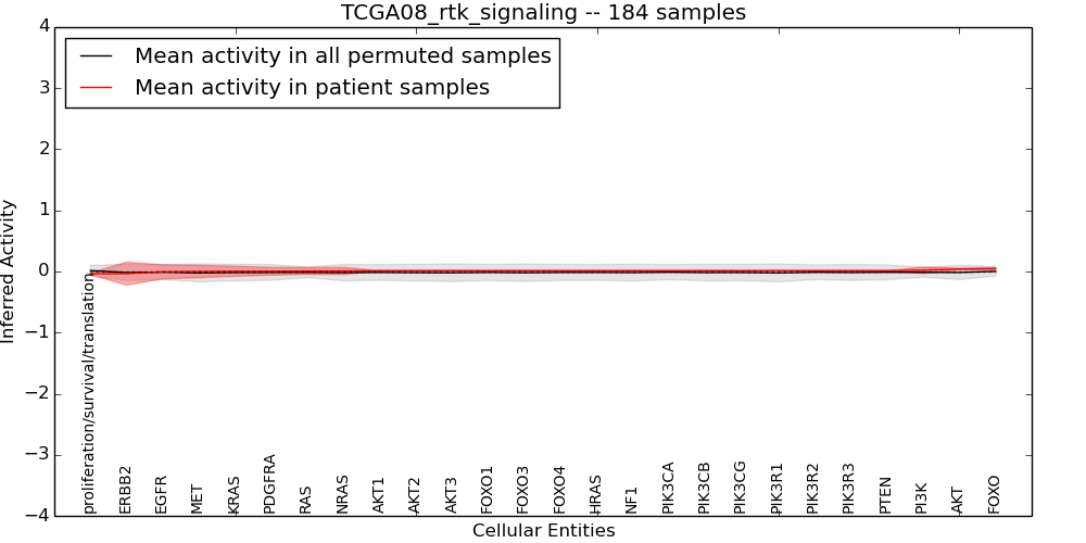 The significance of the IPL obtained for each concept in each patient sample is assessed using a permutation analysis. Importantly, the permutation analysis preserves data tuples so as to preserve any implicit correlations between the different data modalities. For example, genes that are deleted have concomitantly lower expression levels. Preserving the copy number and expression pairs therefore retains this data property. The simulation therefore makes "null samples" by permuting data tuples across all of the genes in the genome so that each gene in a null sample is associated with a random tuple of another gene with equal probability. This approach has the added benefit of preserving the pathway structure so that every observed IPL can be compared to a distribution of random IPLs derived from exactly the same interaction context. PARADIGM inferences are then obtained for 1000 "null" patients and serve as a background distribution to contrast the observed IPLs against. Pathway concepts are excluded from further analysis if they did not obtain a minimum IPL of 0.5 in any patient sample both observed or simulated.
