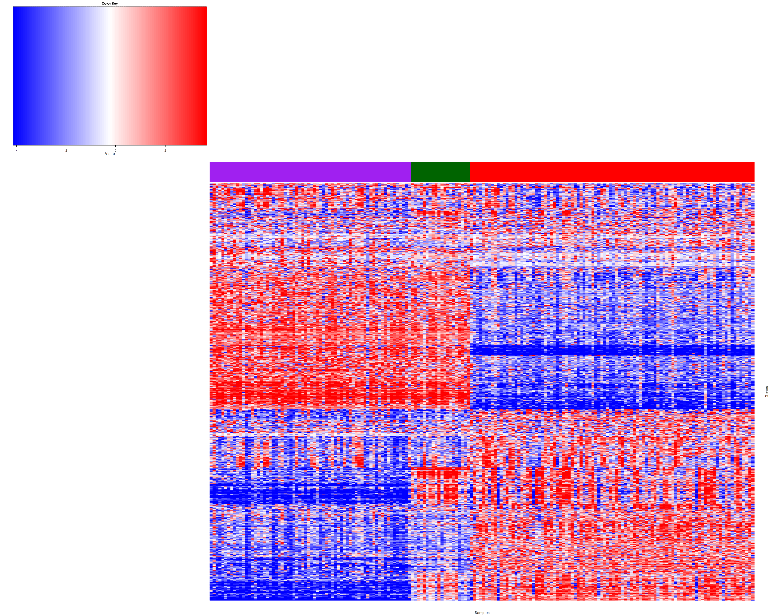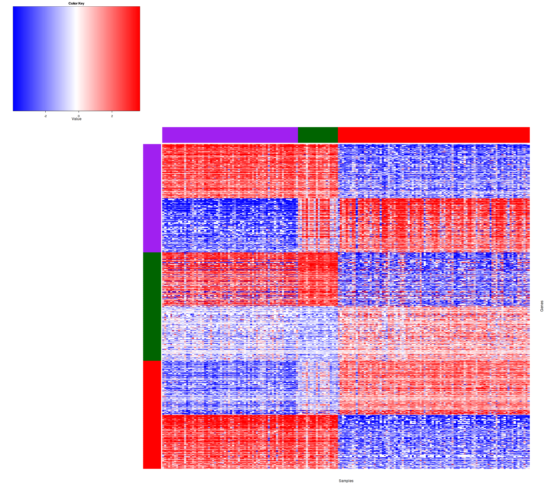 Figure 1.  Get High-res Image Samples were separated into 3 clusters. Shown are 184 samples and 900 marker genes. The color bar of the row indicates the marker genes for the corresponding cluster.