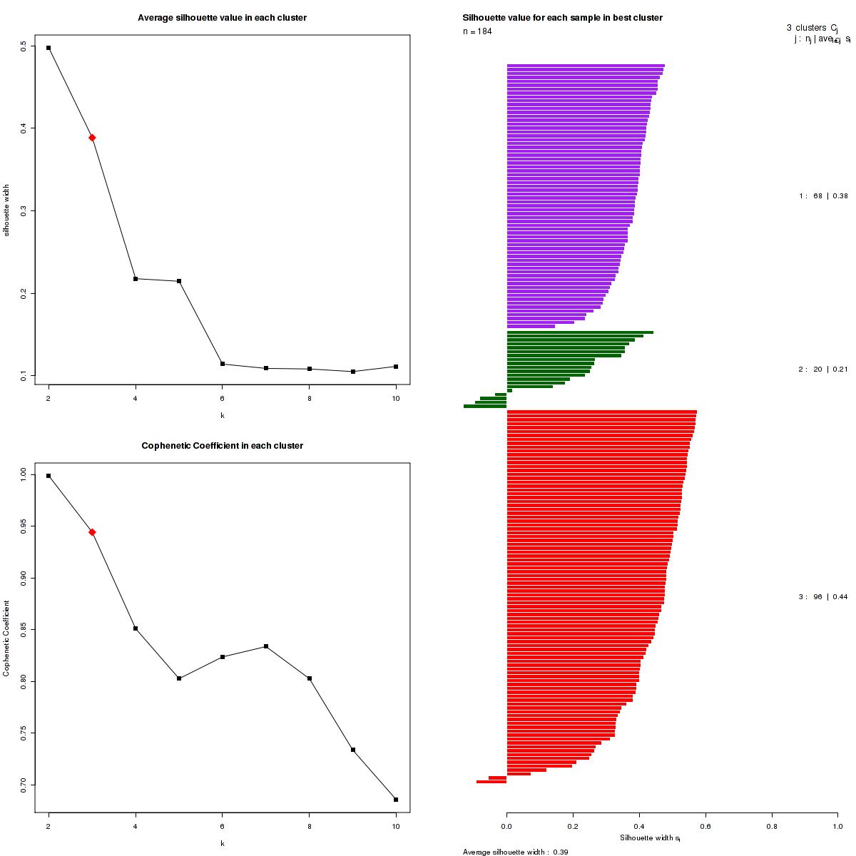 Silhouette widths, Cophenetic Correlation Coefficients and Consensus matrix