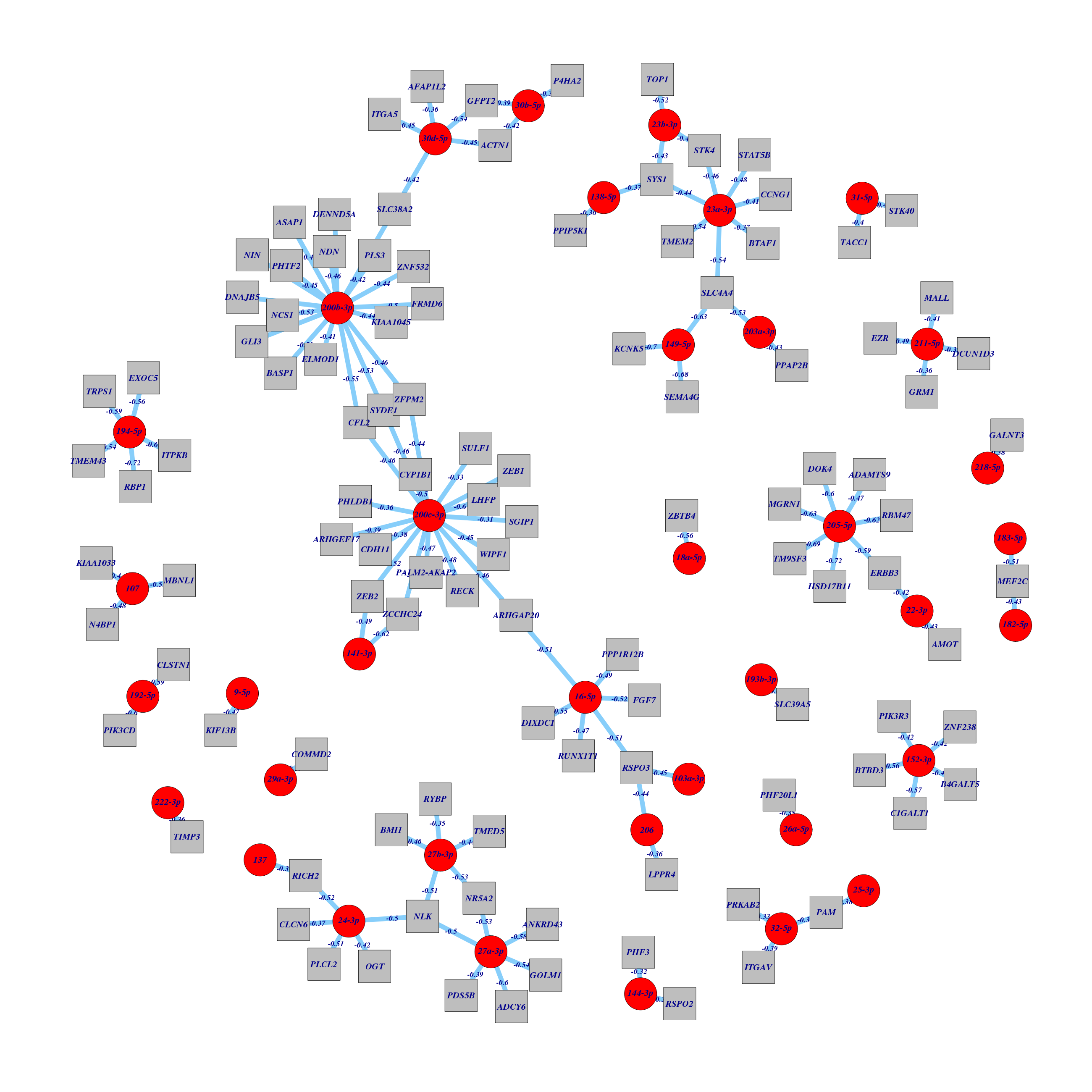 Figure 1. Get High-res Image All miR hubs with their strong anti-correlated genes and predicted interactions in three sequence prediction databases.