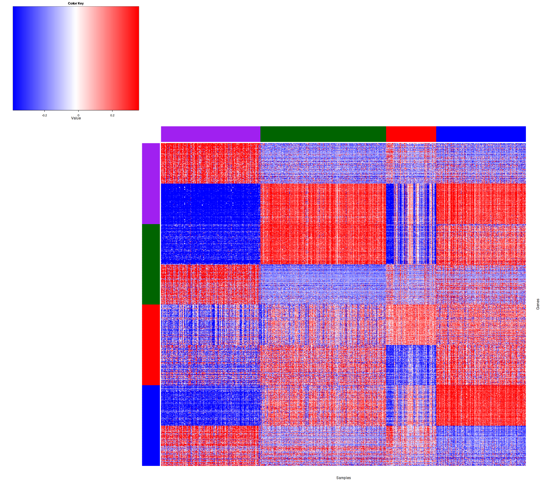 Figure 1. Get High-res Image Samples were separated into 4 clusters. Shown are 656 samples and 1200 marker genes. The color bar of the row indicates the marker genes for the corresponding cluster.
