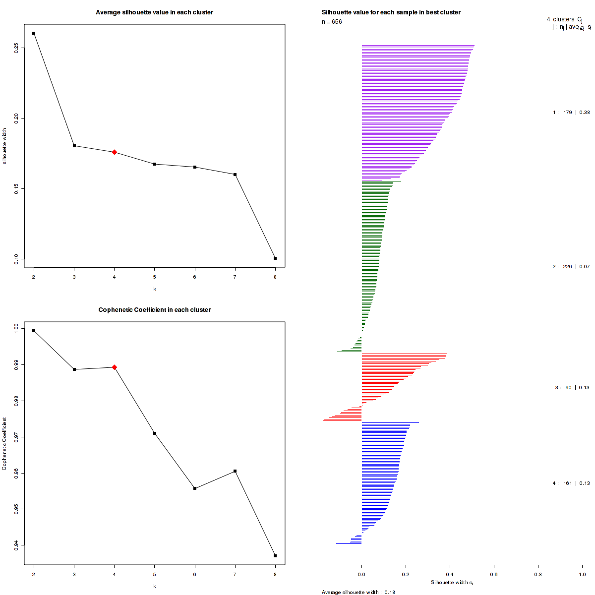 Figure 3. Get High-res Image The silhouette width was calculated for each sample and each value of k. The left upper panel shows the average silhouette width across all samples for each tested k (left upper panel). The left lower panel shows the Cophenetic Correlation Coefficients for each tested k. The right panel shows assignments of clusters to samples and the silhouette width of each sample for the most robust clustering.