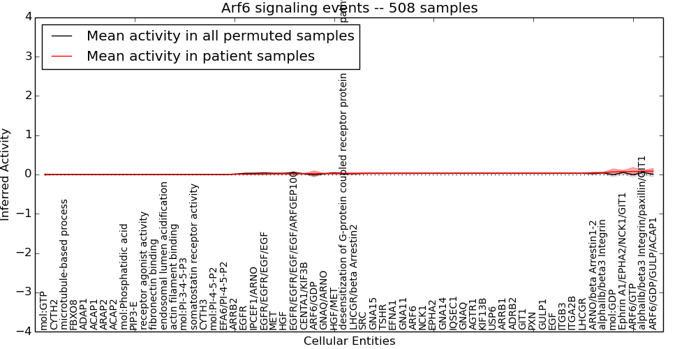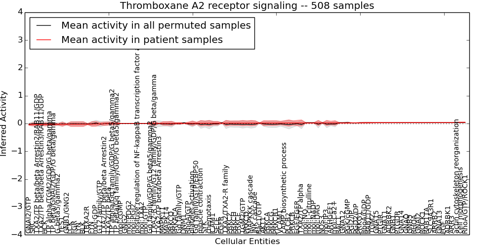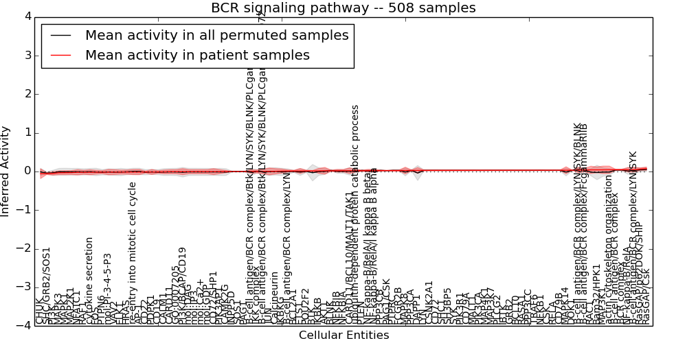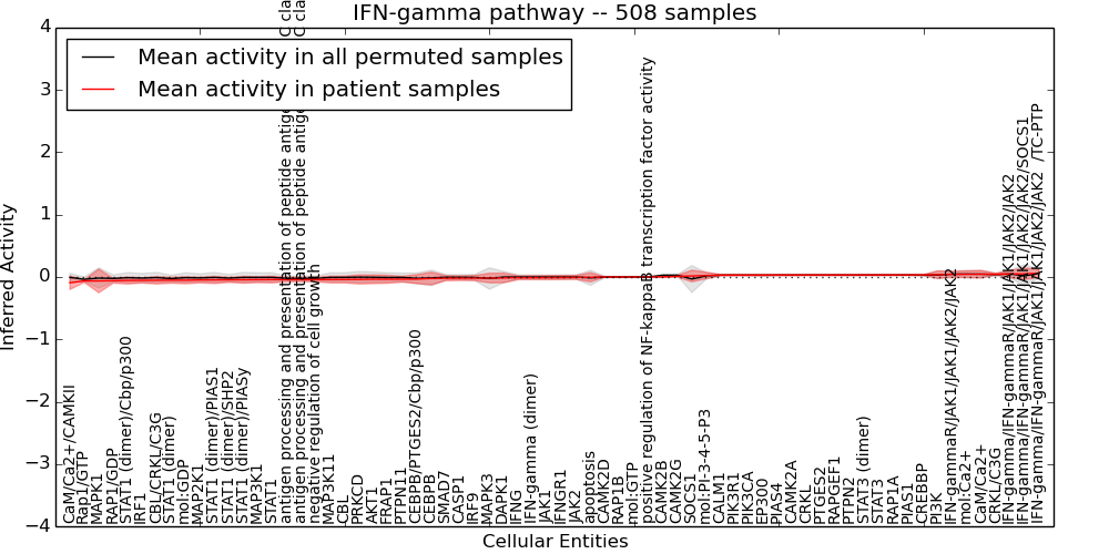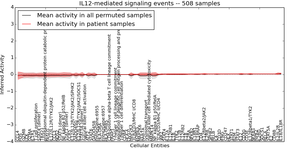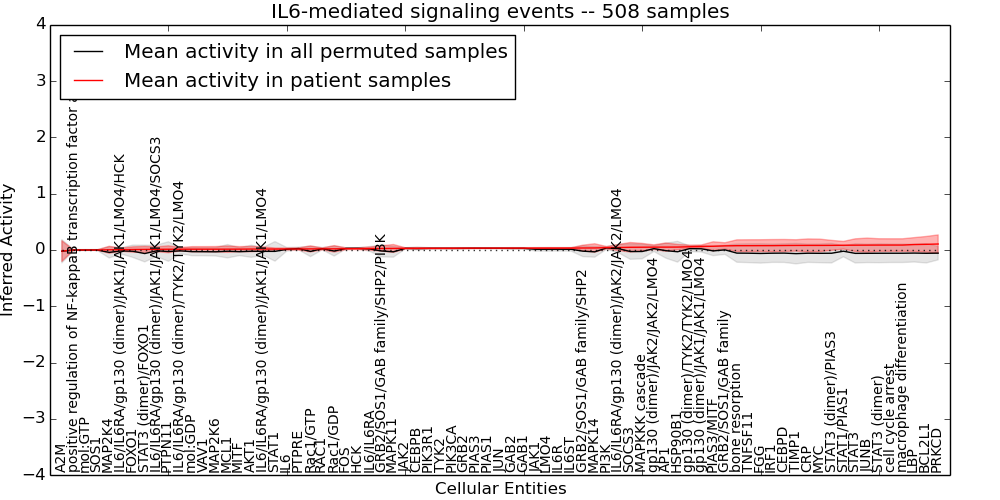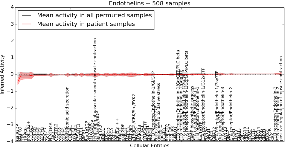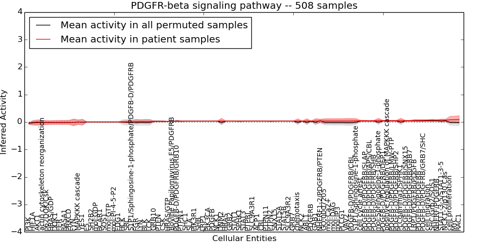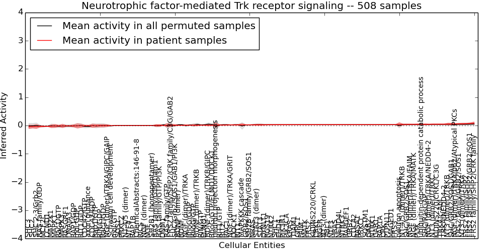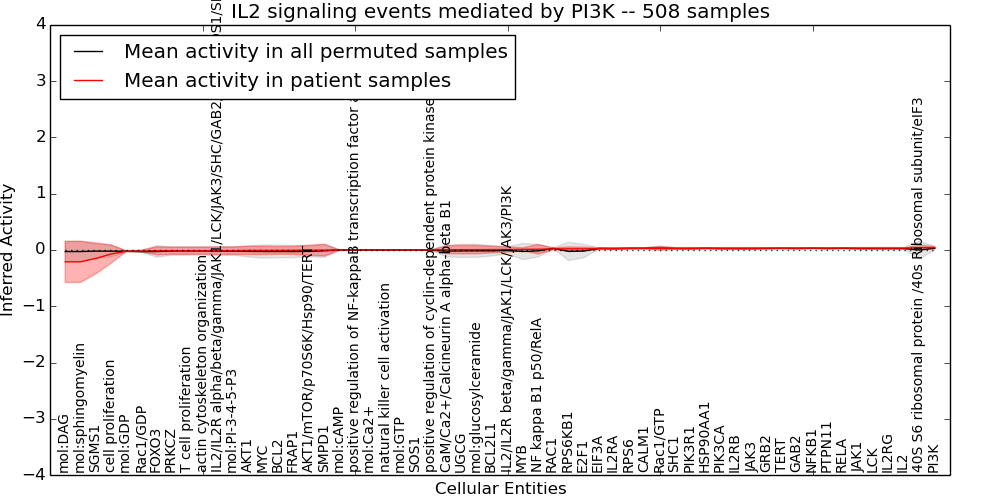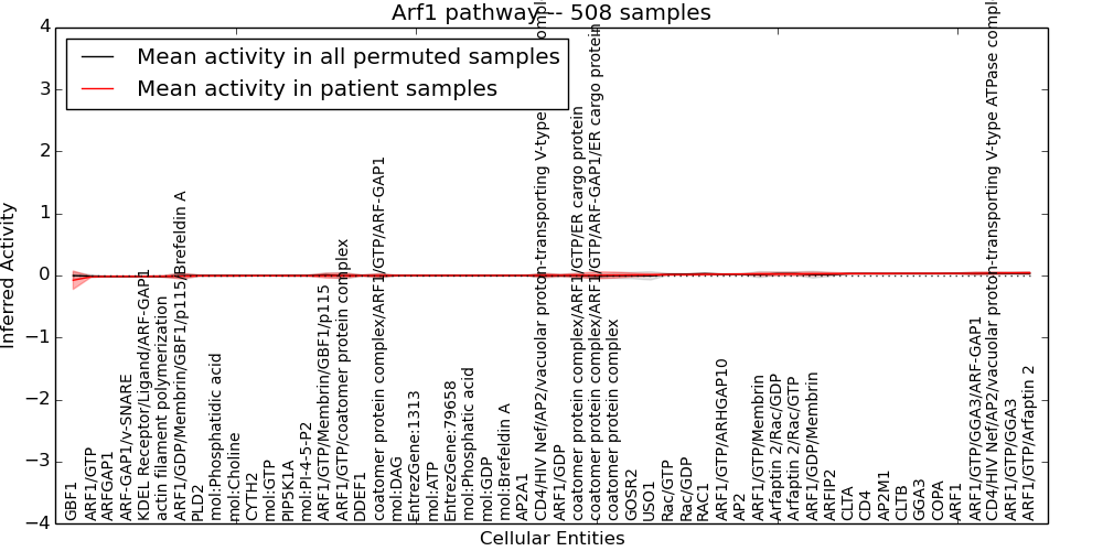Figure S130. Get High-res Image This plot shows pathway concept perturbations across all samples against a permutation model. The concepts along the x-axis are sorted by lowest to highest mean activity for the real patient samples. Mean inferred activities are plotted along the y-axis as a colored band showing the average level and one standard deviation range. Real samples are shown in red and permuted samples in black.