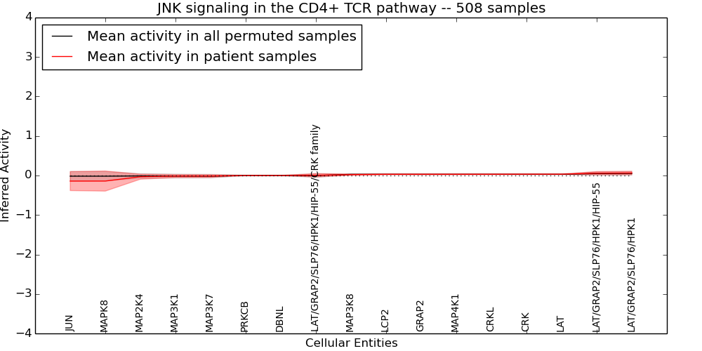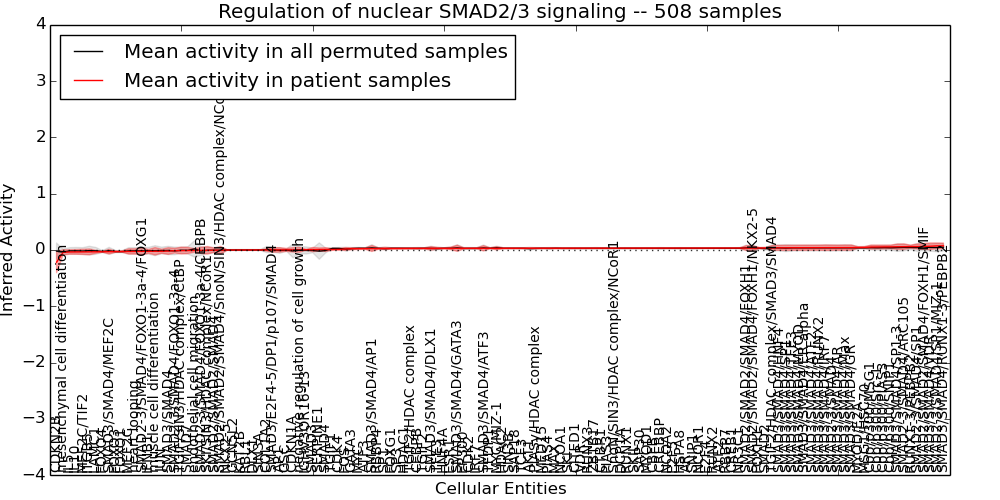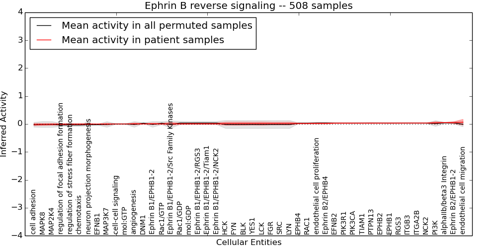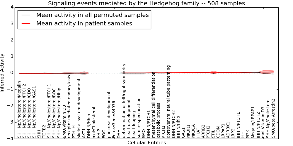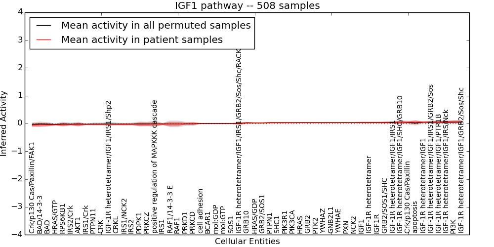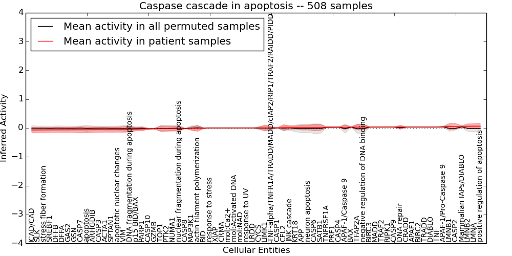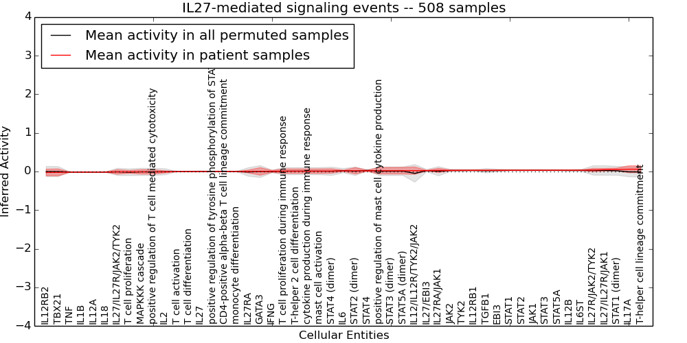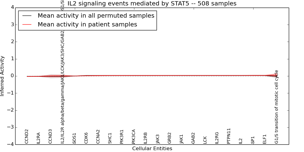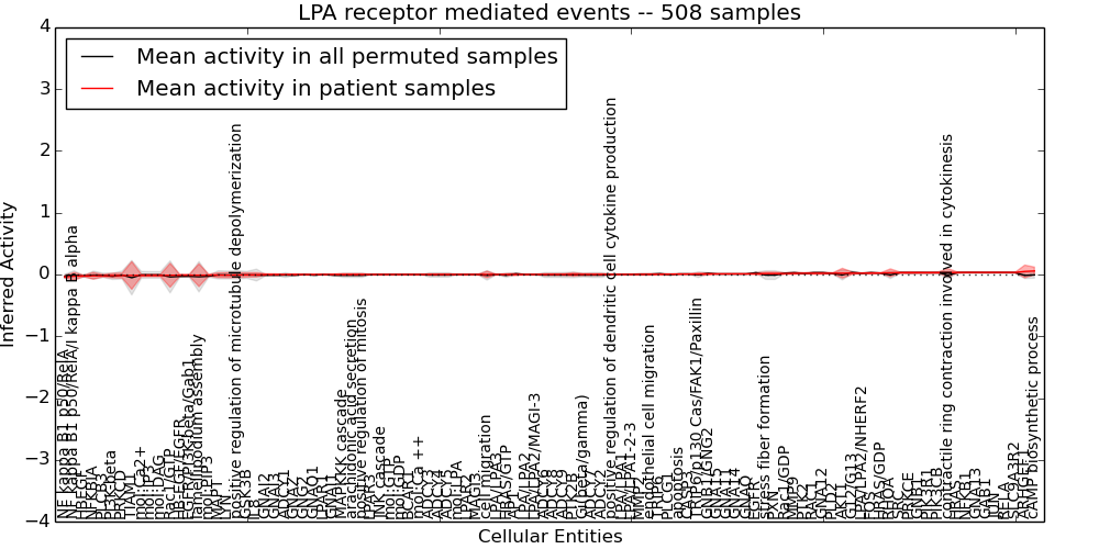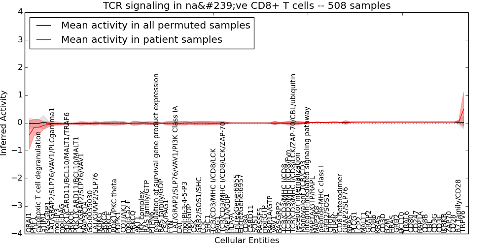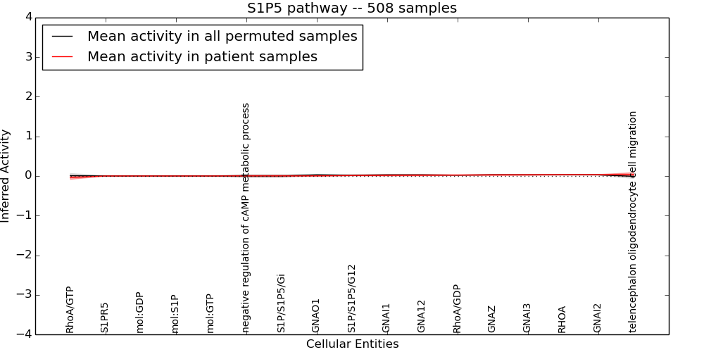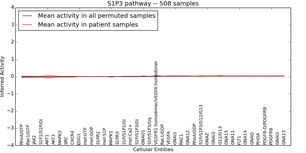 Figure S130. Get High-res Image This plot shows pathway concept perturbations across all samples against a permutation model. The concepts along the x-axis are sorted by lowest to highest mean activity for the real patient samples. Mean inferred activities are plotted along the y-axis as a colored band showing the average level and one standard deviation range. Real samples are shown in red and permuted samples in black.