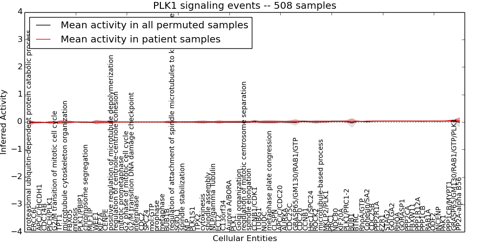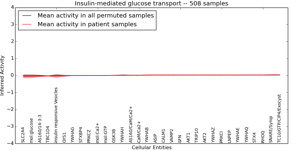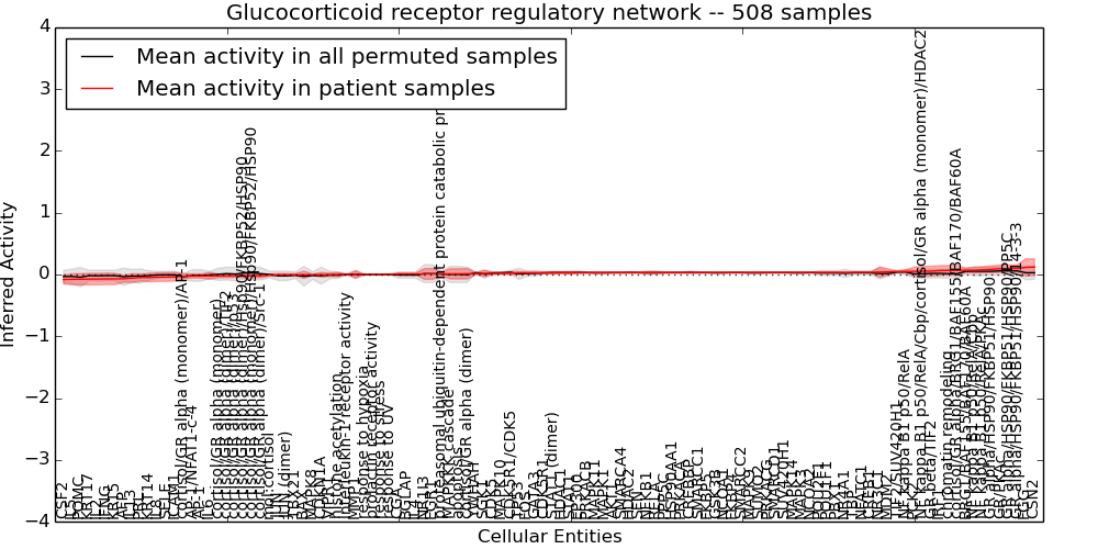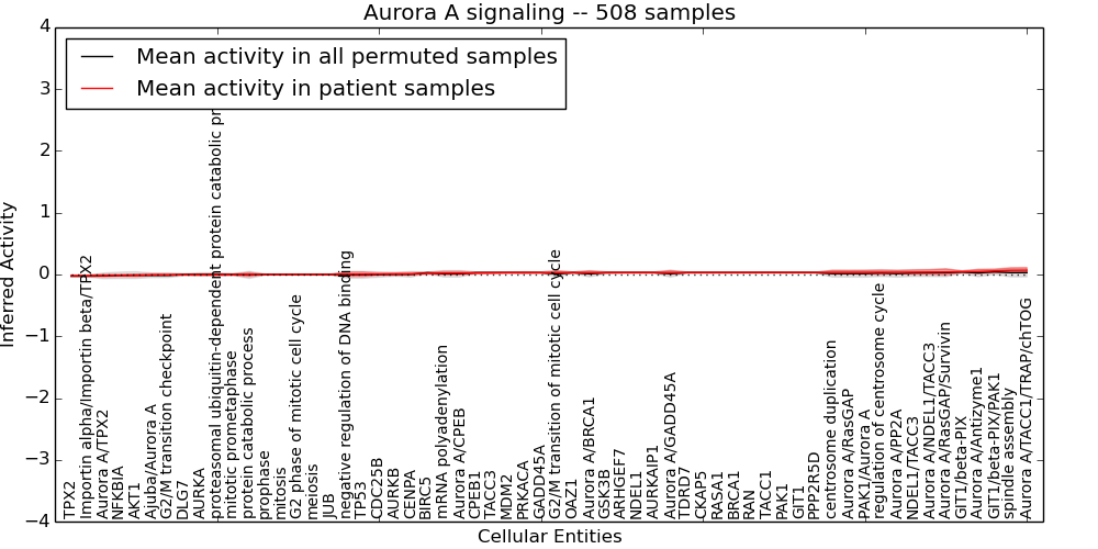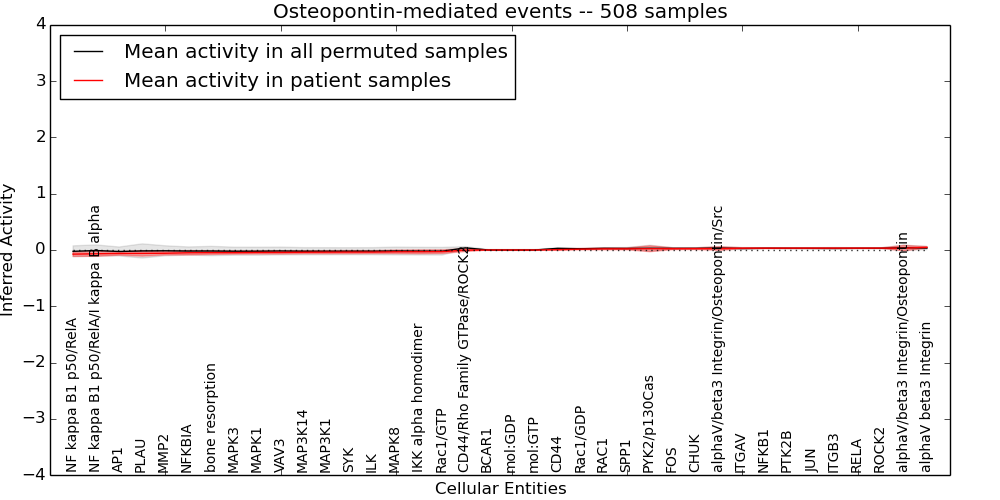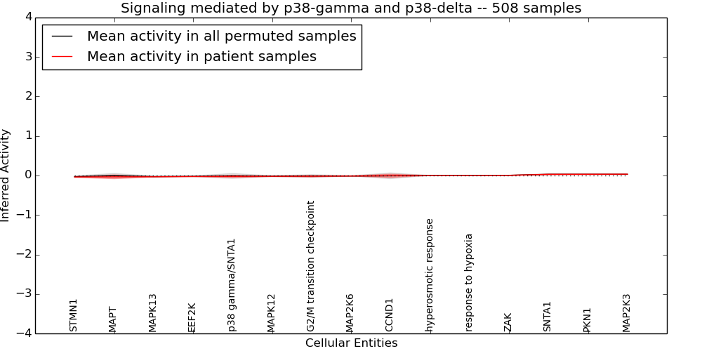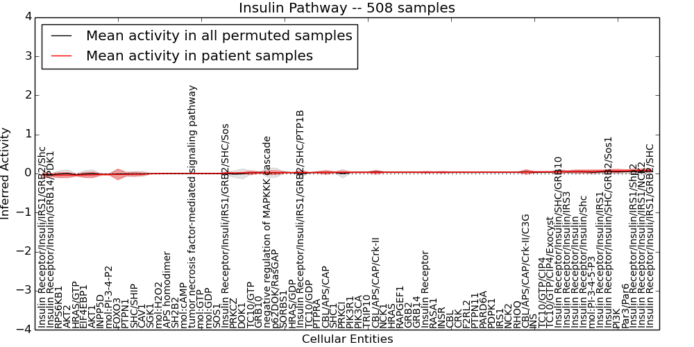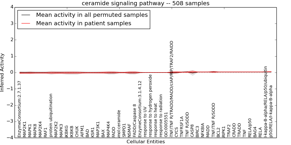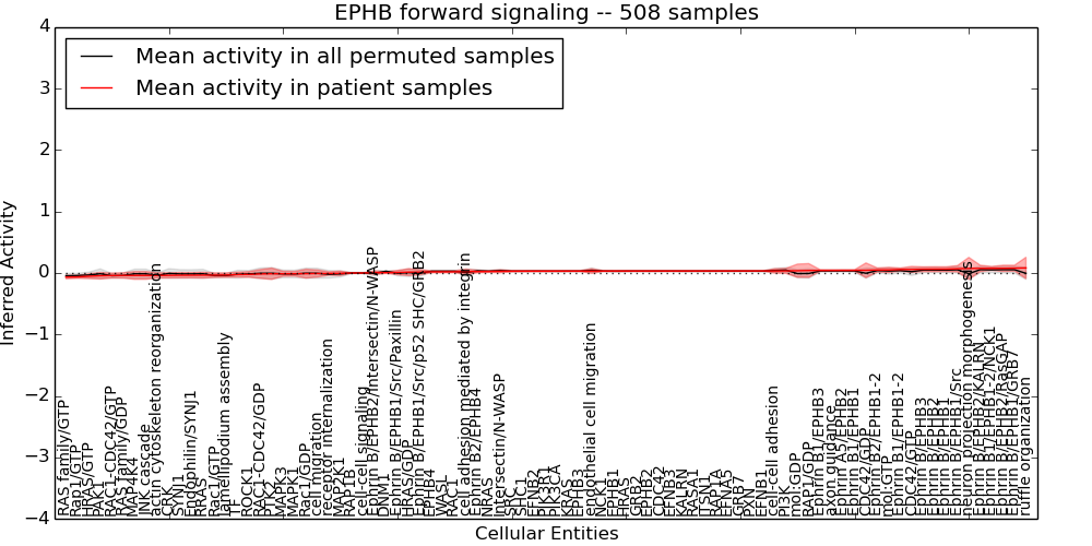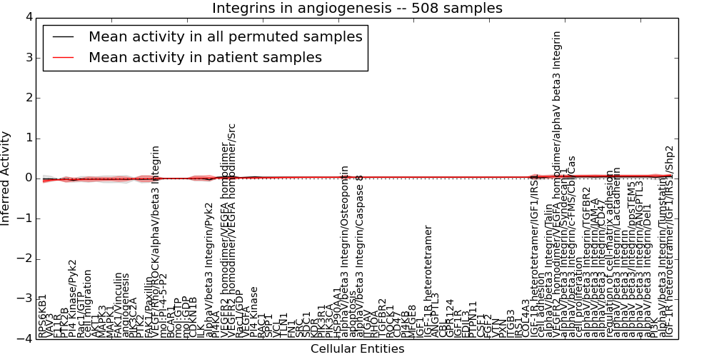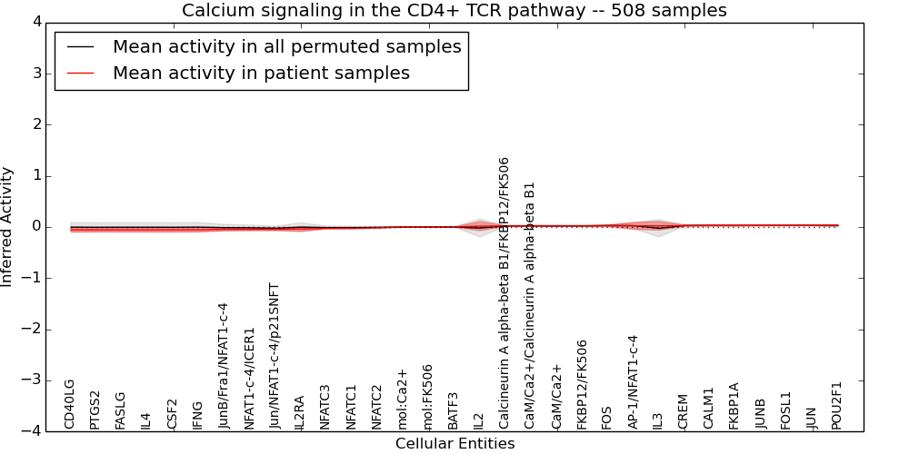 Figure S130. Get High-res Image This plot shows pathway concept perturbations across all samples against a permutation model. The concepts along the x-axis are sorted by lowest to highest mean activity for the real patient samples. Mean inferred activities are plotted along the y-axis as a colored band showing the average level and one standard deviation range. Real samples are shown in red and permuted samples in black.