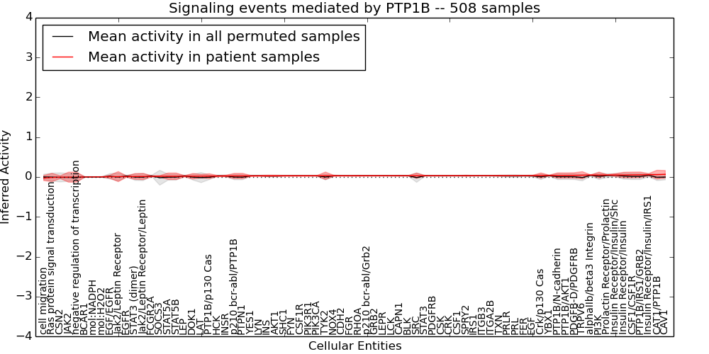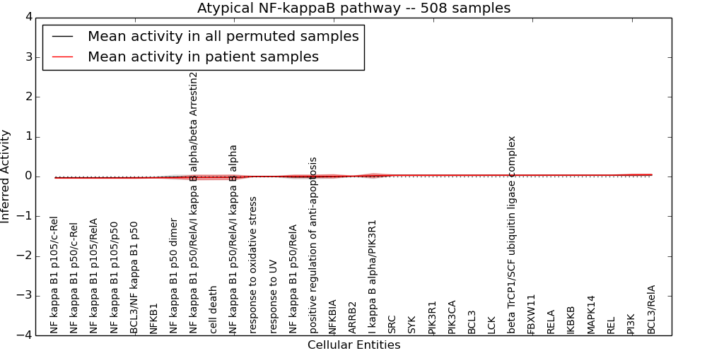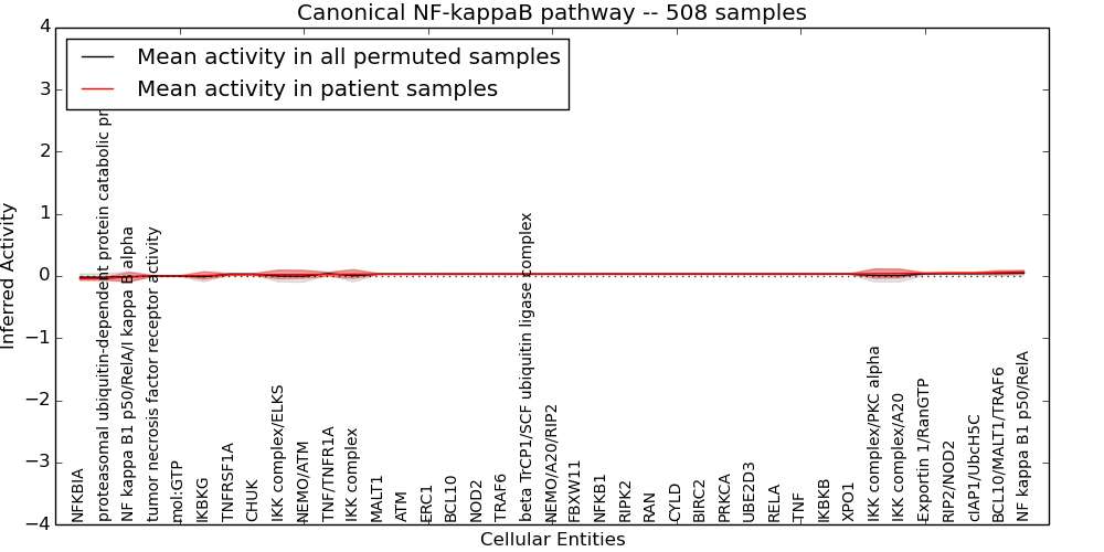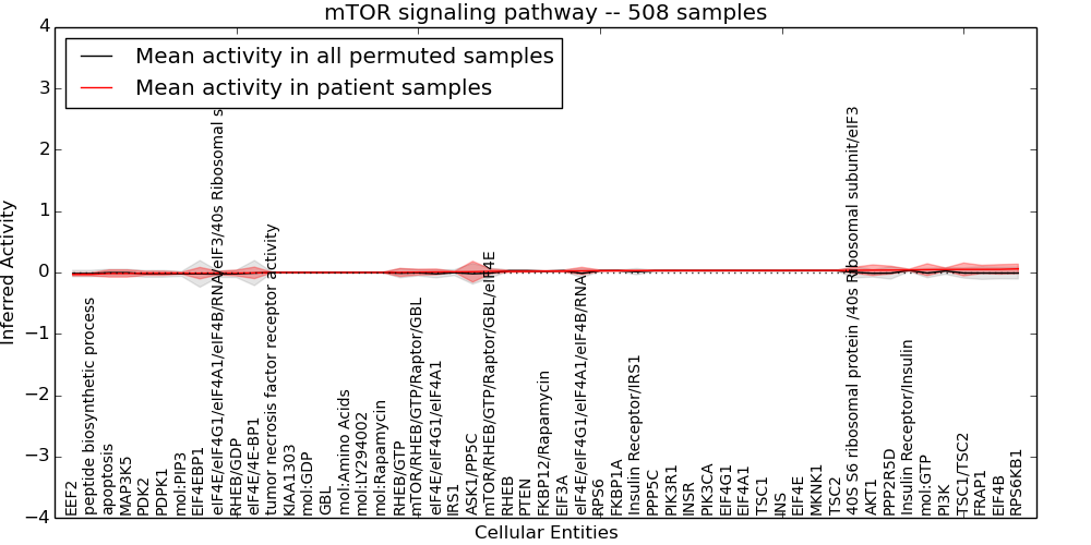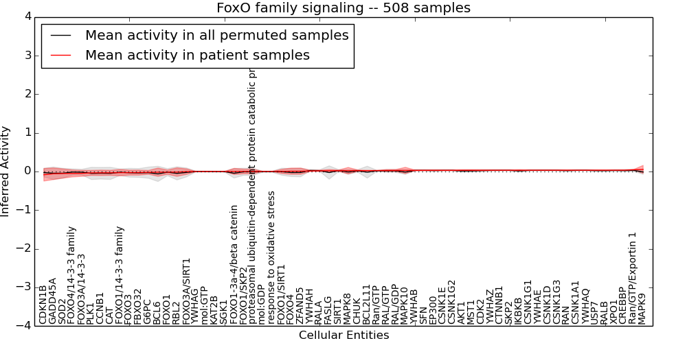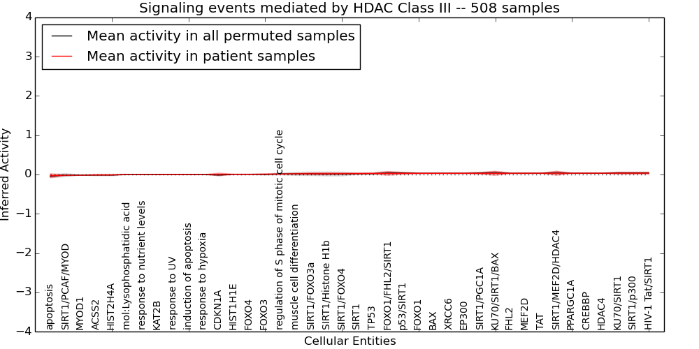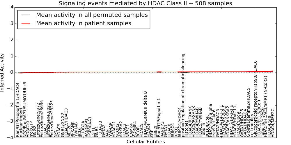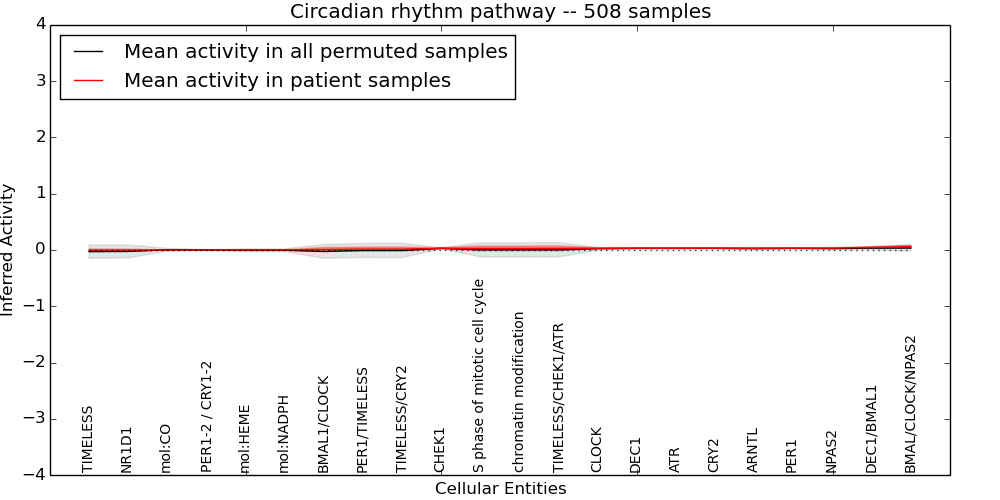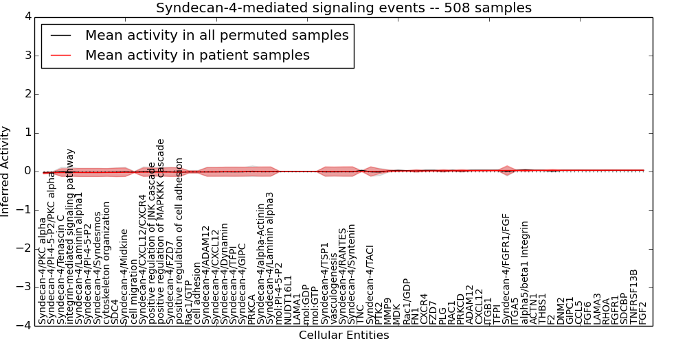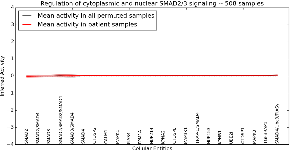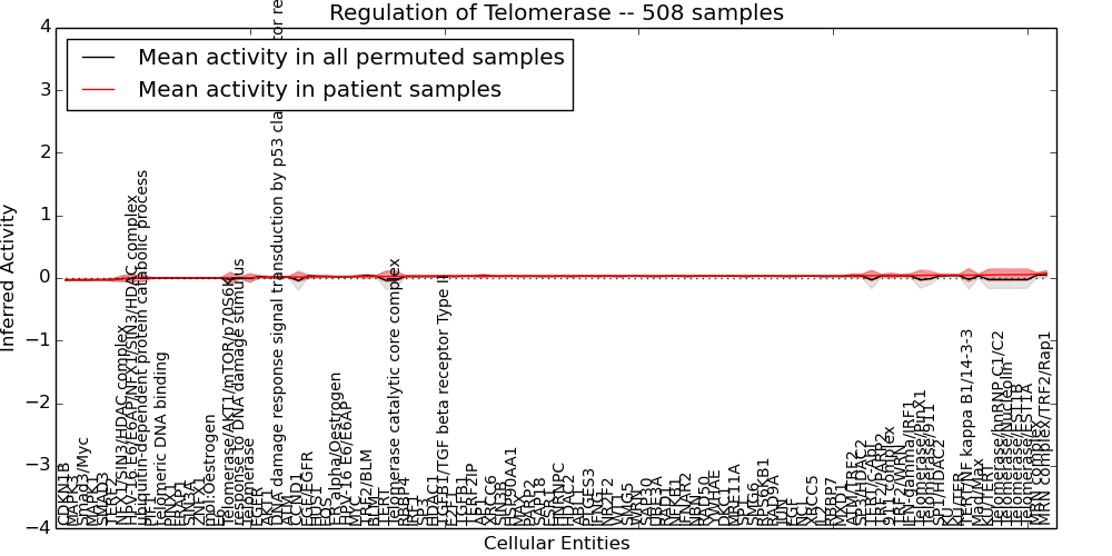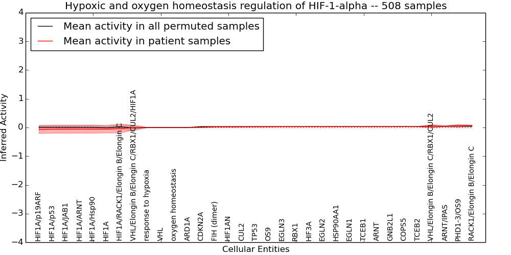Figure S130. Get High-res Image This plot shows pathway concept perturbations across all samples against a permutation model. The concepts along the x-axis are sorted by lowest to highest mean activity for the real patient samples. Mean inferred activities are plotted along the y-axis as a colored band showing the average level and one standard deviation range. Real samples are shown in red and permuted samples in black.