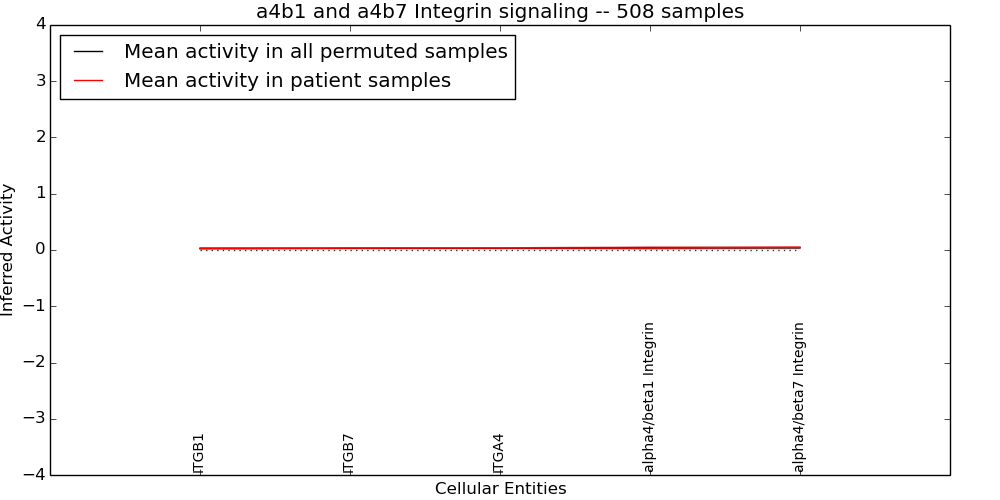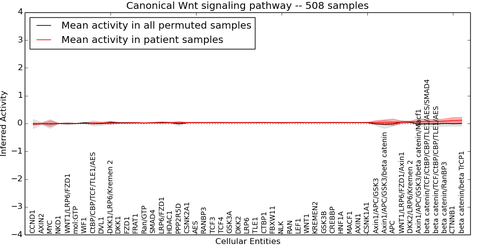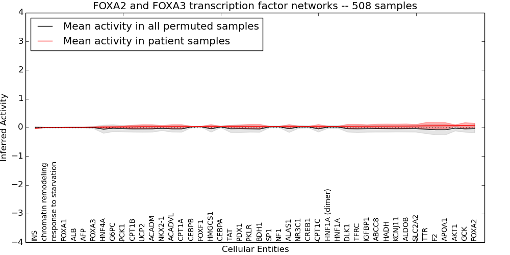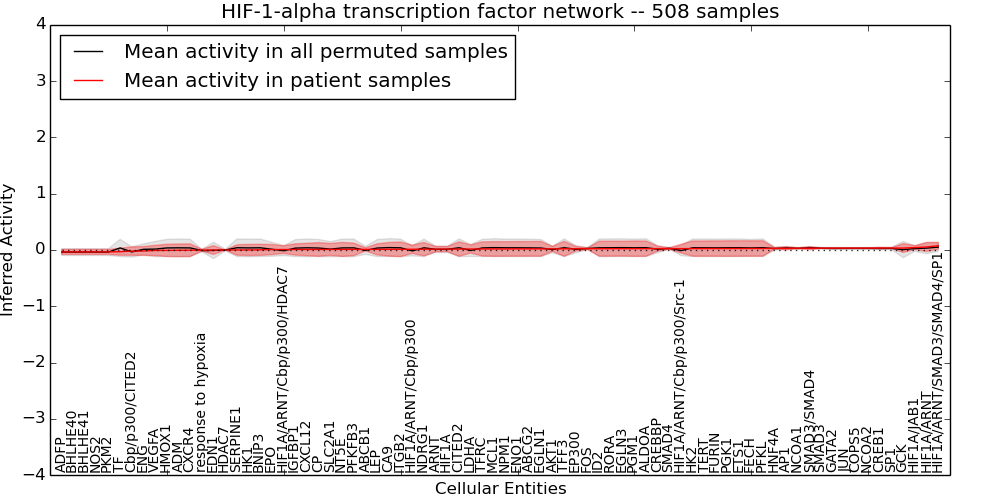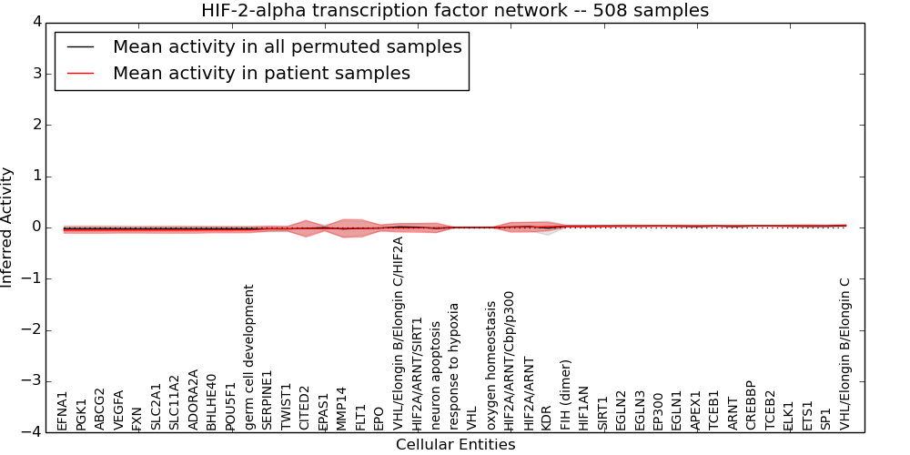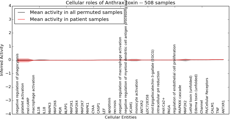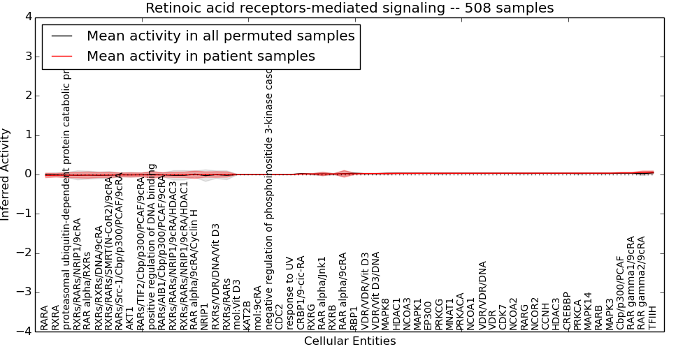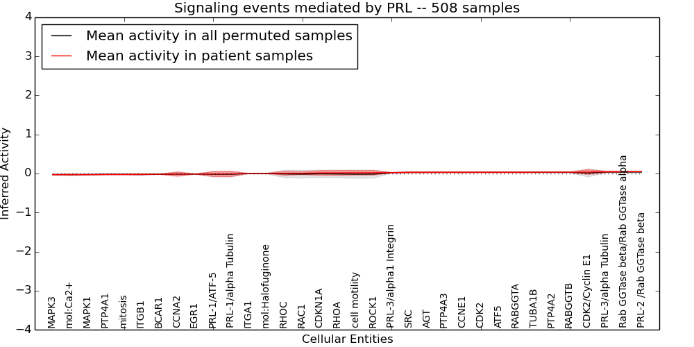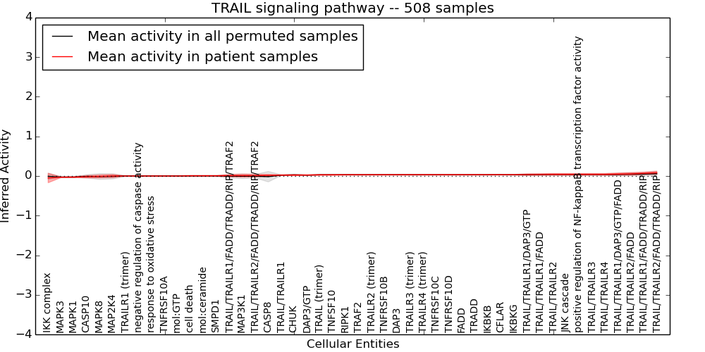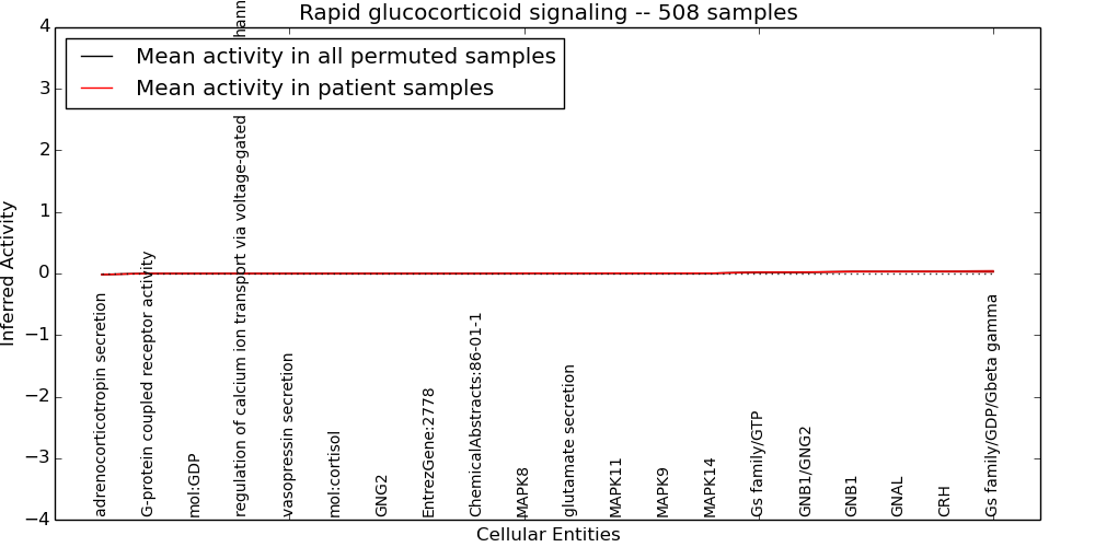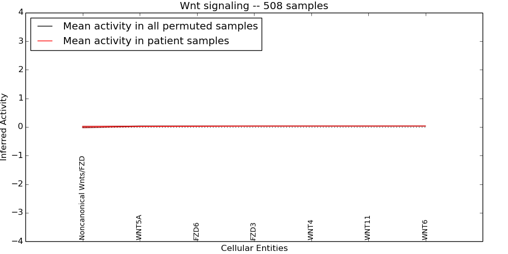 Figure S130. Get High-res Image This plot shows pathway concept perturbations across all samples against a permutation model. The concepts along the x-axis are sorted by lowest to highest mean activity for the real patient samples. Mean inferred activities are plotted along the y-axis as a colored band showing the average level and one standard deviation range. Real samples are shown in red and permuted samples in black.
