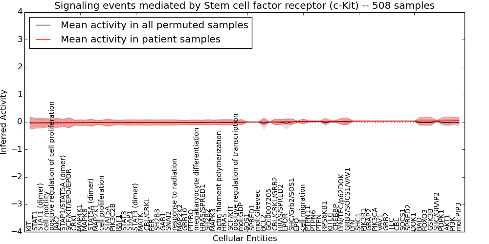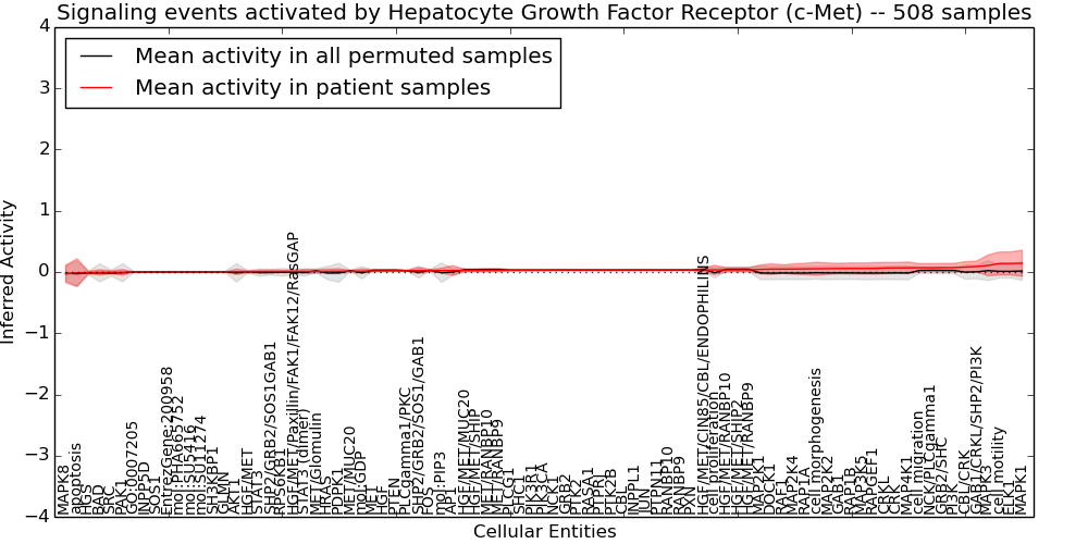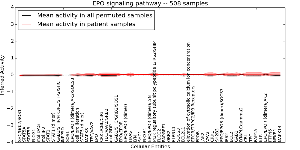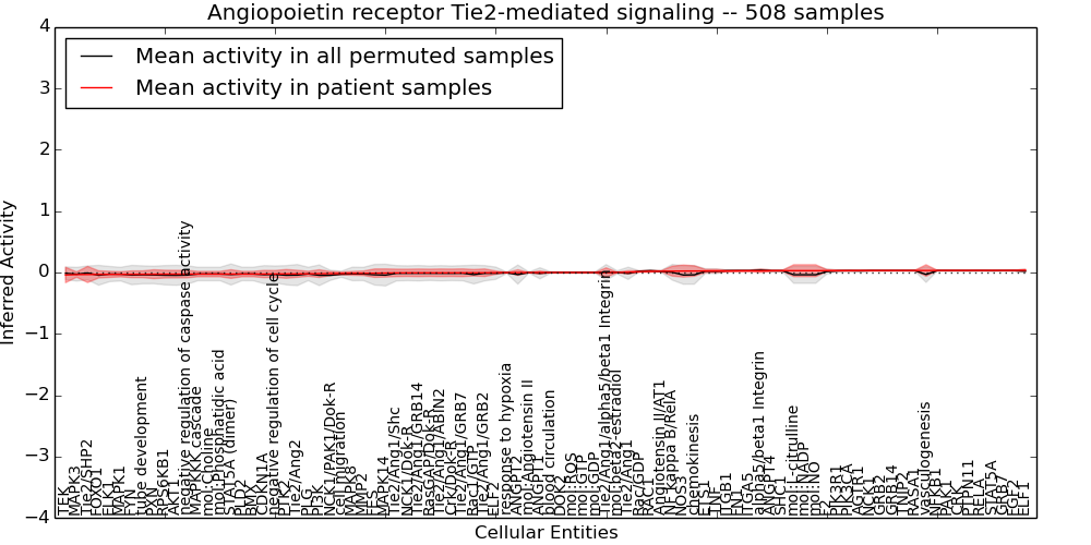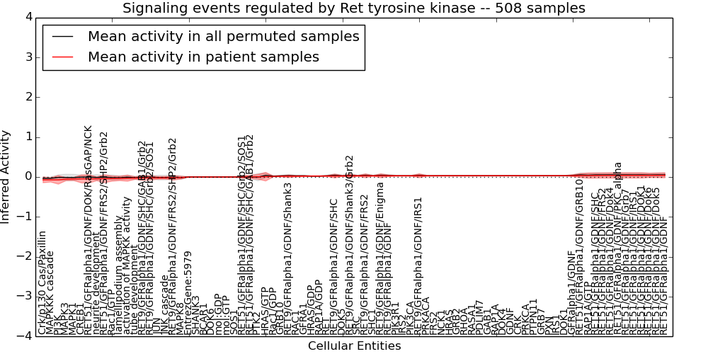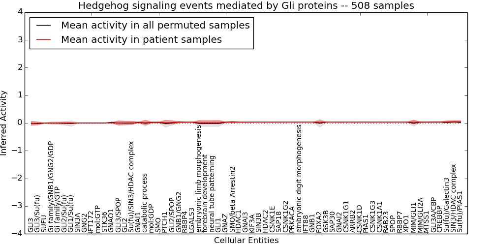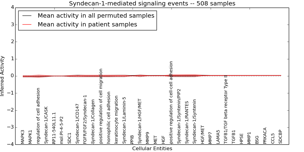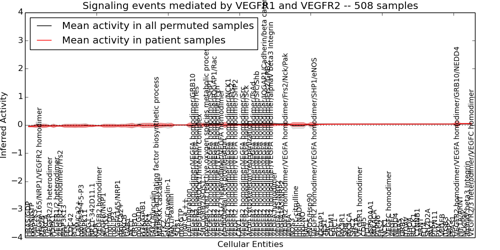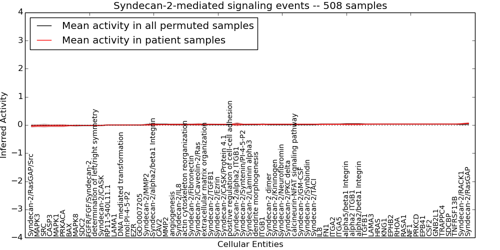 Figure S131. Get High-res Image This plot shows pathway concept perturbations across all samples against a permutation model. The concepts along the x-axis are sorted by lowest to highest mean activity for the real patient samples. Mean inferred activities are plotted along the y-axis as a colored band showing the average level and one standard deviation range. Real samples are shown in red and permuted samples in black.