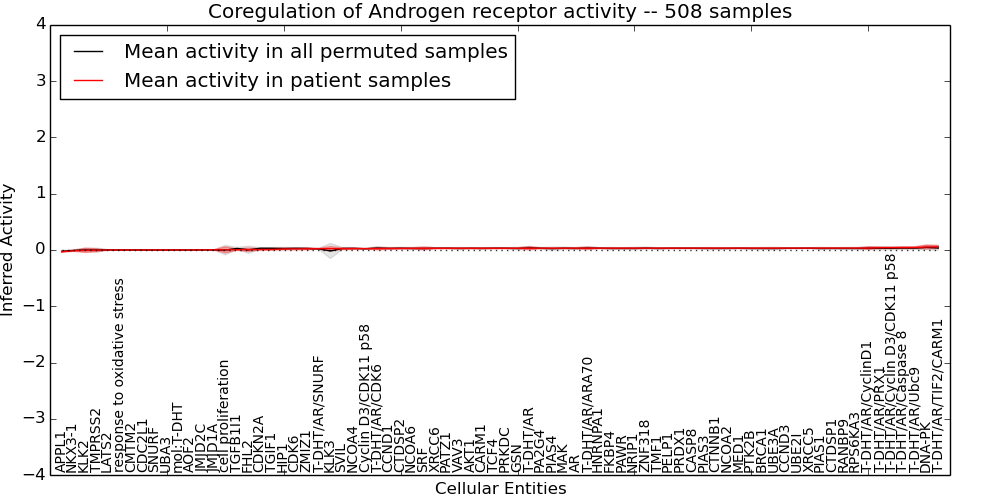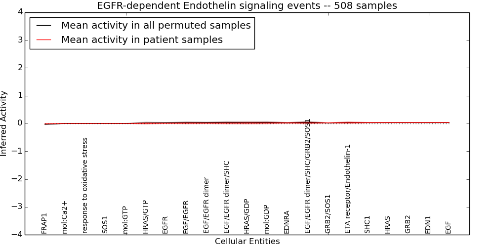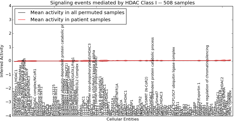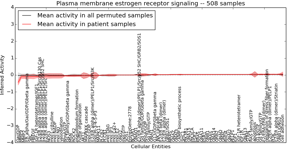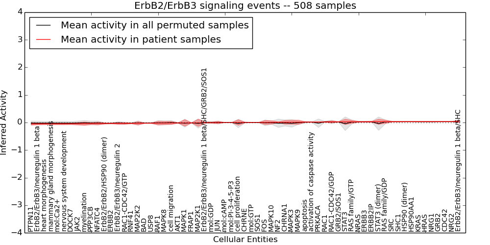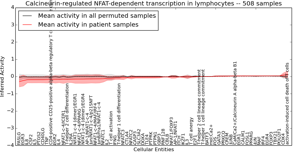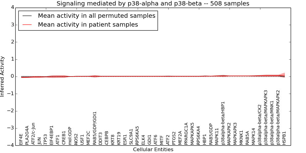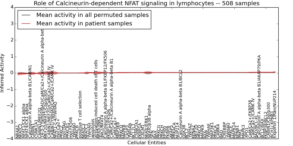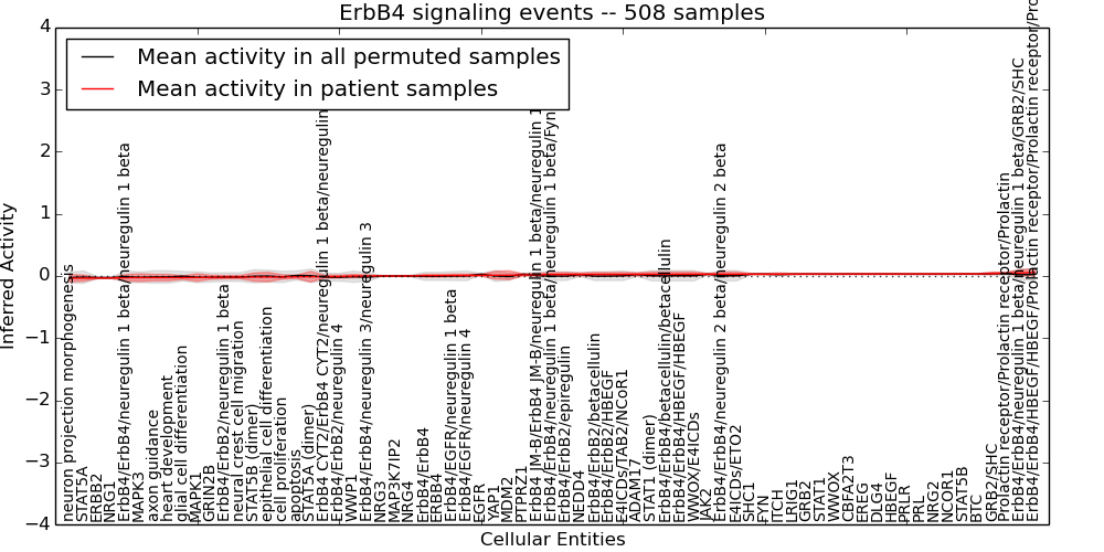 Figure S131. Get High-res Image This plot shows pathway concept perturbations across all samples against a permutation model. The concepts along the x-axis are sorted by lowest to highest mean activity for the real patient samples. Mean inferred activities are plotted along the y-axis as a colored band showing the average level and one standard deviation range. Real samples are shown in red and permuted samples in black.