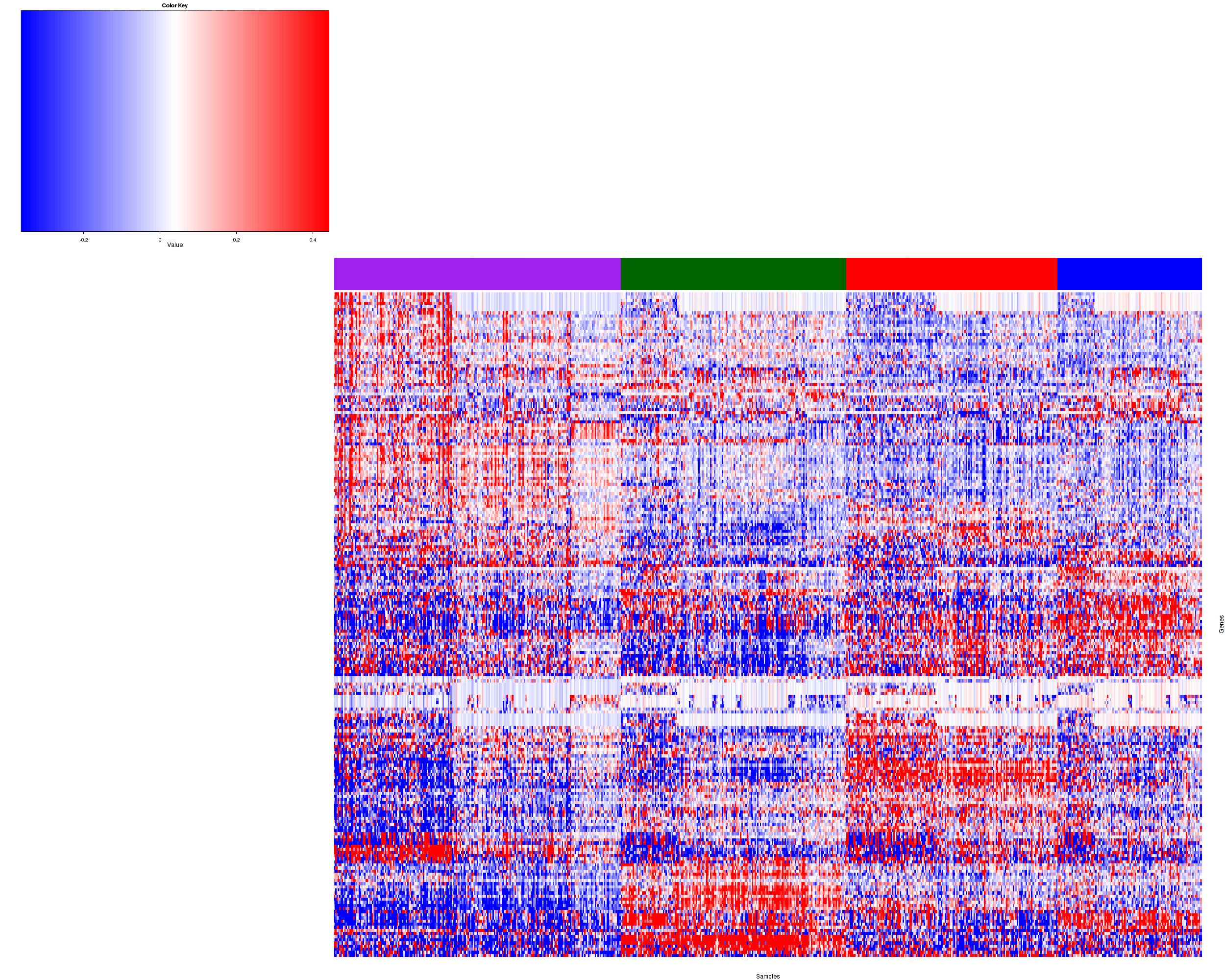 Figure 1. Get High-res Image Samples were separated into 4 clusters. Shown are 662 samples and 584 marker proteins. The color bar of the row indicates the marker proteins for the corresponding cluster.