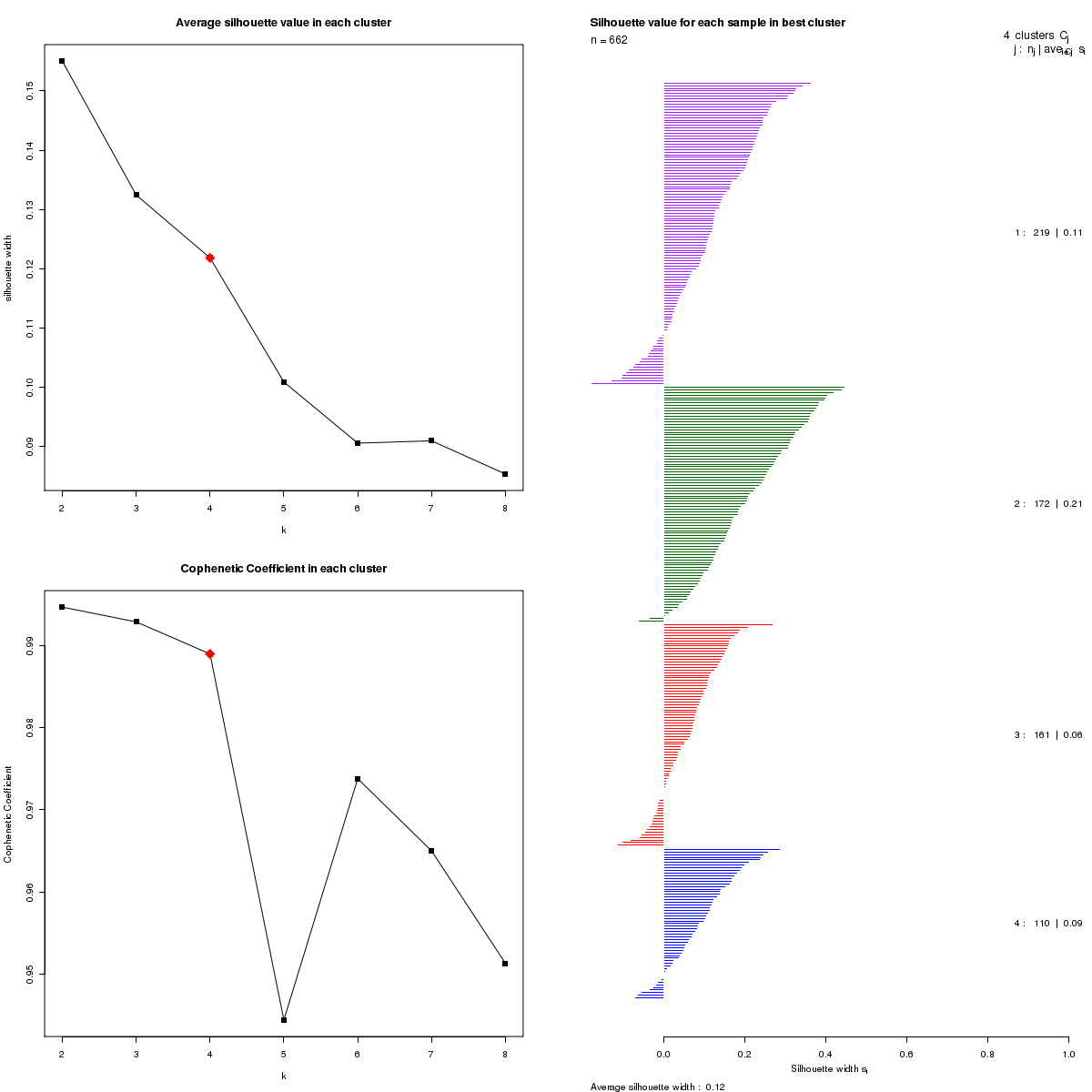 Figure 3. Get High-res Image The silhouette width was calculated for each sample and each value of k. The left upper panel shows the average silhouette width across all samples for each tested k (left upper panel). The left lower panel shows the Cophenetic Correlation Coefficients for each tested k. The right panel shows assignments of clusters to samples and the silhouette width of each sample for the most robust clustering.