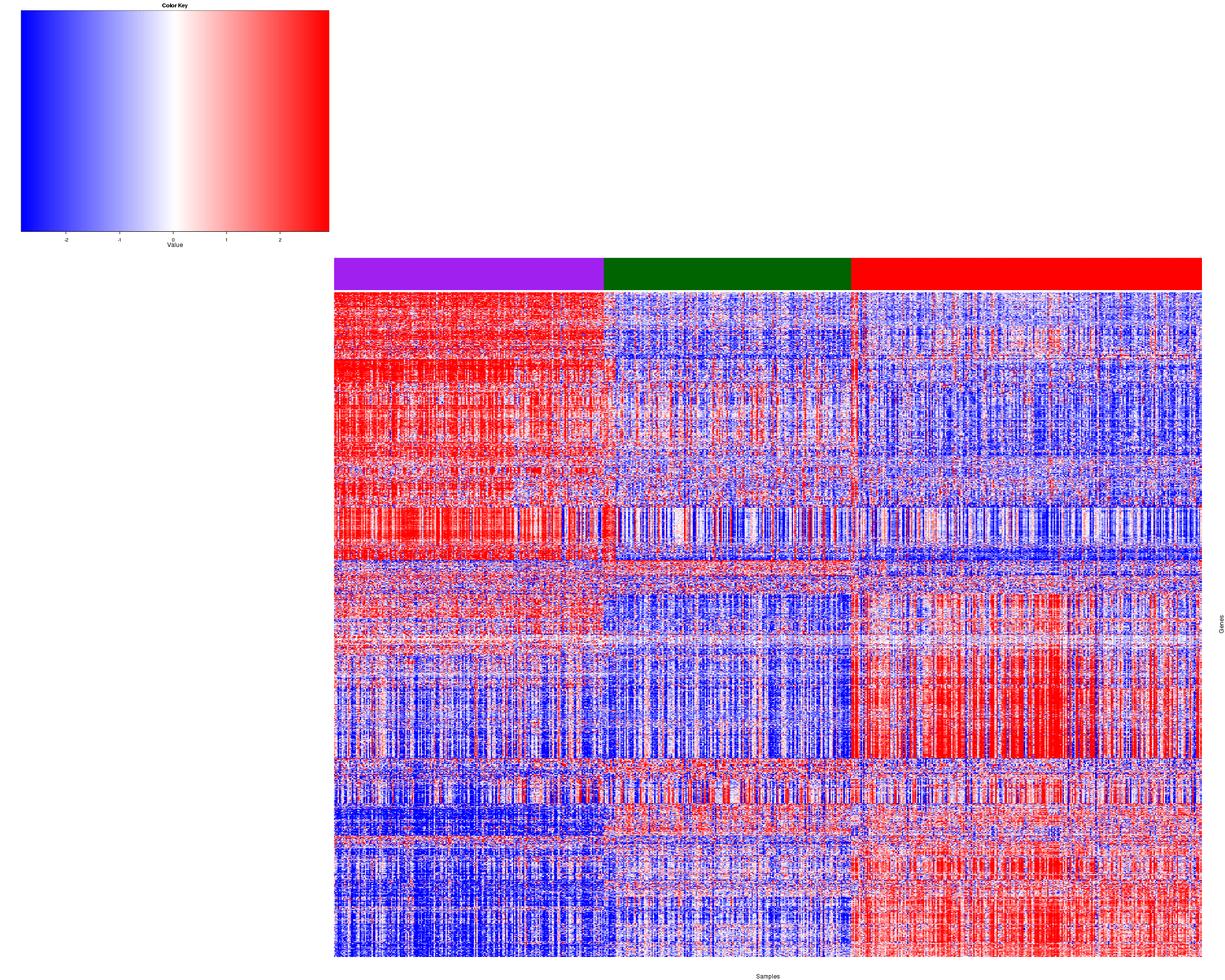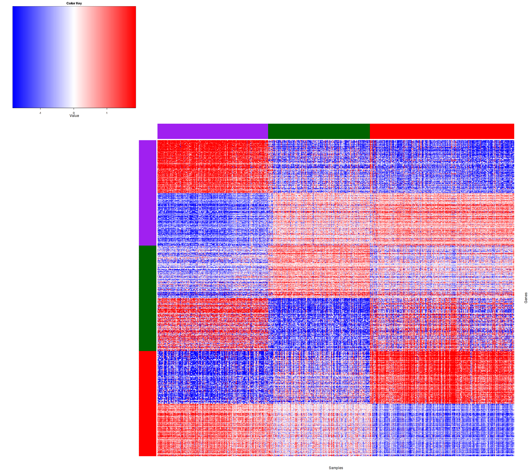 Figure 1. Get High-res Image Samples were separated into 3 clusters. Shown are 669 samples and 900 marker genes. The color bar of the row indicates the marker genes for the corresponding cluster.