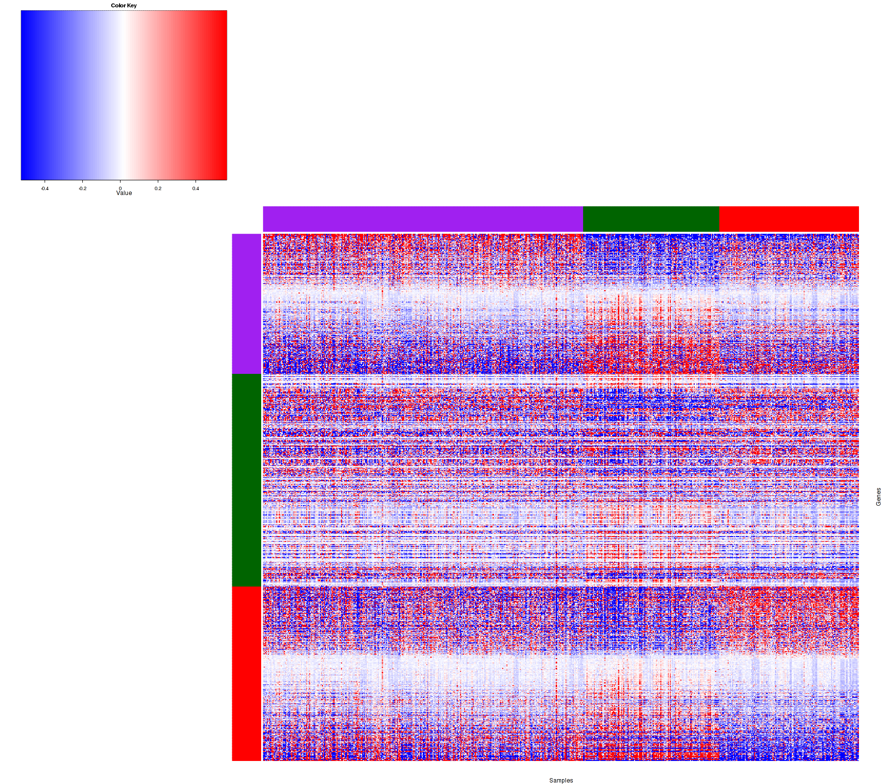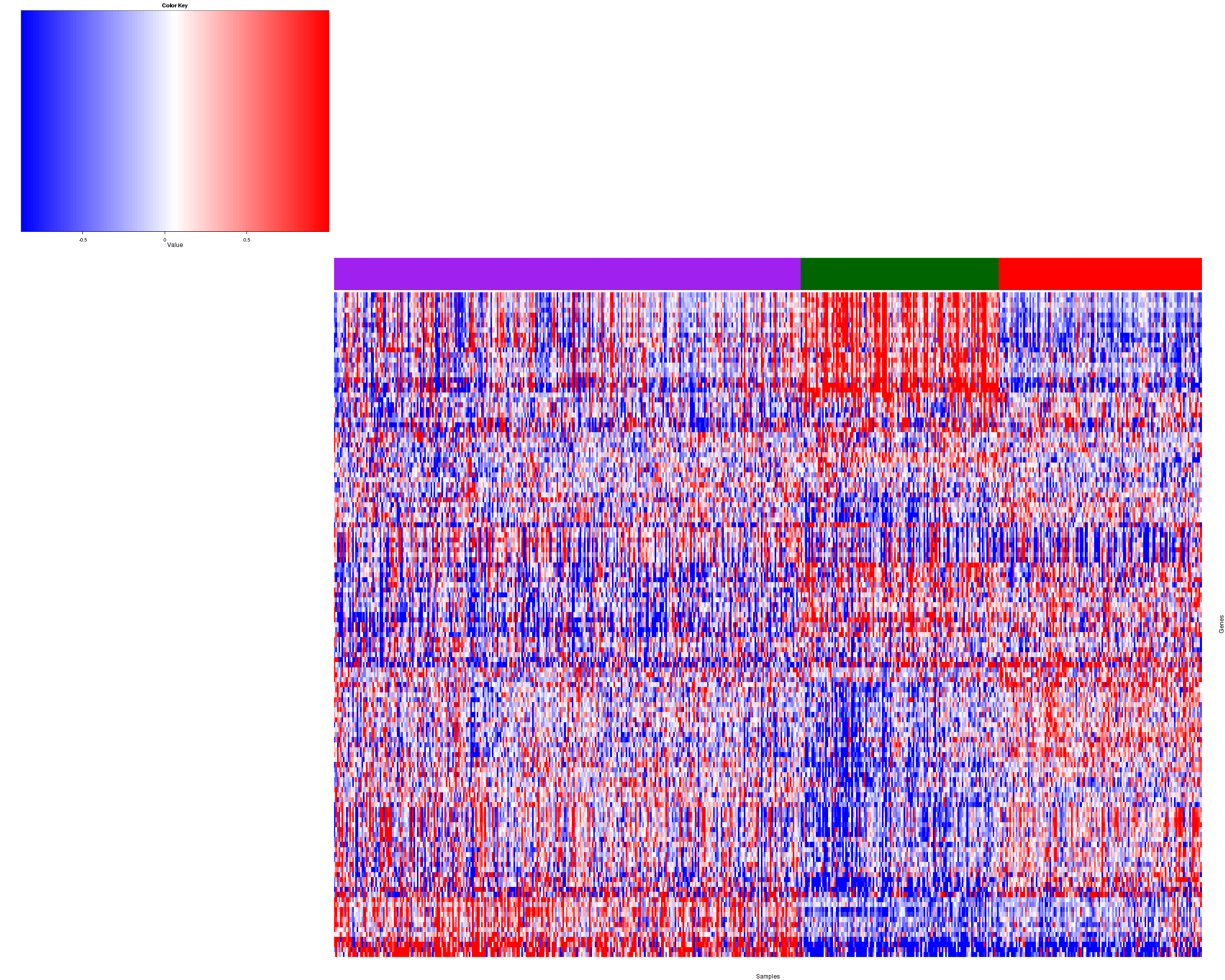Figure 1. Get High-res Image Samples were separated into 3 clusters. Shown are 565 samples and 890 marker miRs. The color bar of the row indicates the marker miRs for the corresponding cluster.