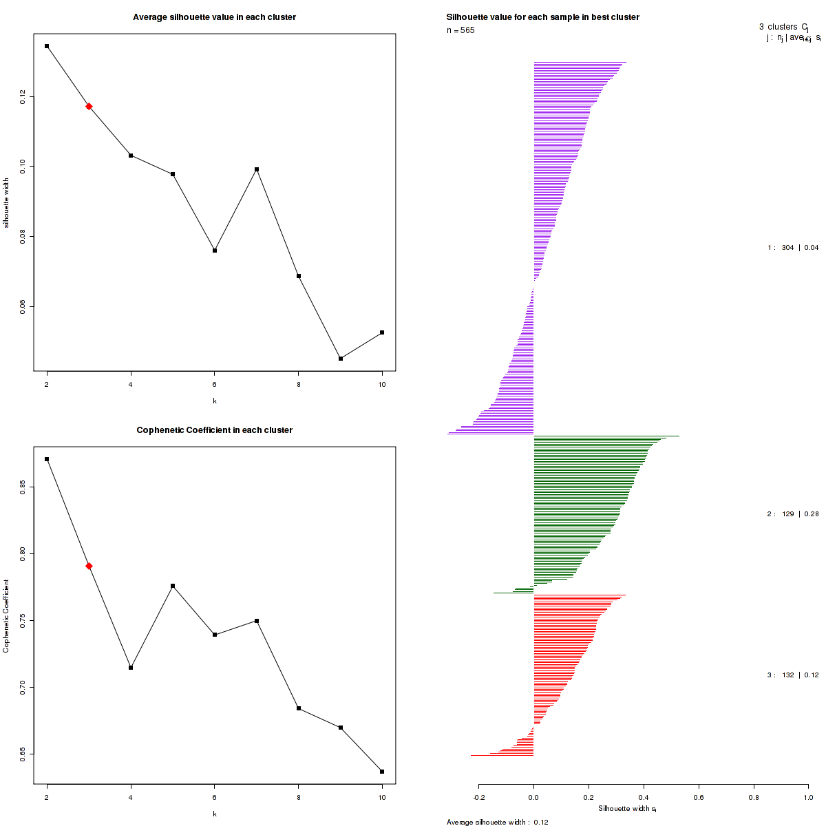 Figure 3. Get High-res Image The silhouette width was calculated for each sample and each value of k. The left upper panel shows the average silhouette width across all samples for each tested k (left upper panel). The left lower panel shows the Cophenetic Correlation Coefficients for each tested k. The right panel shows assignments of clusters to samples and the k silhouette width of each sample for the most robust clustering.