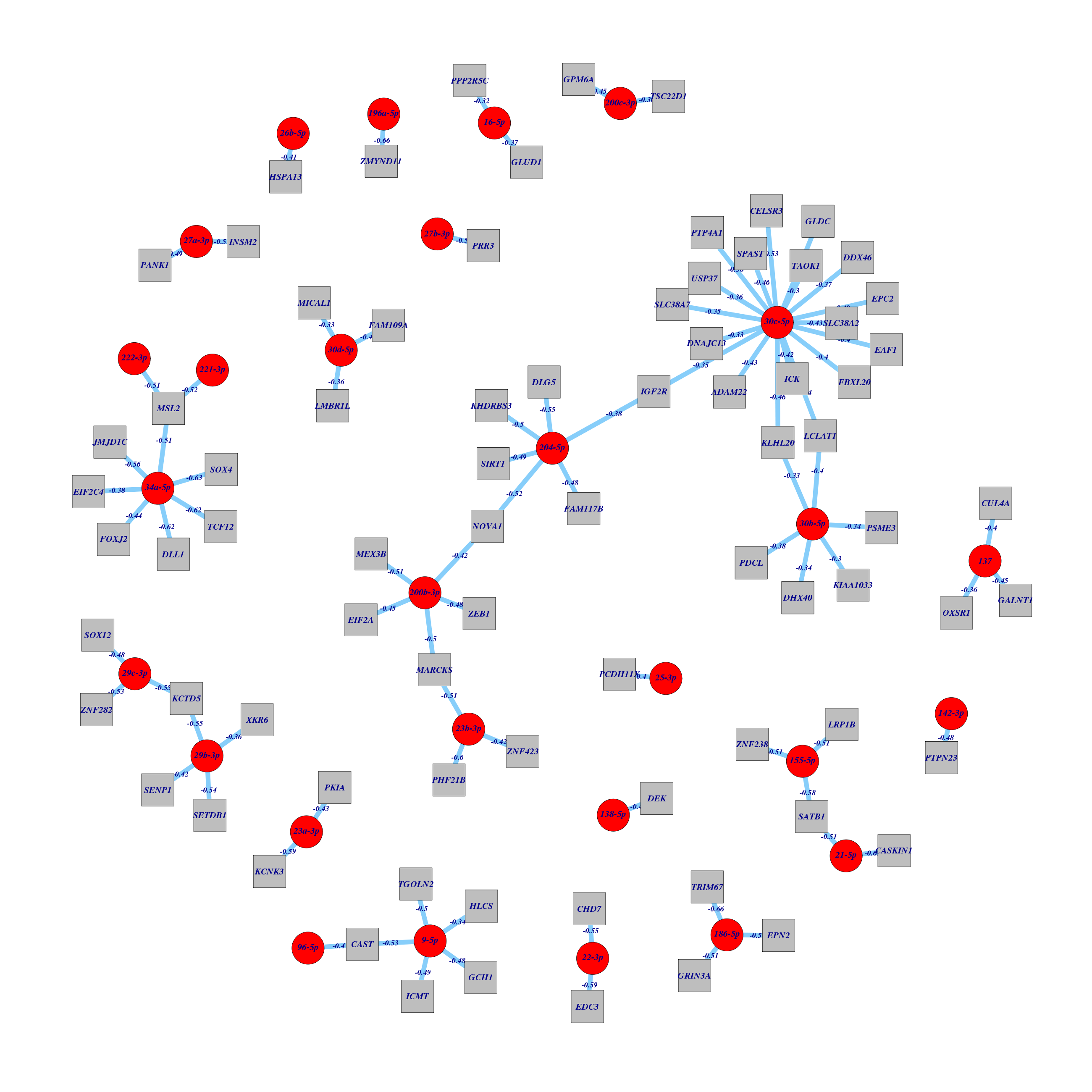 Figure 1. Get High-res Image All miR hubs with their strong anti-correlated genes and predicted interactions in three sequence prediction databases.